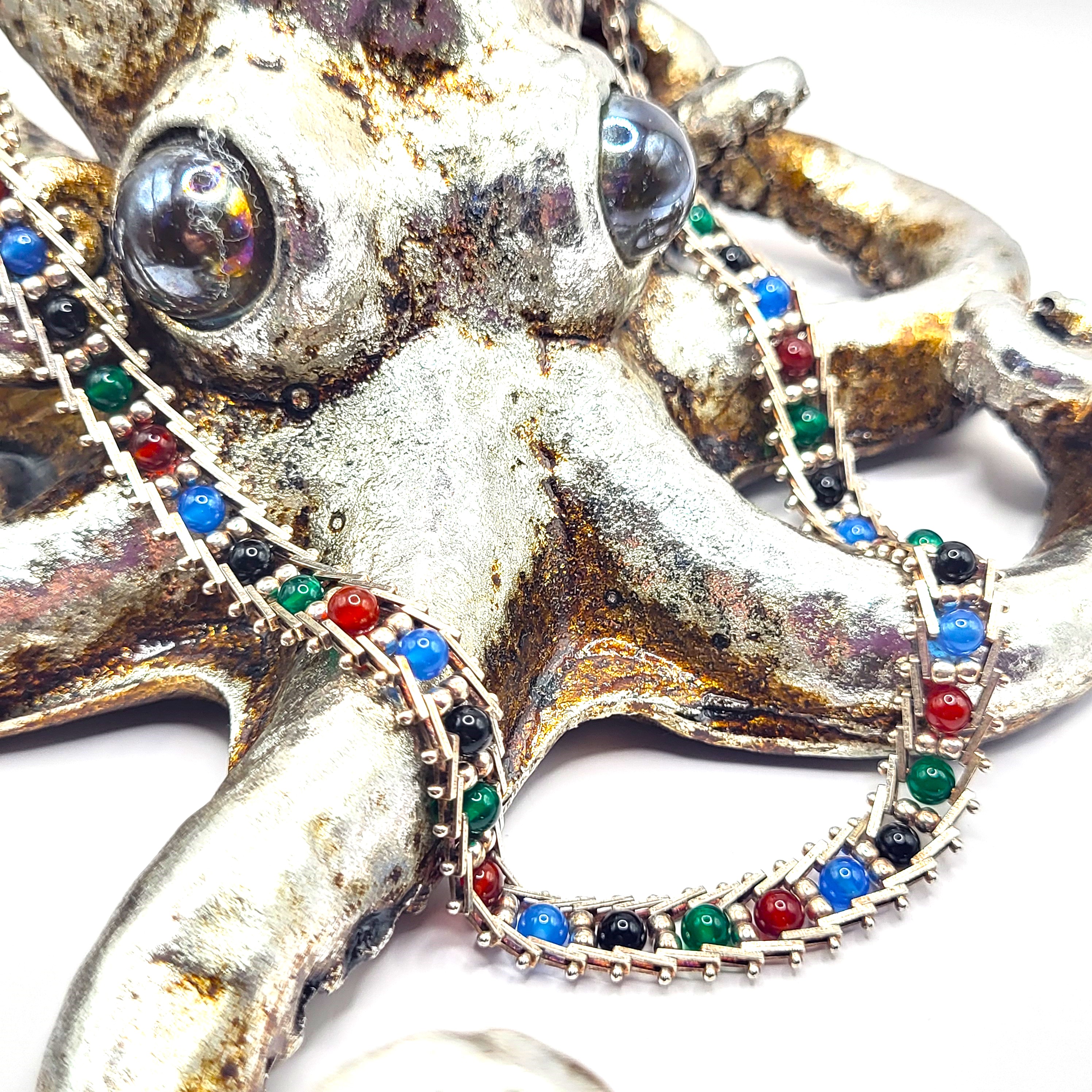 This sterling silver necklace displays an array of colors in onyx: black, red, green, and blue. The onyx beads are approximately 4.25mm in the center of each riveted link, separated by 2.5mm beads. The necklace is approximately 17" long and 9.75mm wide, with a lobster clasp. The Milor hallmark is on one of the end caps. Admin: 33120/24lr