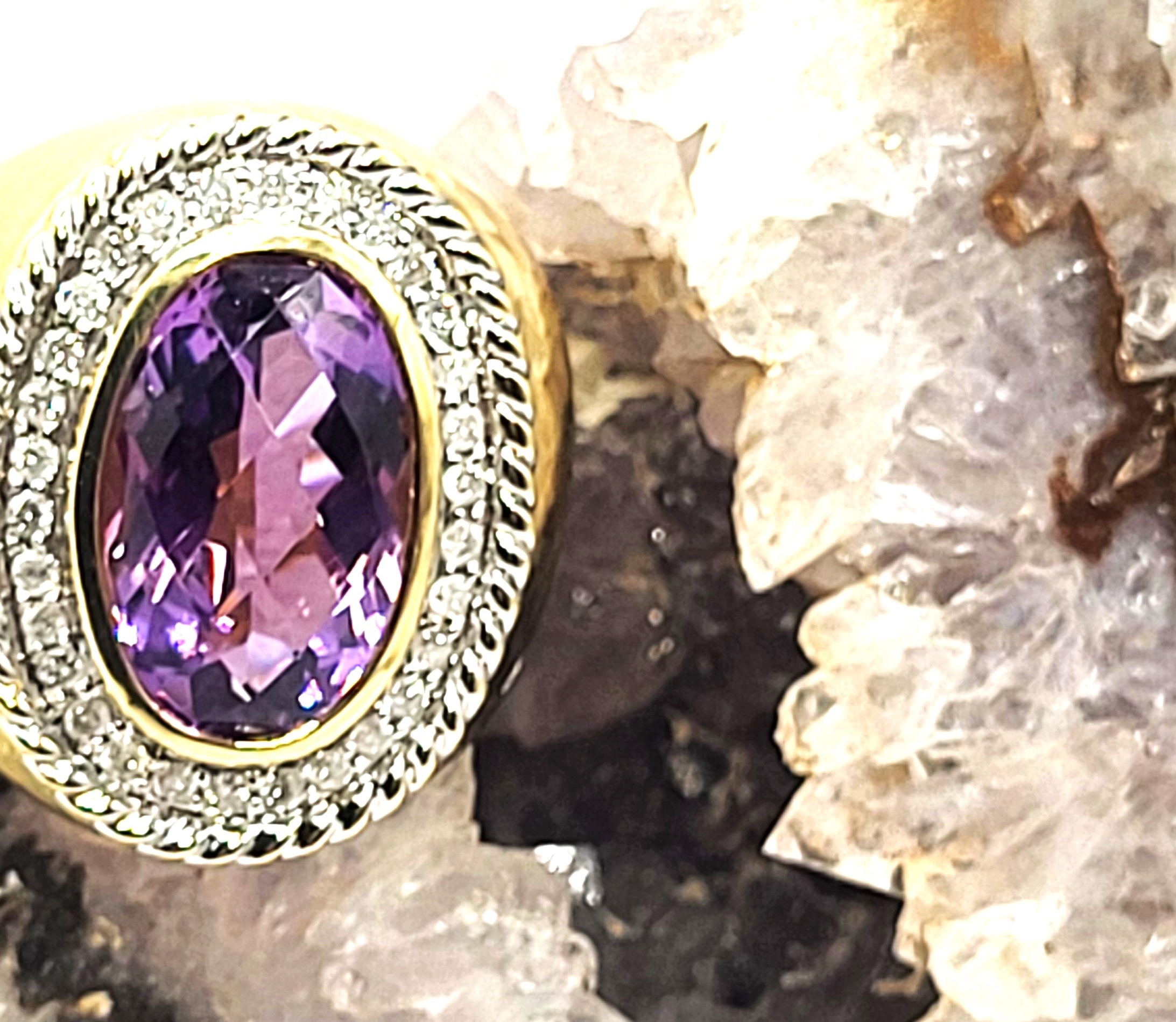 This 14 karat yellow gold ring features an approximate 8.00, carat top-faceted amethyst with wide polished shoulders twisted rope frame . The top of the ring is approximately 1 1/8" along the top of the finger and has a supportive gallery. The shank is approximately 5.5mm. This ring is US size 8 and can be sized for an additional charge. Please contact Bidfair Fine Jewelry for sizing details. Admin:33109/17eal