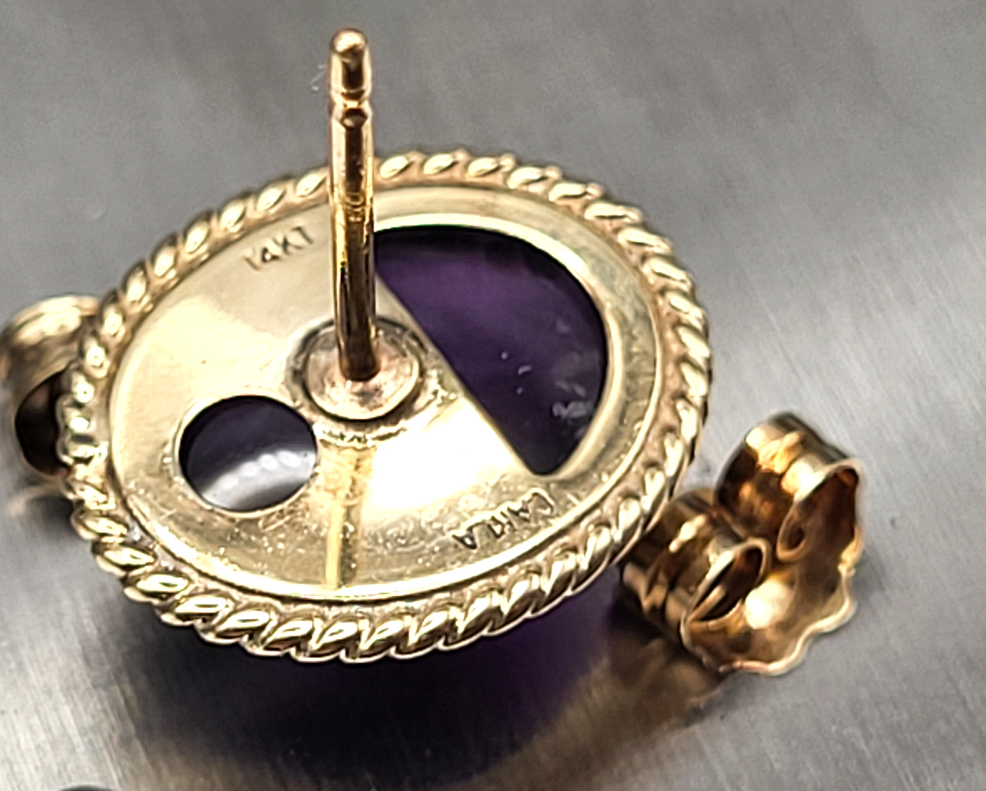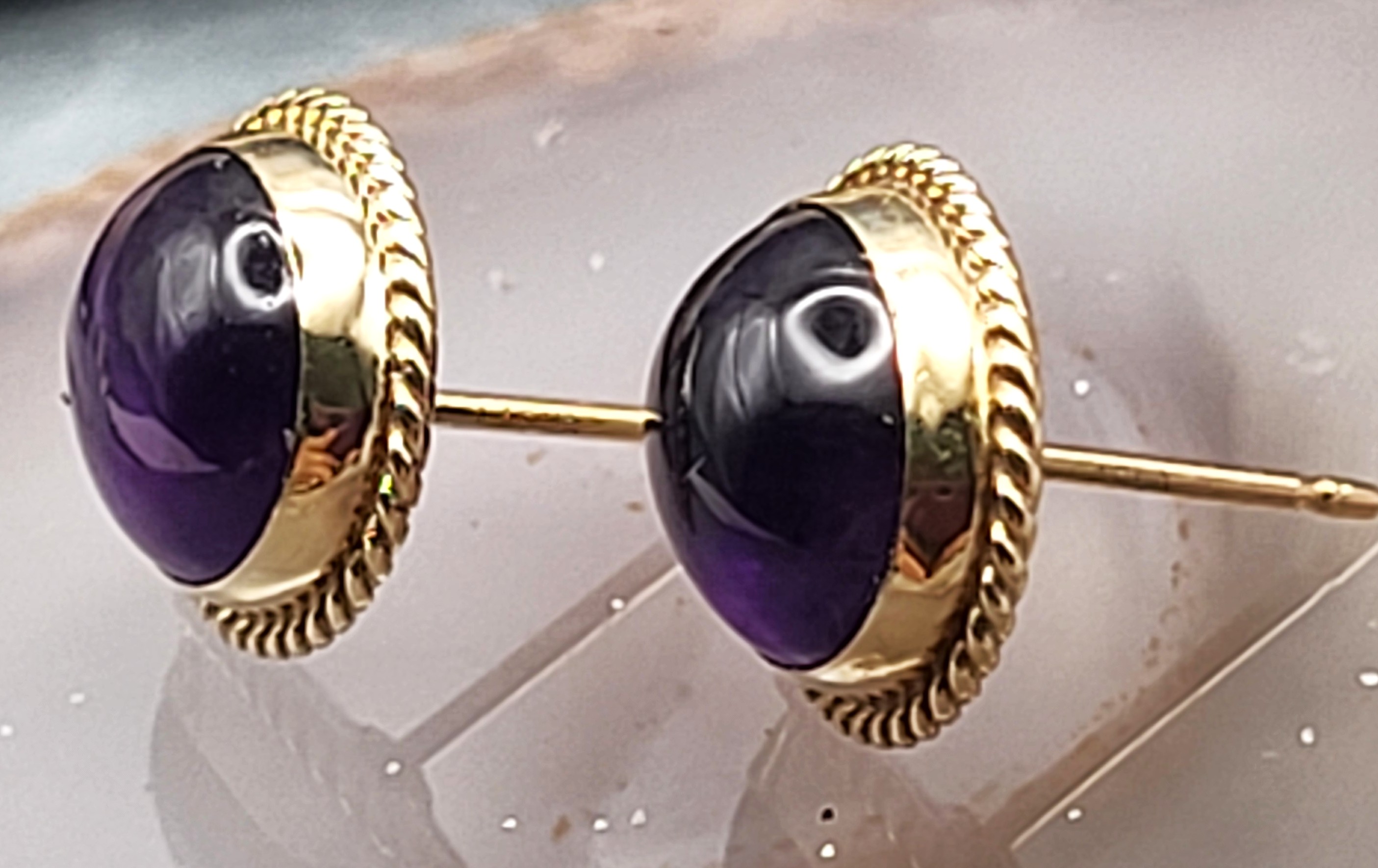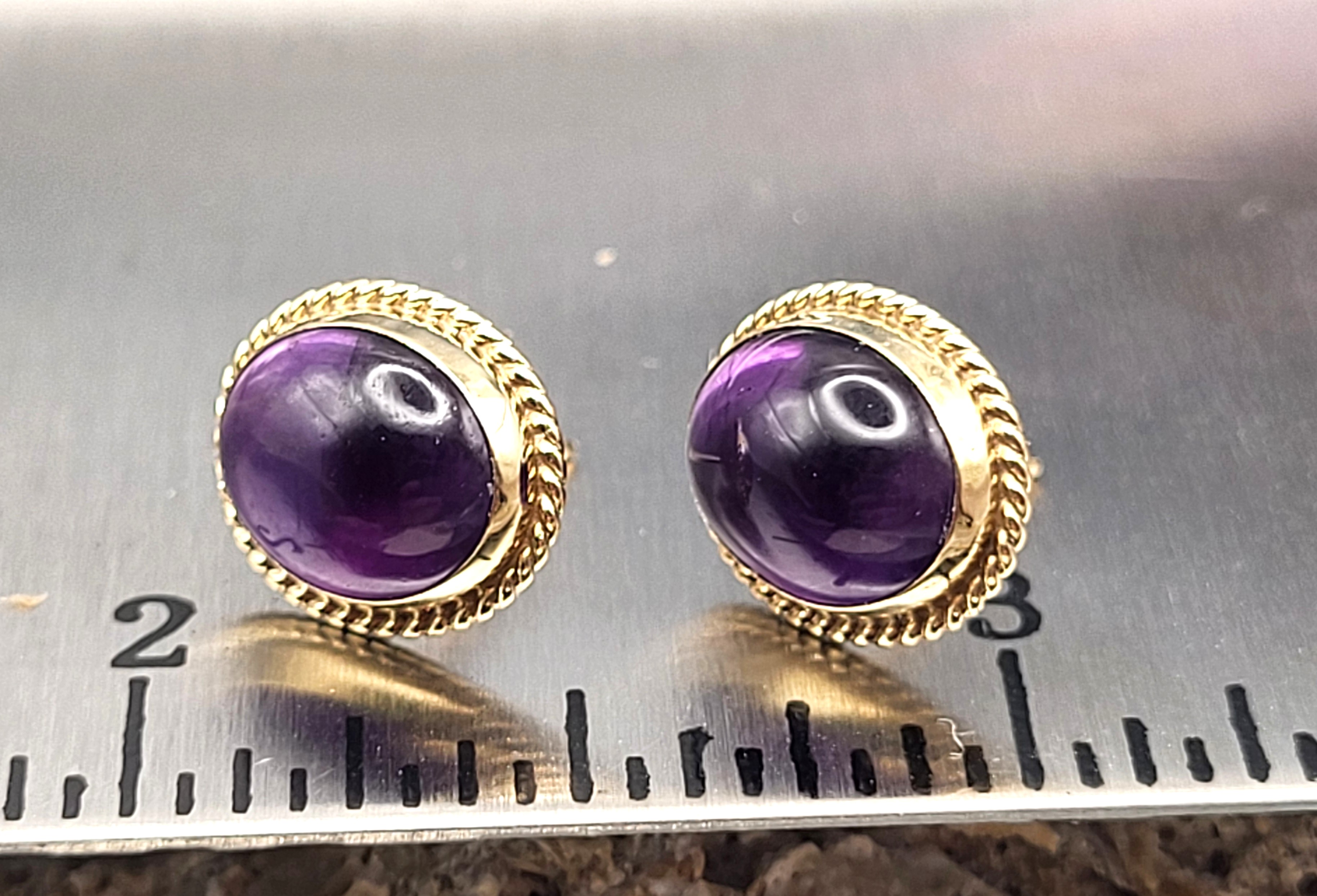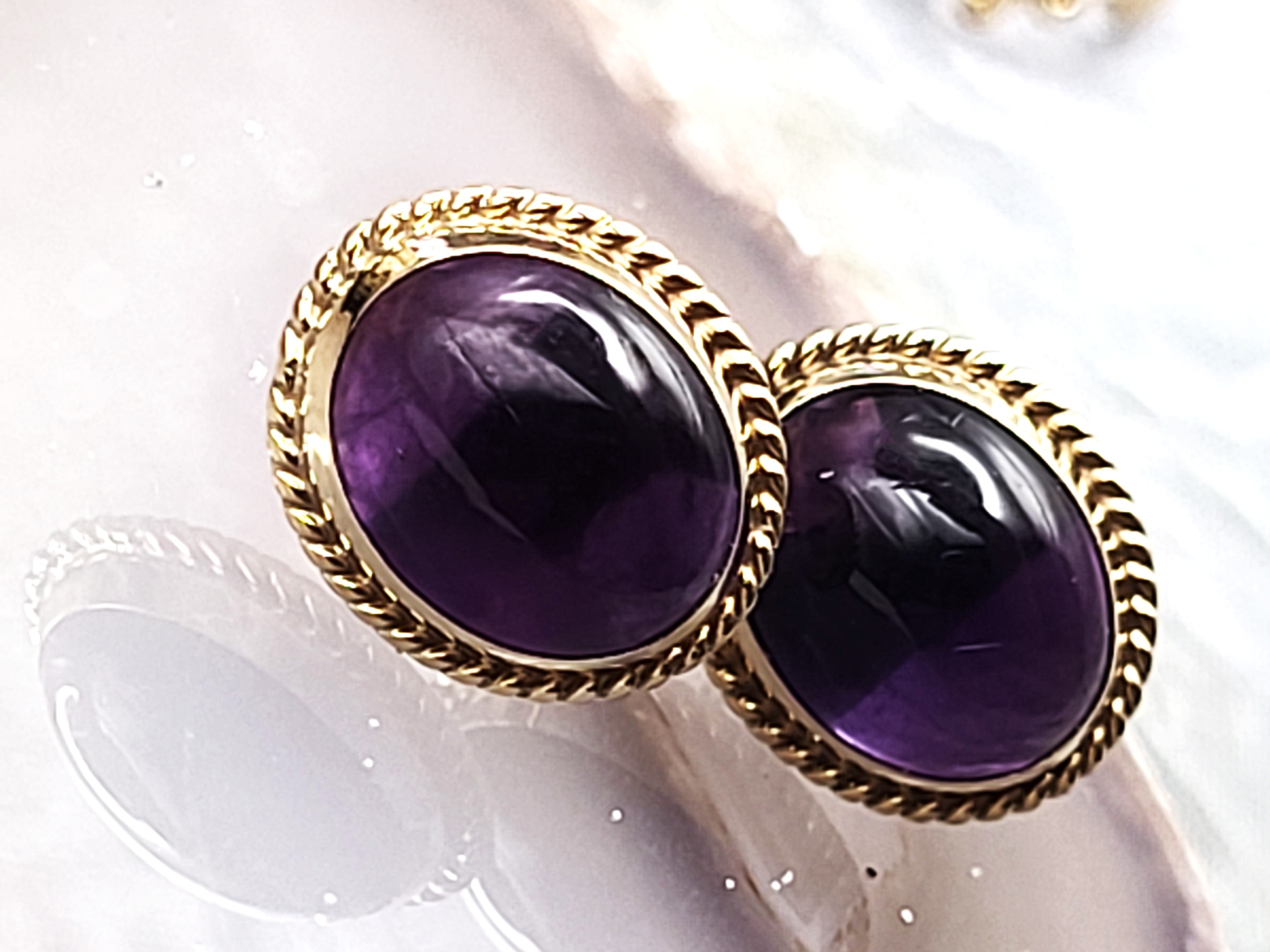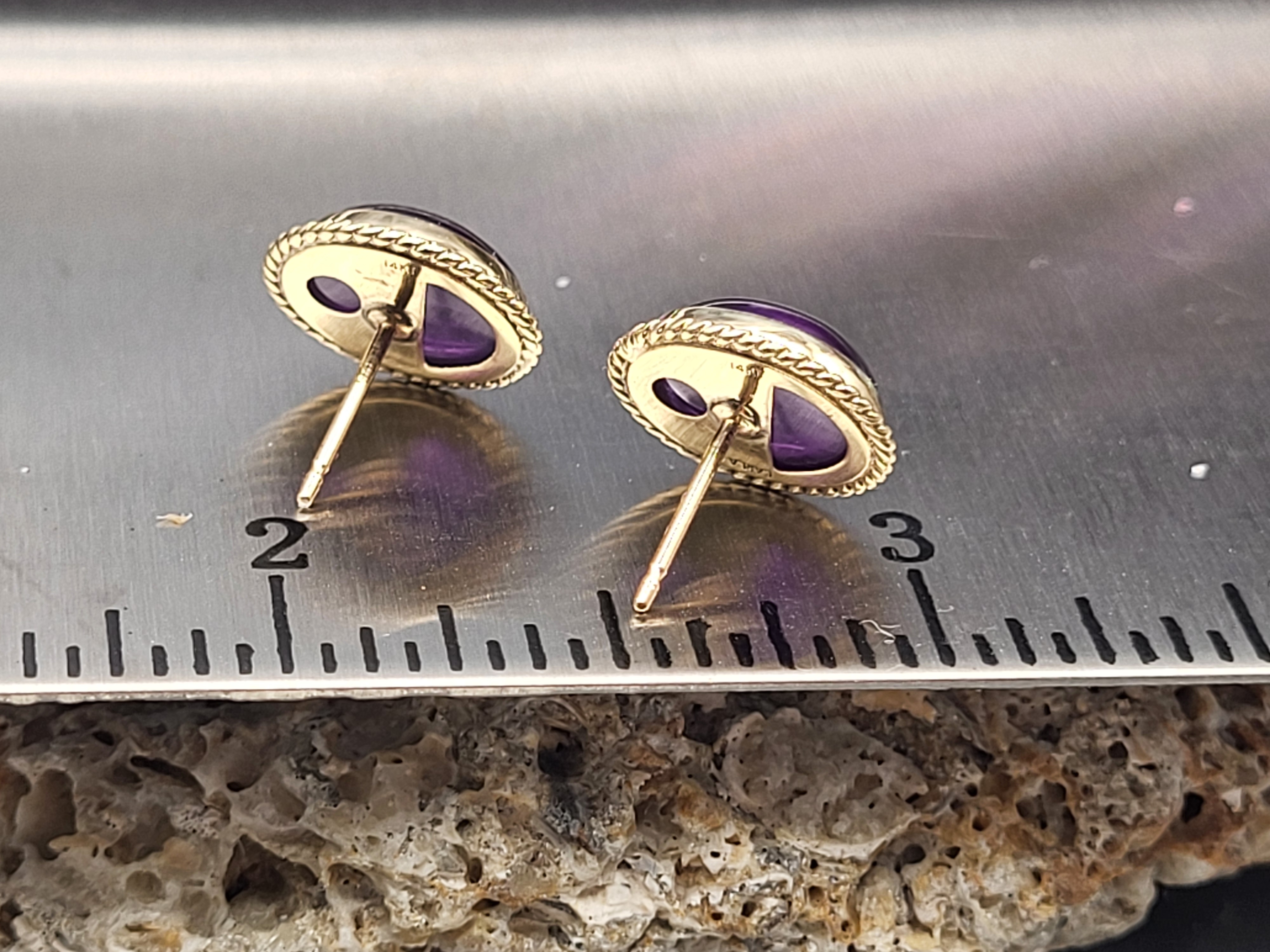 This pair of 14 karat yellow gold earrings features approximately 5.00 carats total weight of polished, oval cabochon, genuine amethysts bezel set with a twisted rope frame. The earrings are approximately 1/2" x 3/8" and attach to the earlobe with posts and friction backs.