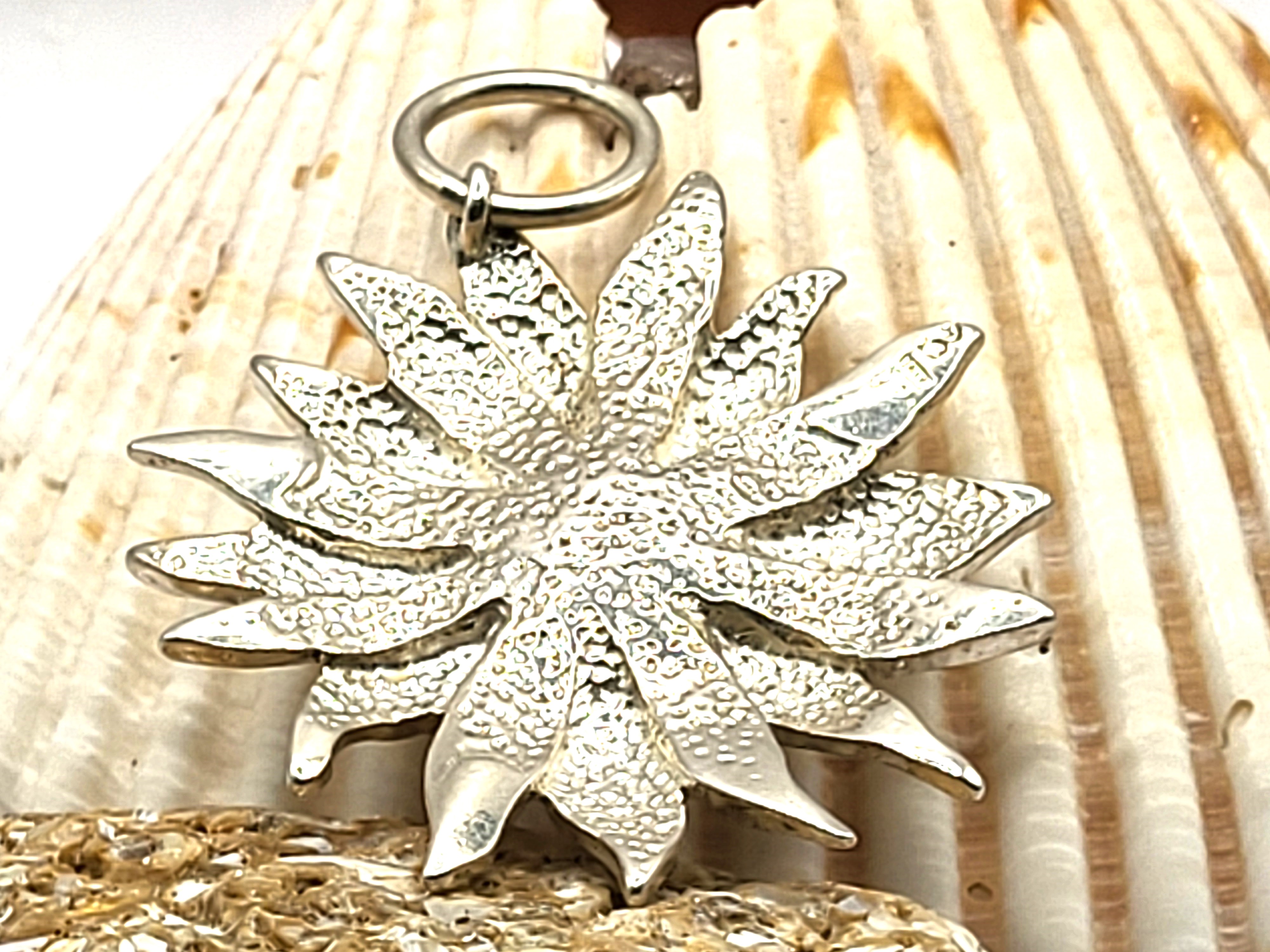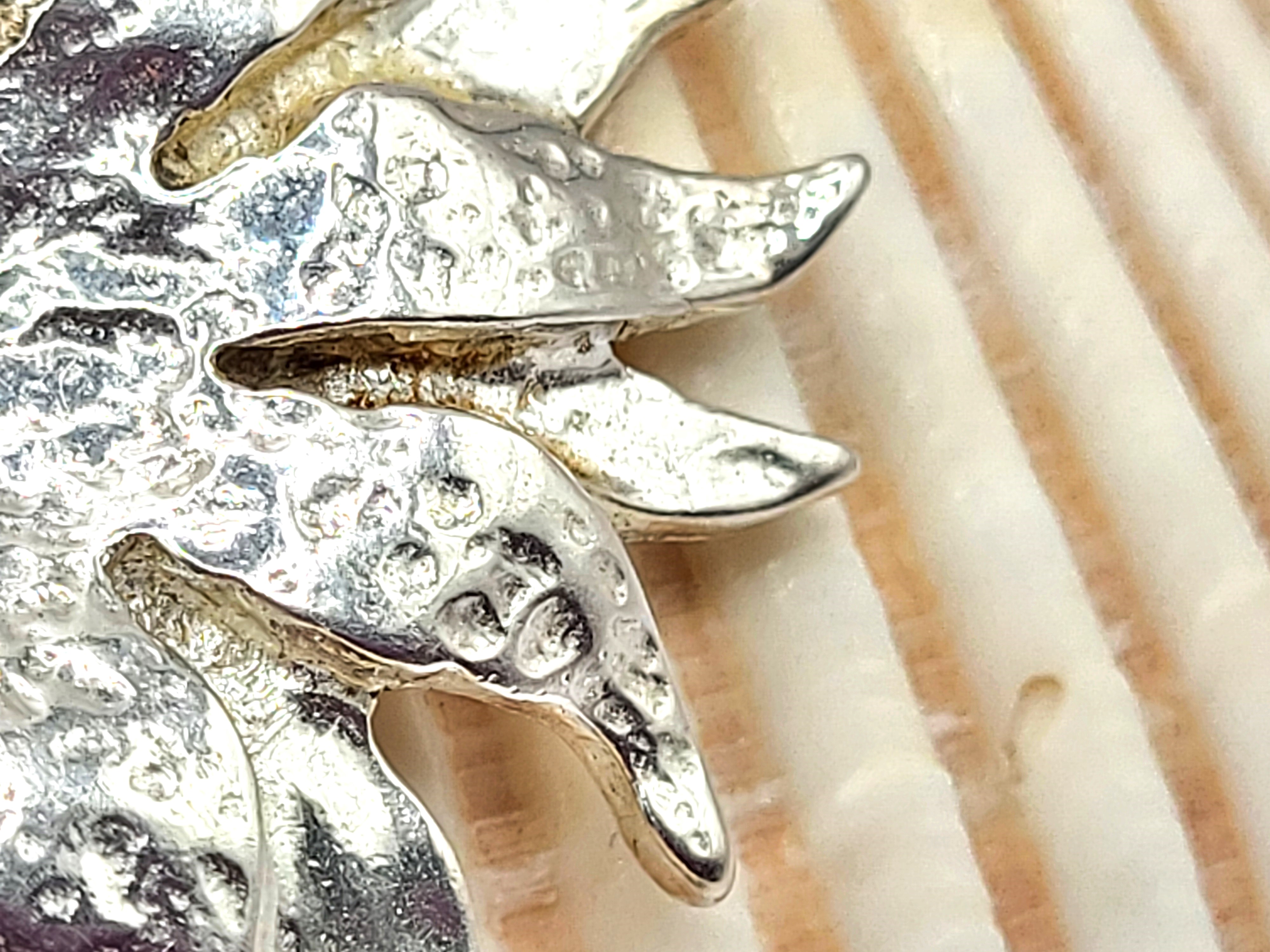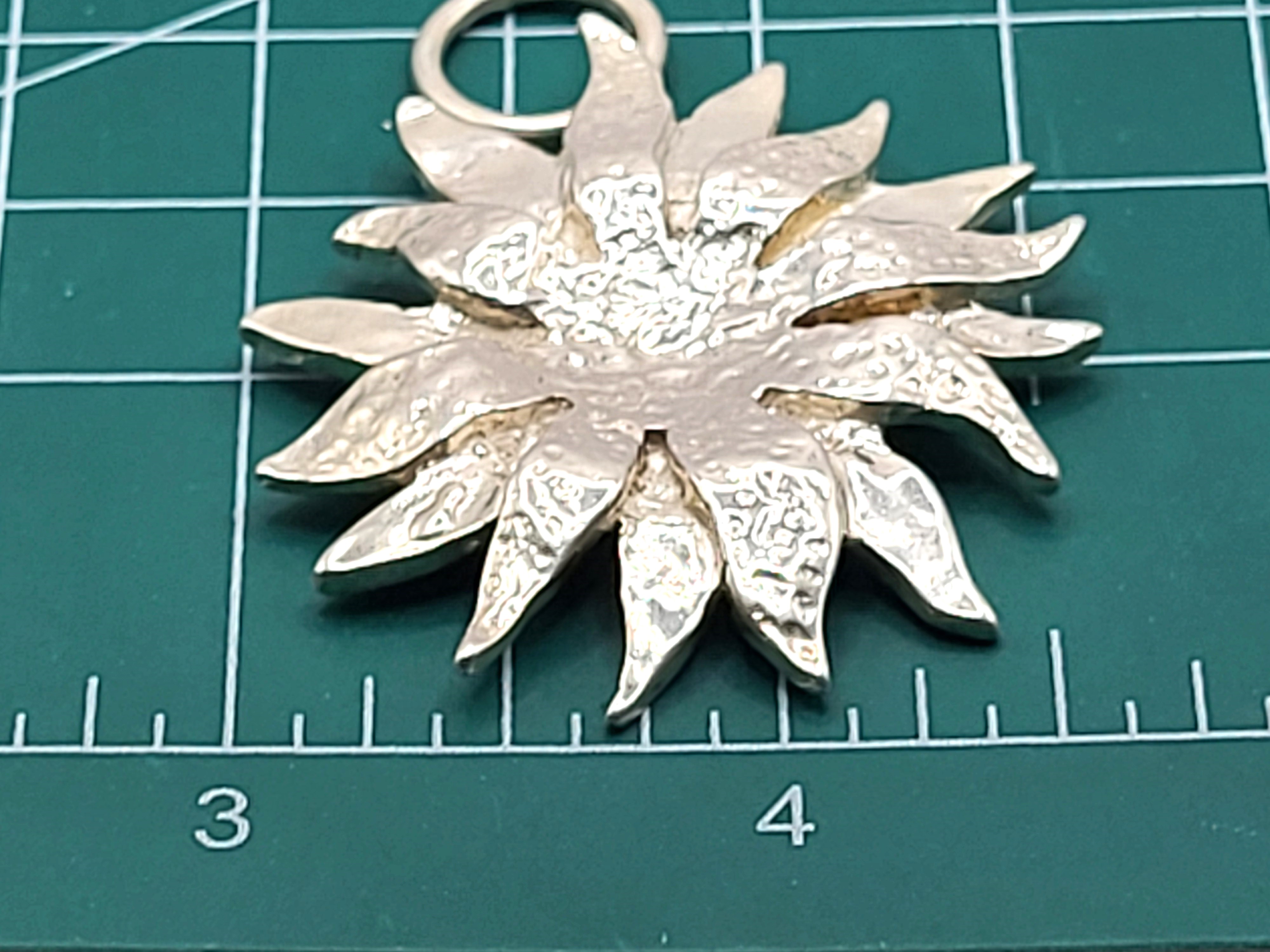 This is a beautiful sterling silver (.925) pendant, depicting a sunflower with full petals in the wind. The pendant is approximately 1.75" diameter and is dimensional with textured and polished rays. The pendant has a large jump ring. The hallmark is located at the end of one of the petals, and appears to be a "swan". Admin: KF3312/16hhh