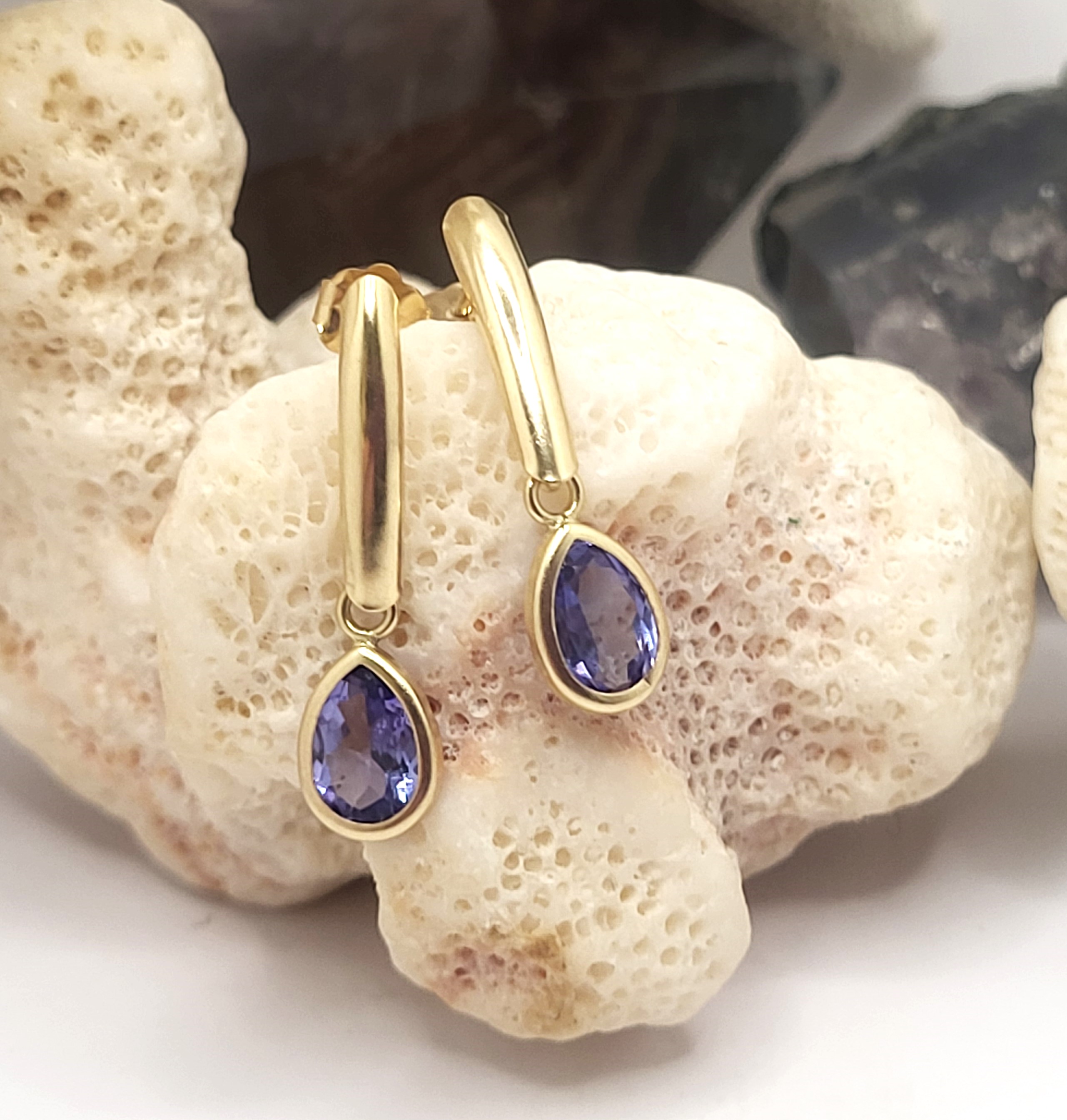 This pair of casually elegant earrings has 1.30 carats total weight of pear-cut, genuine tanzanite and hang approximately 7/8" . They attach to the earlobe with posts and friction backs. Admin: G11241/31lrt