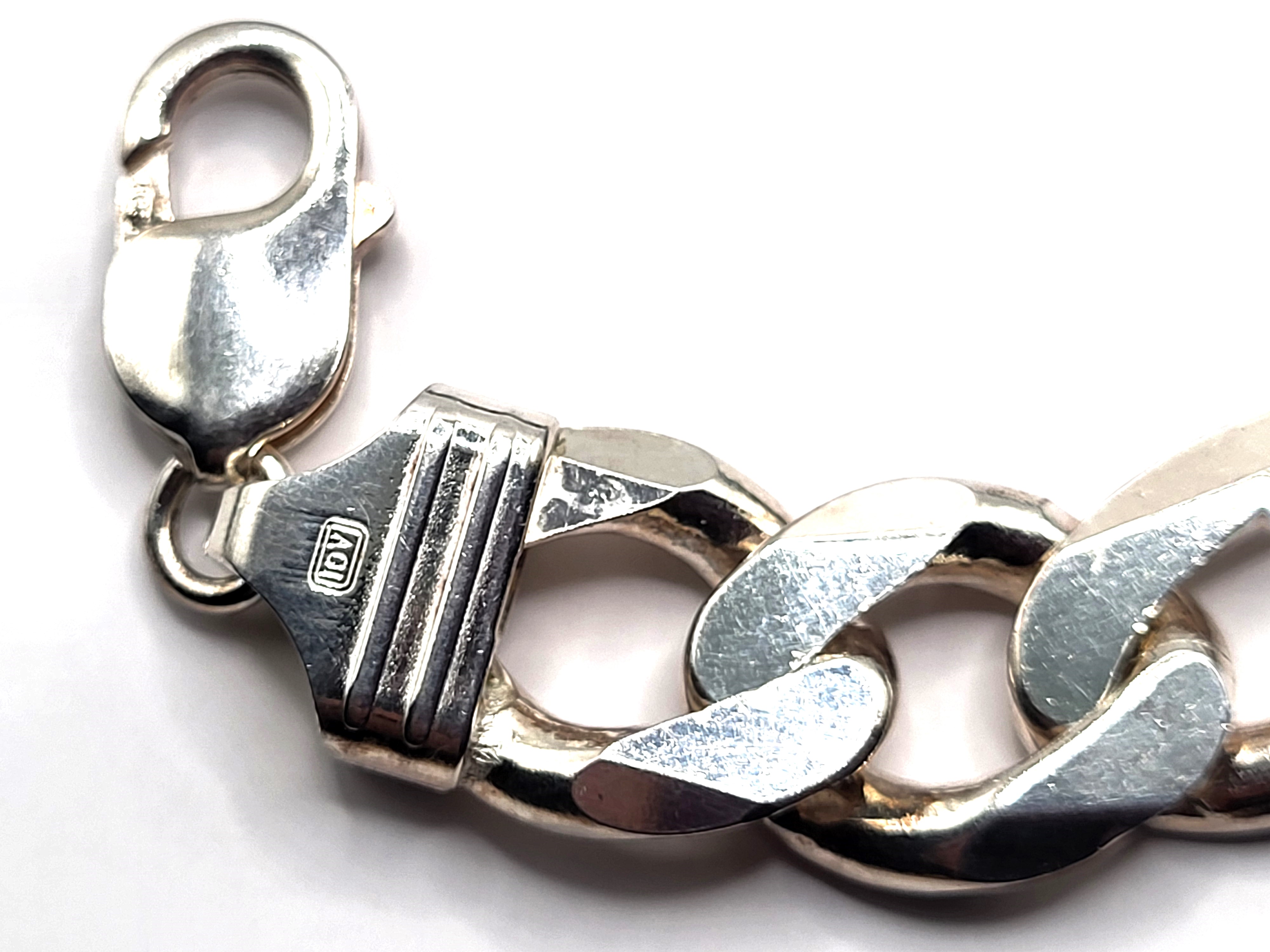 This is a very heavy sterling silver ID bracelet that is 8.25" long and has a lobster clasp. The convex, engravable plate is approximately 2" long, 5/8" wide, and 4.25mm thick. The figaro links are approximately 17mm wide. Admin: 33120/3ae