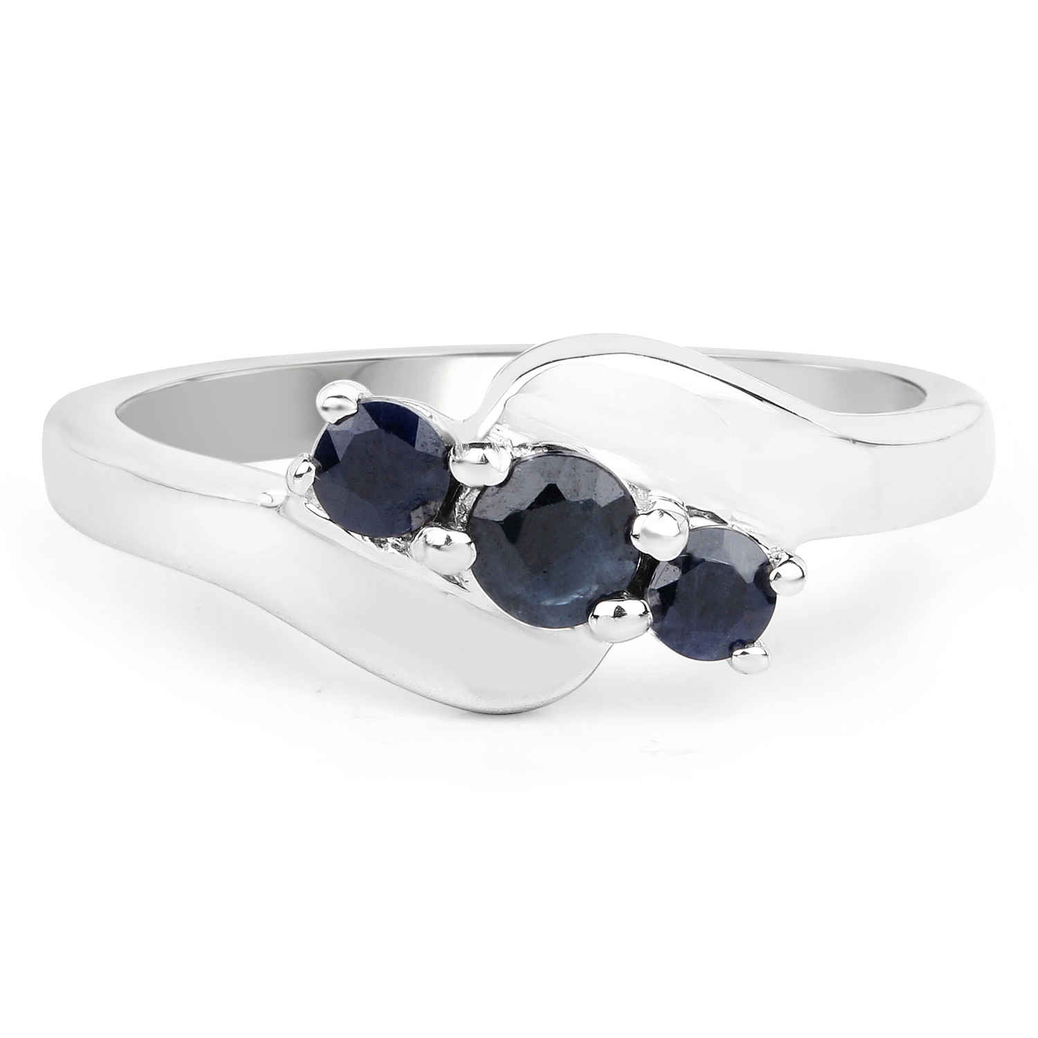 This 14 karat white gold over sterling silver ring is fashioned in a bypass and a three-stone style. Featuring .61 carats total weight of round, faceted, genuine black sapphires that can easily represent your past, present, and future, with polished bypass swirls. The ring is US size 7.5. Admin: K86371/13br