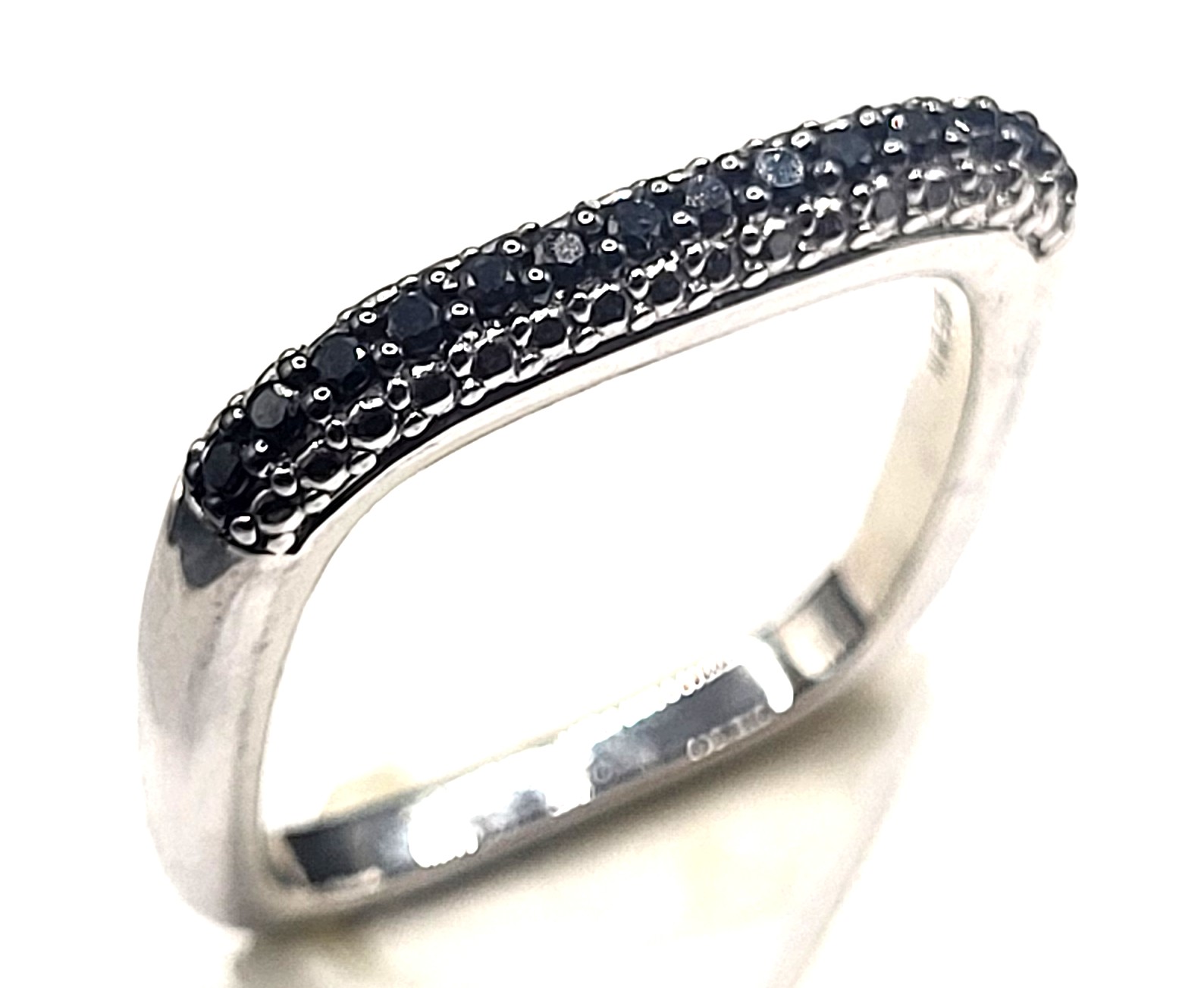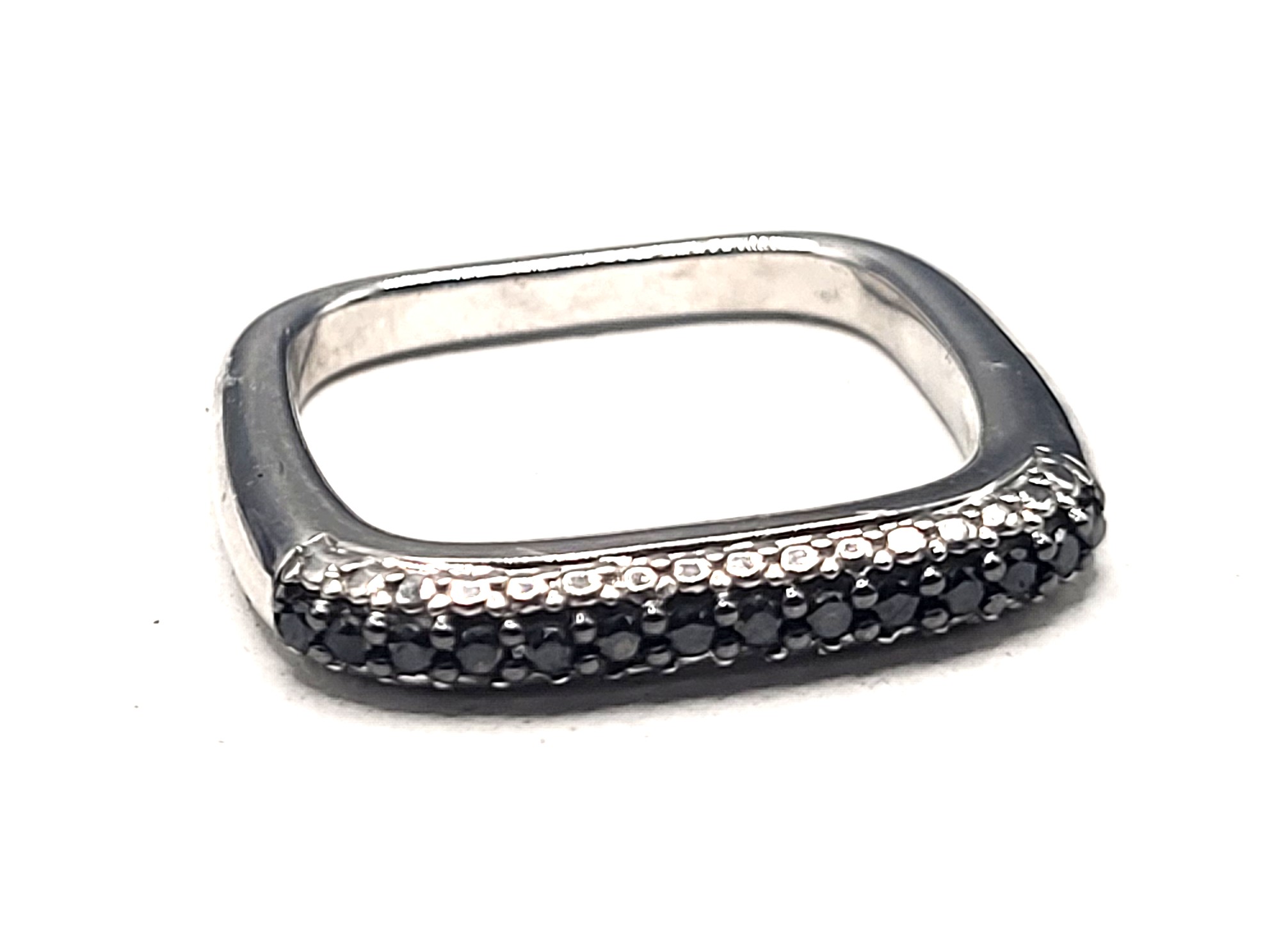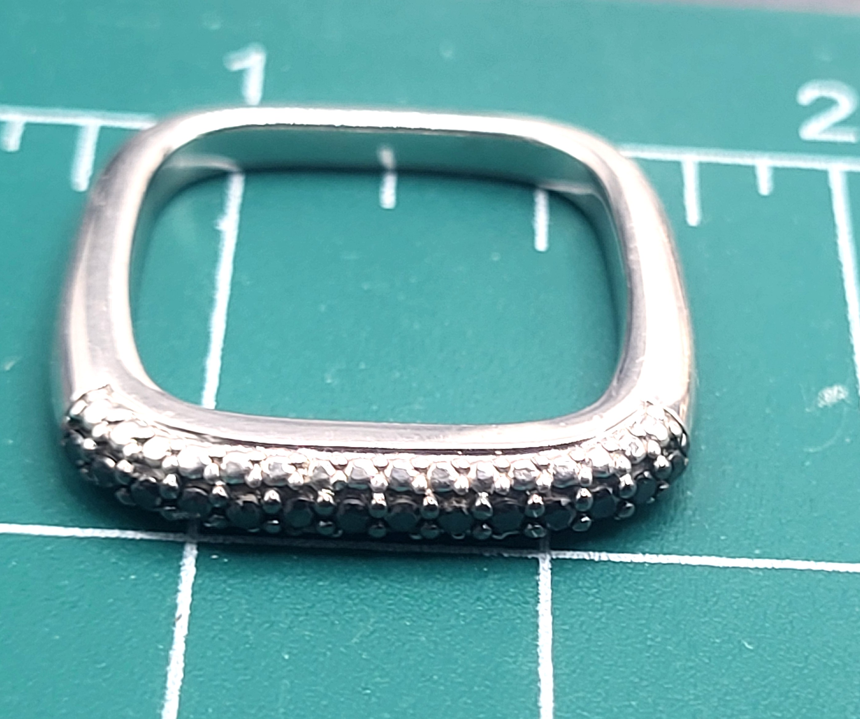 This uniquely designed pendant is made of sterling silver and genuine black diamonds. Three sides of the soft-cornered square have a mirror finish with a high-polish shine. The fourth side is set with genuine, earth-mined, black diamonds (likely enhanced by heat or irradiation) on a textured surface. The square-shaped ring-design pendant is approximately 1" diameter and features approximately .21 carats total weight of round, faceted, earth-mined black diamonds. The solid sides of the pendant taper from 3.3mm to 2.4mm wide and 4.4mm to 2.05mm in height. The pendant is quite versatile, as it can be worn by simply sliding a chain through the center, OR with a long, flexible (non-rigid) chain, let it hang from an anchor bend, aka fisherman’s knot.).
