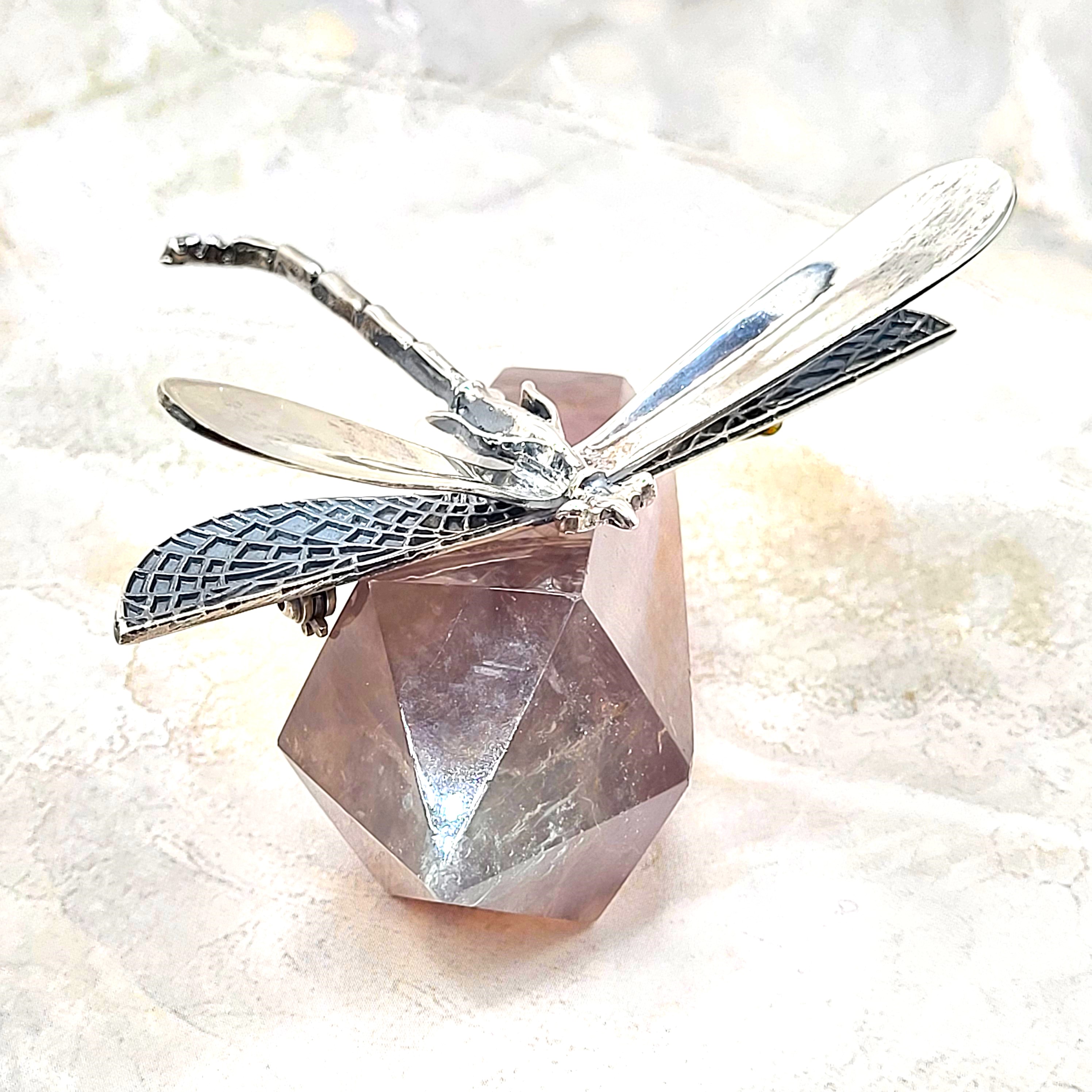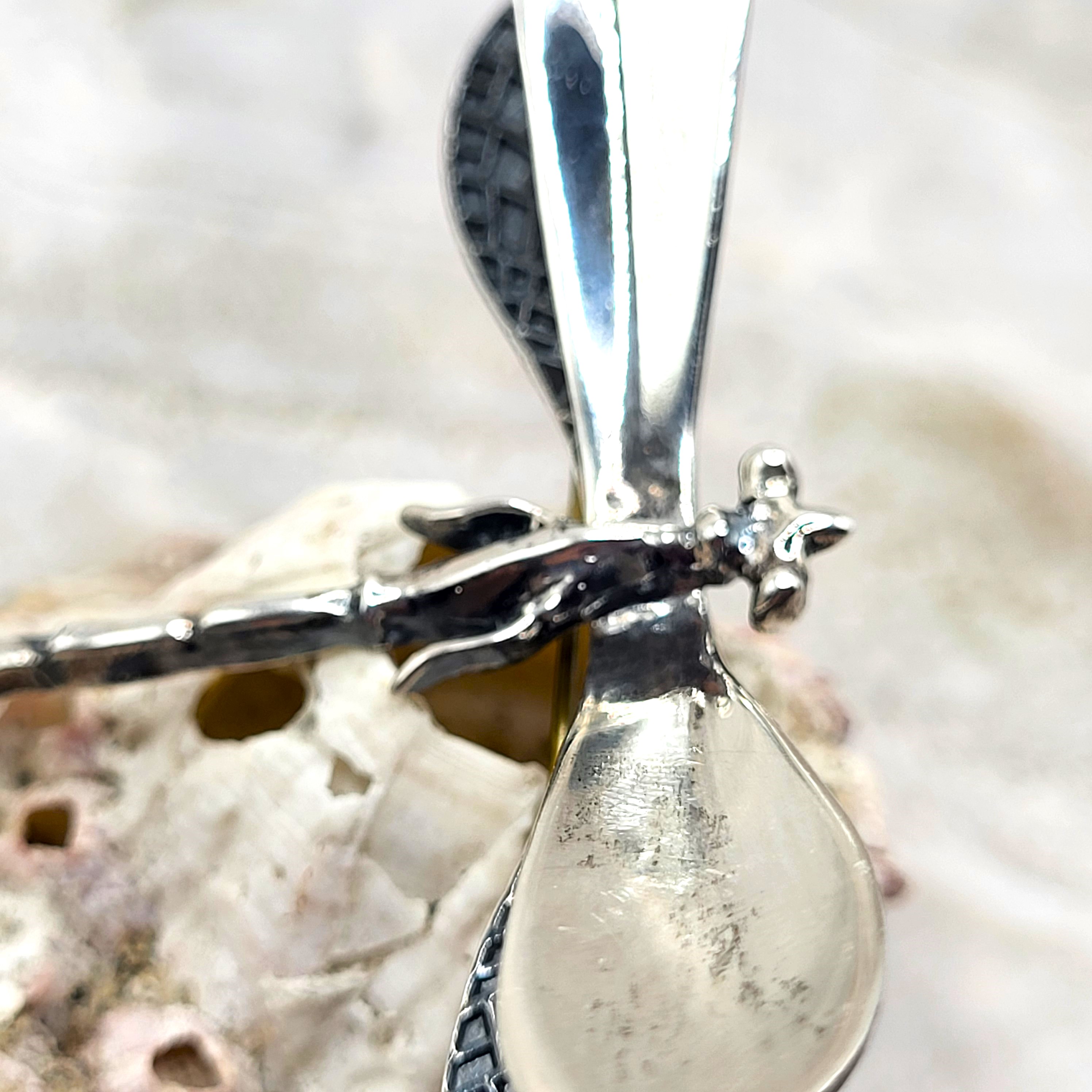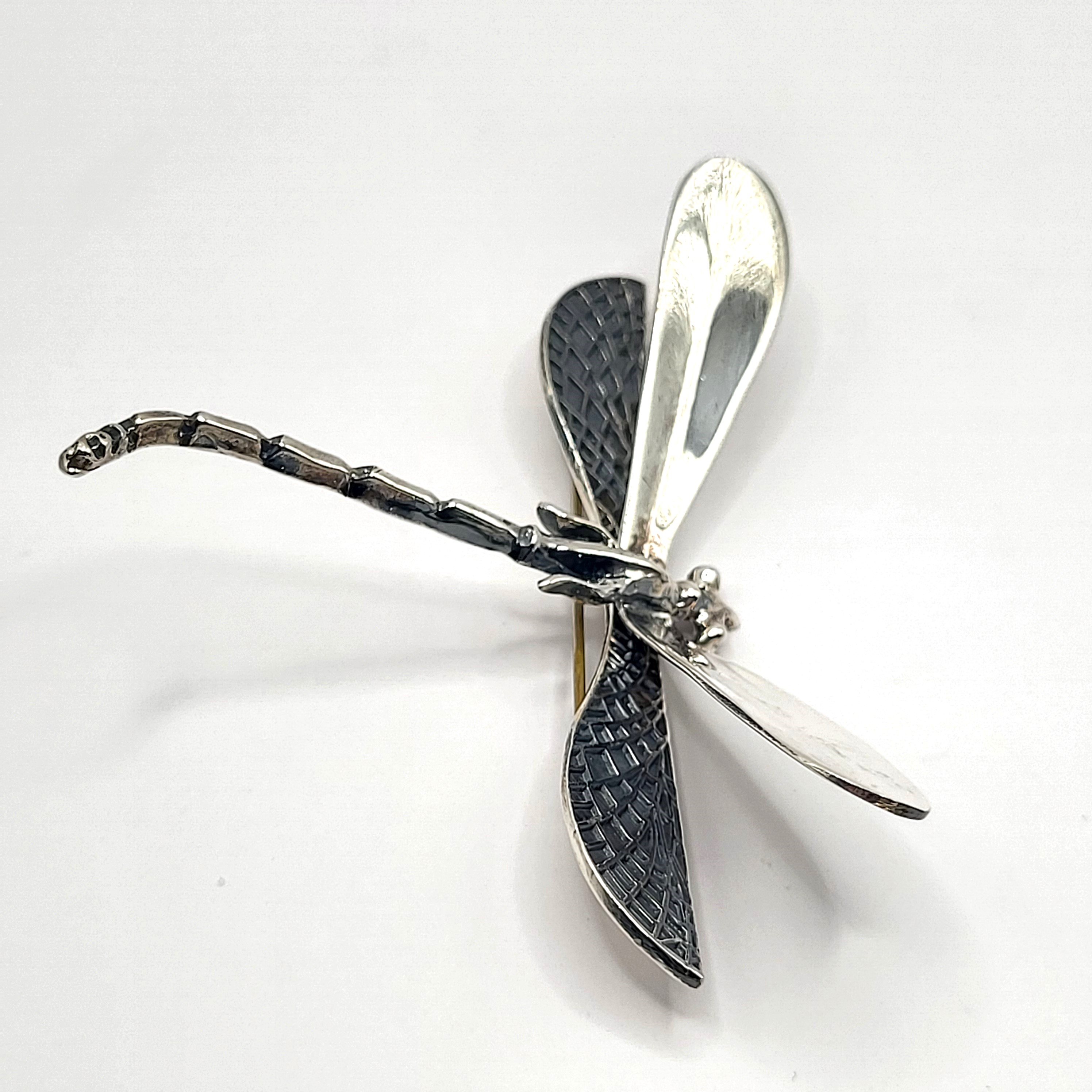 This sterling silver dragonfly brooch is looking for a place to land! Great detail is put into this piece from CII (A group of artisan silversmiths in Mexico "known for their high-quality silver jewelry and intricate designs") circa mid-late 1970’s. The brooch has very nice detail, such as the segments of the body and the venation on the wings. The pin measures approximately 2.25" long and a wingspan of 3". It closes with a locking "C" clasp. Please contact Bidfair Fine Jewelry if you would like to change this into a pendant. Admin: 33120/10ba