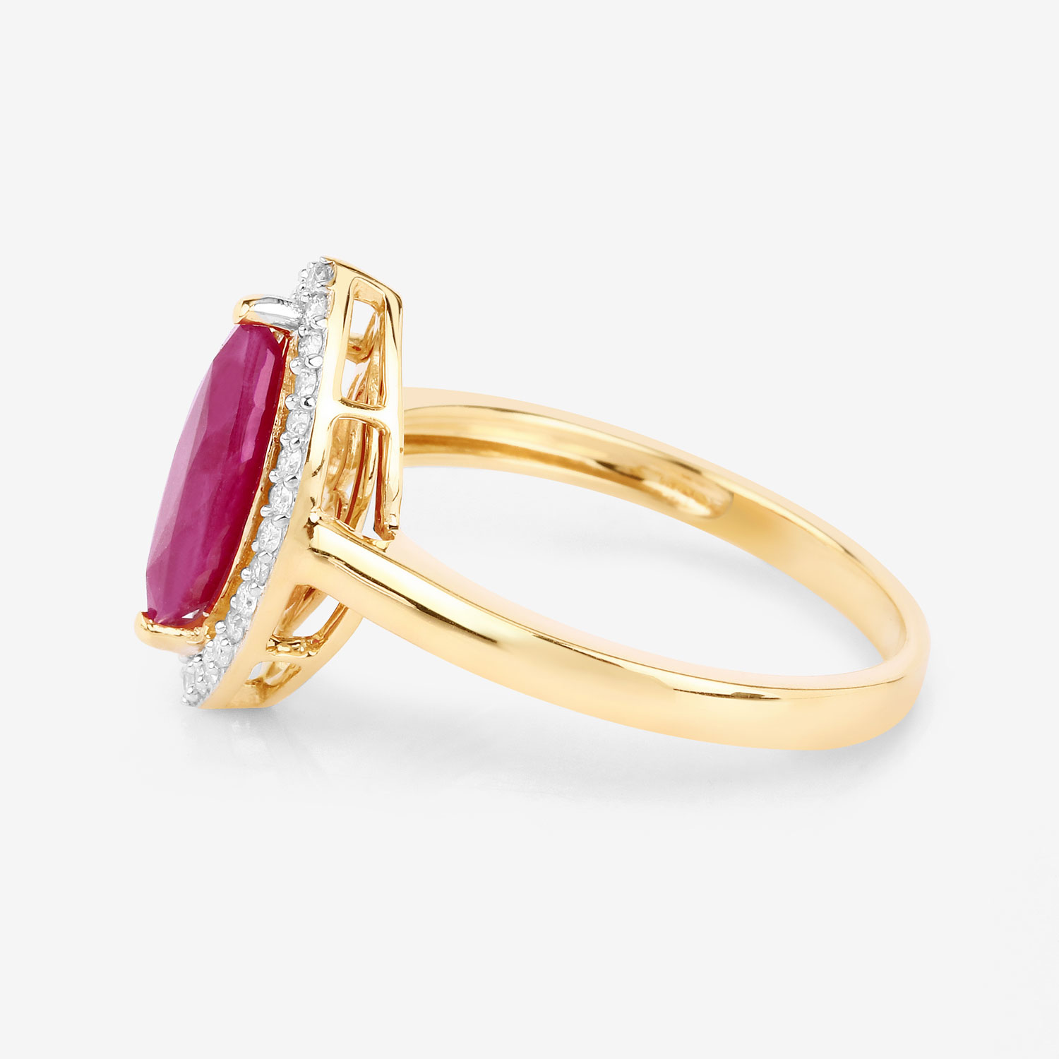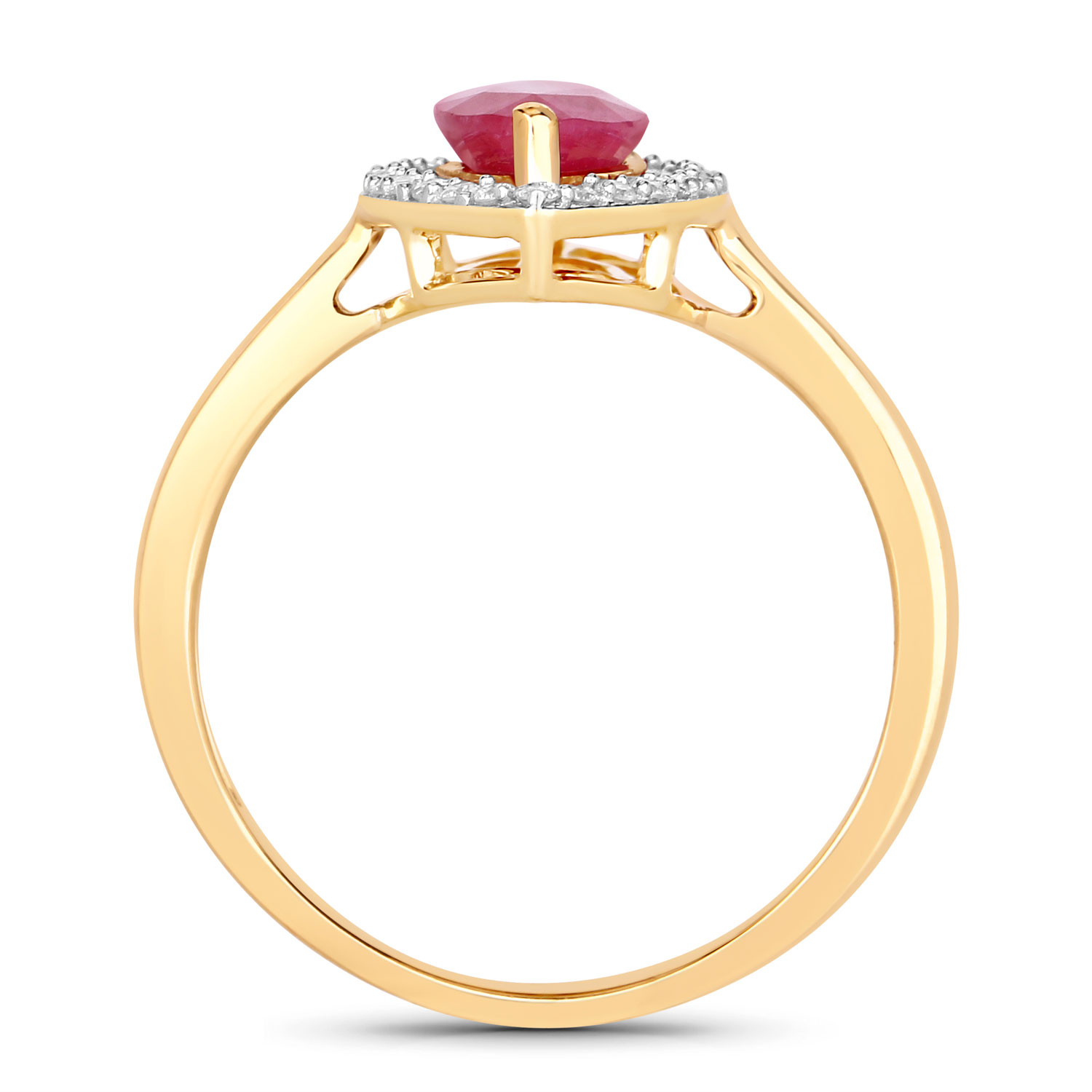 Say hello to savvy savings with this 10 karat yellow gold ring that features a 1.39 carat, marquise-cut, genuine ruby set with V prongs inside a halo of .13 carats total weight, round, brilliant-cut, H-I color, I1 clarity diamonds. This ring is US size 7 and has a polished shank. See below for sizing options and other information. Admin: Q