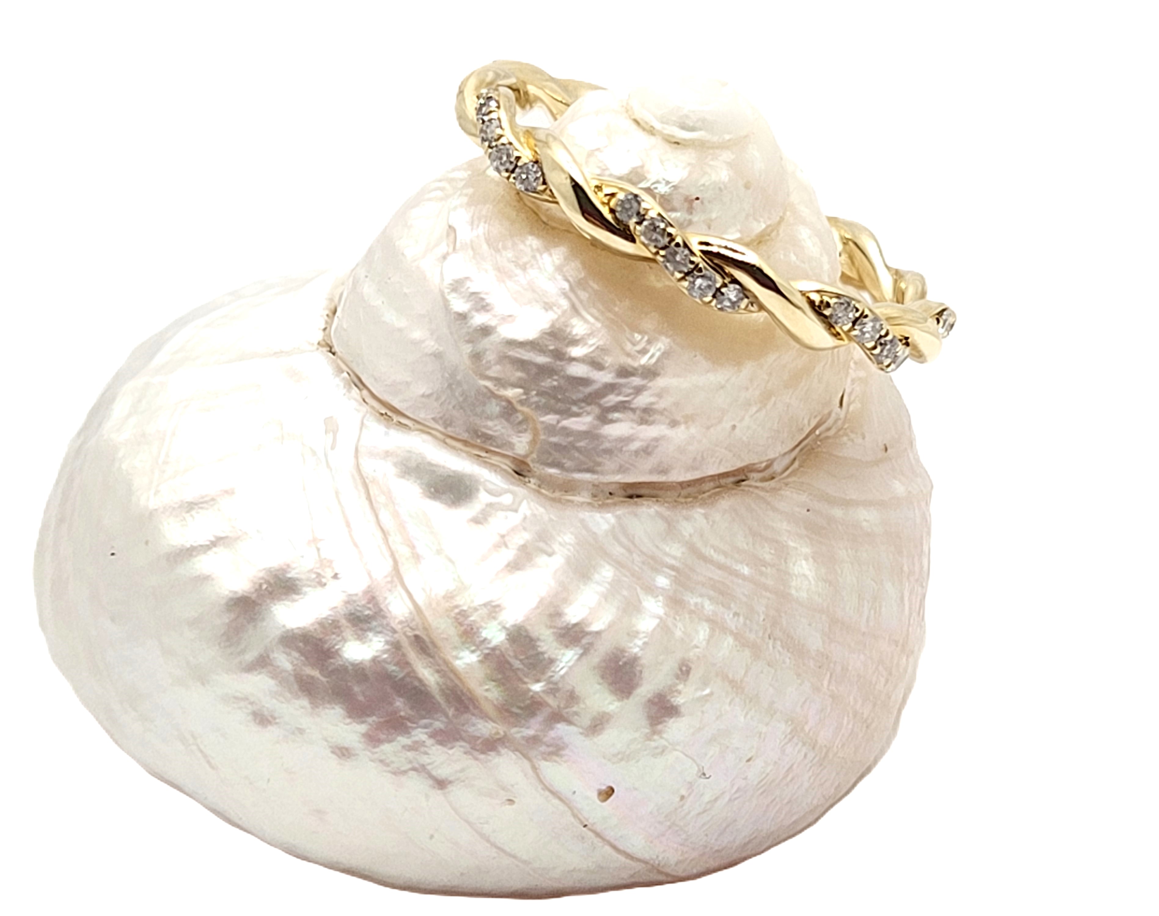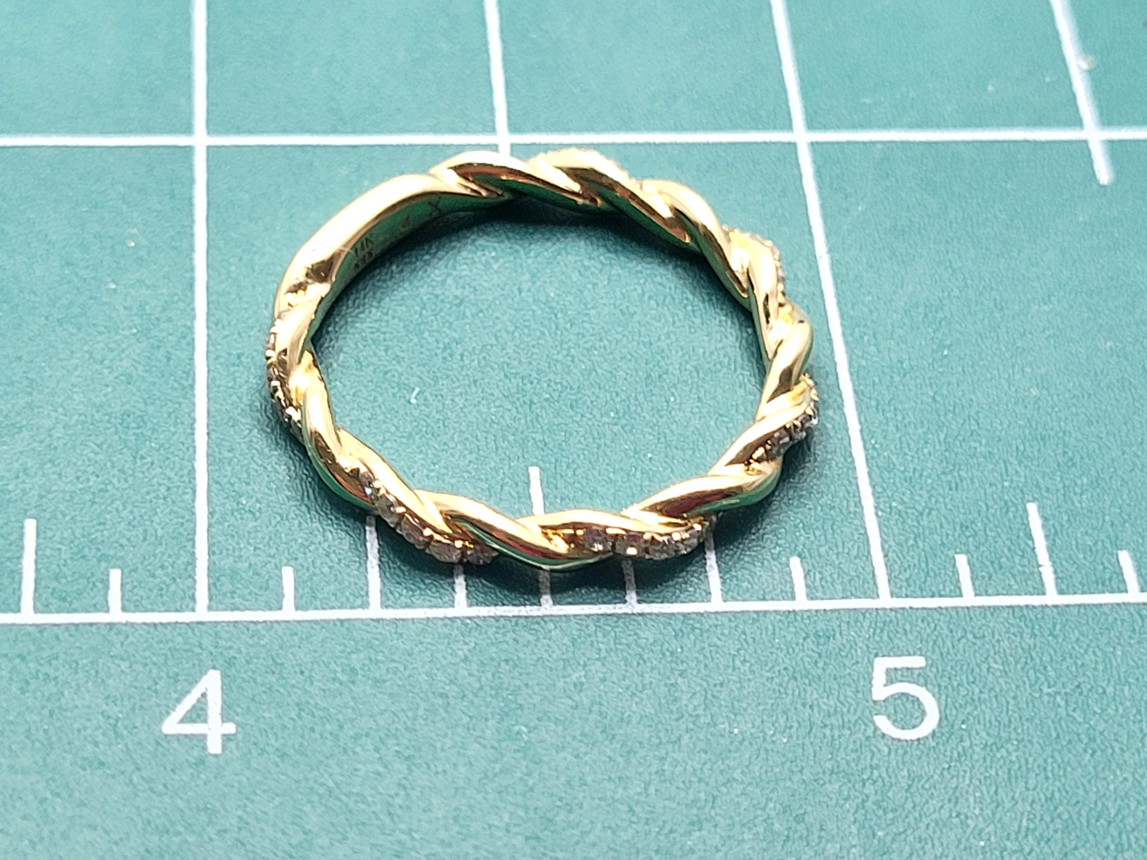This 14 karat yellow gold ring is like a magical tendril from a vine that has captured her finger. It features .21 carats total weight of round, brilliant-cut, H-I color, SI2-I1 clarity diamonds in its spiraling design. The ring is approximately 2mm thick and US size 7.25. Find Sizing Details and other important information below. Admin: G11241/25ilt