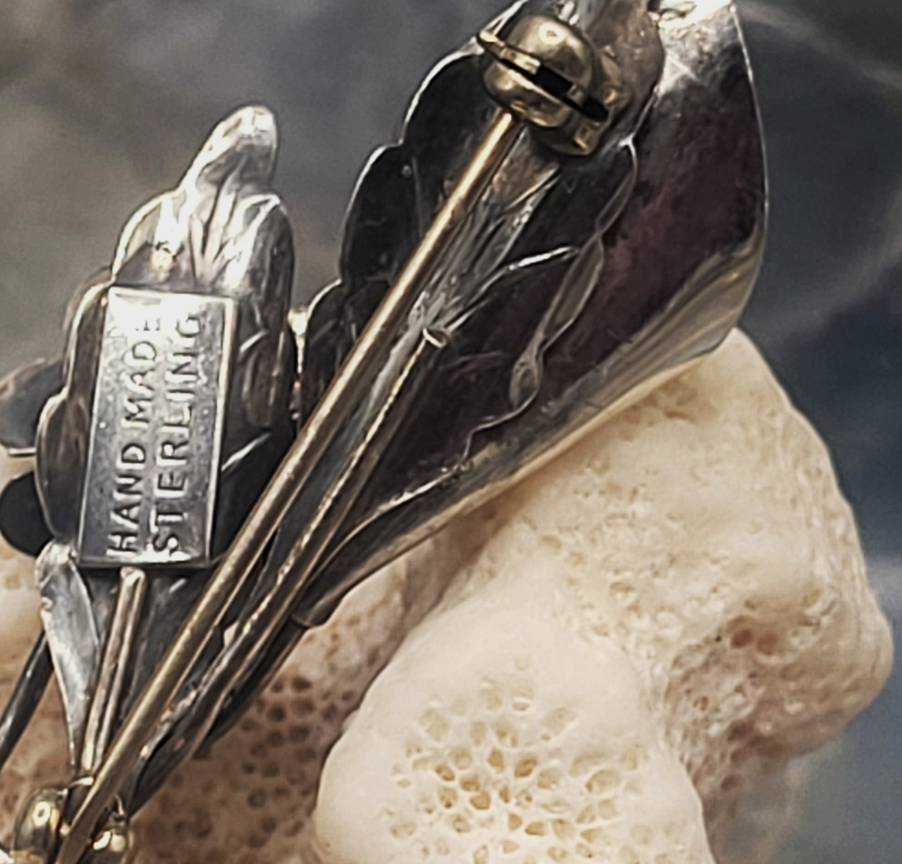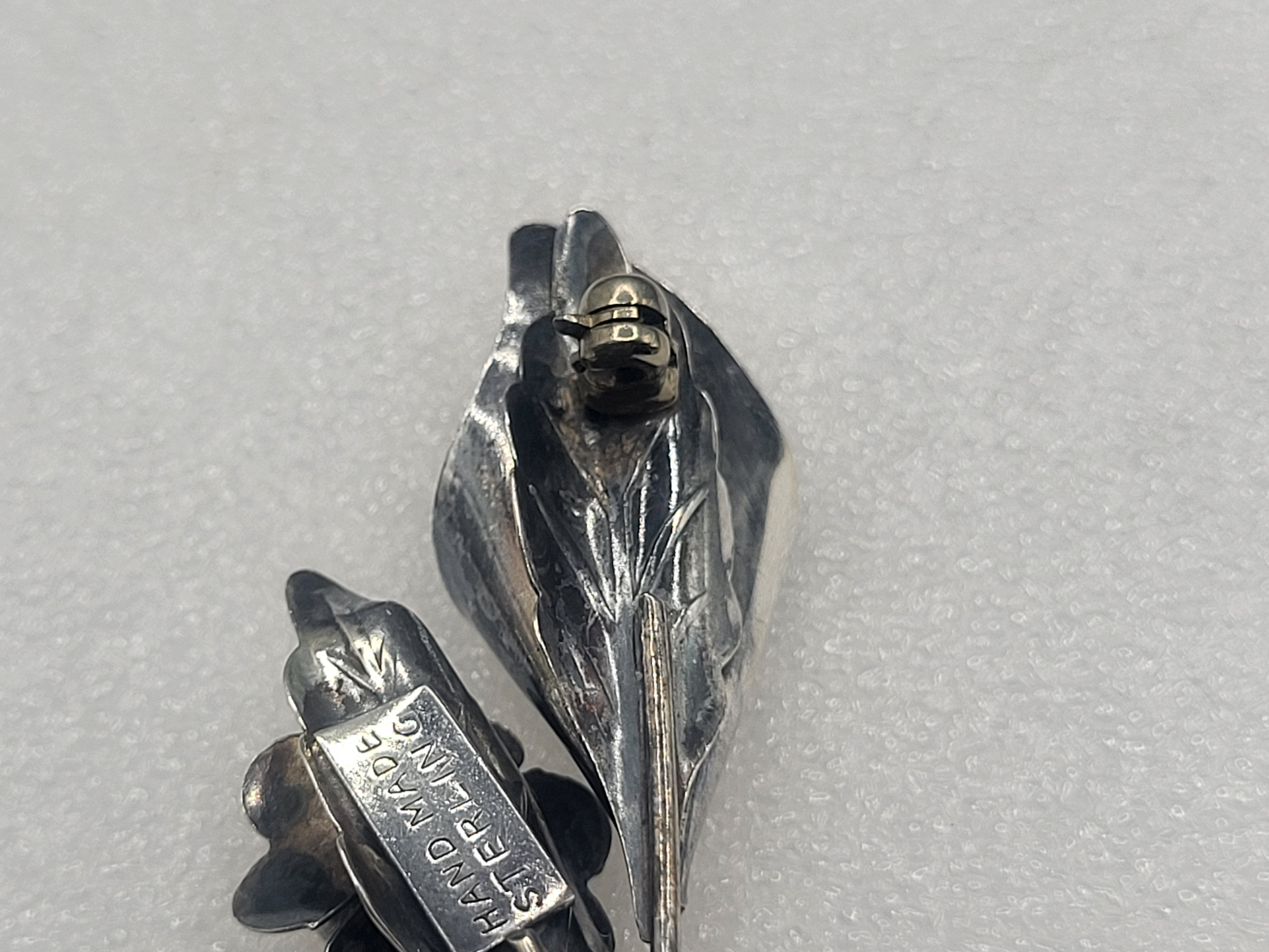 This vintage sterling silver brooch, pin is a work of art, as well as a piece of fine jewelry. The twisted stems end in a curve resembling the letter "J". Fine sheets of sterling silver are cut into heart-shaped flower petals, and are curved into the budding centers. Even the backs of the flowers are etched with incredible detail of tendrils and venations. The brooch is approximately 1" long and has a locking "C" clasp.