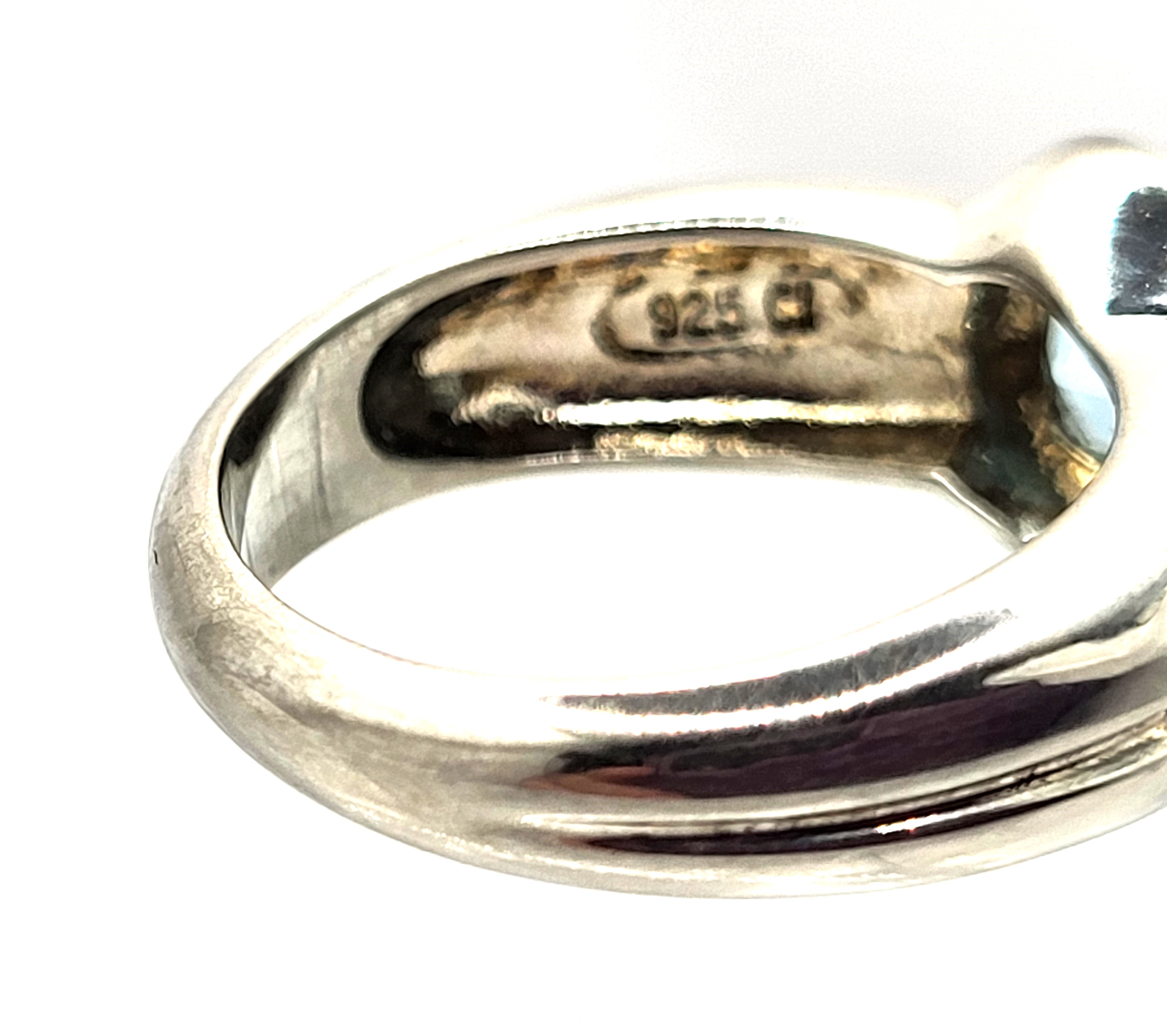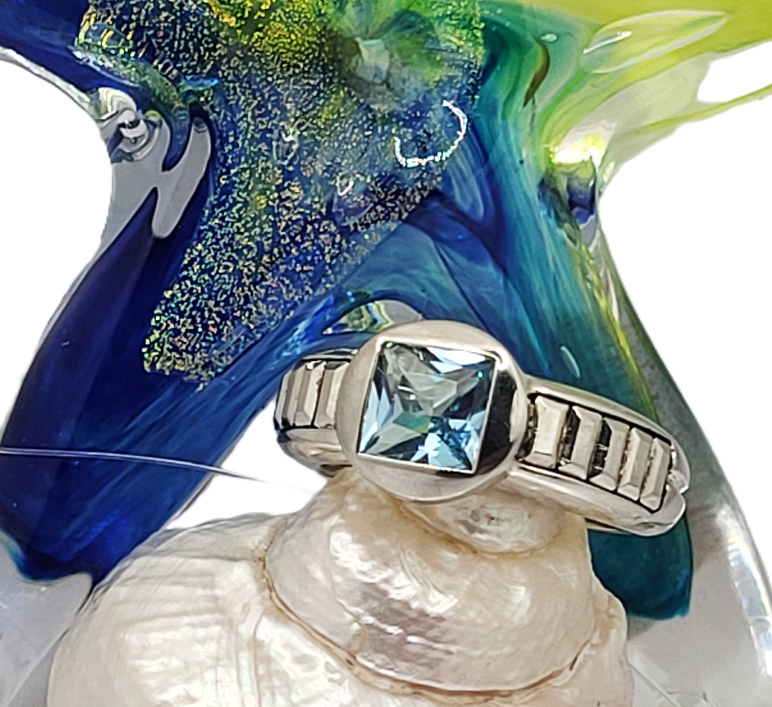 This sterling silver ring features an approximate 1.50 carat, square-cut, bezel-set, genuine Swiss blue topaz that is nestled between shoulders that resemble "bars of silver". The bezel setting for the blue topaz is striking, with the solid build and contrasting rounded form. The top of the ring is approximately 11mm and tapers to approximately 4mm. This ring is US size 9 and can be sized for an additional charge. Please contact Bidfair Fine Jewelry for sizing details. This ring can be worn comfortably by either gender. Admin: 410633/hh