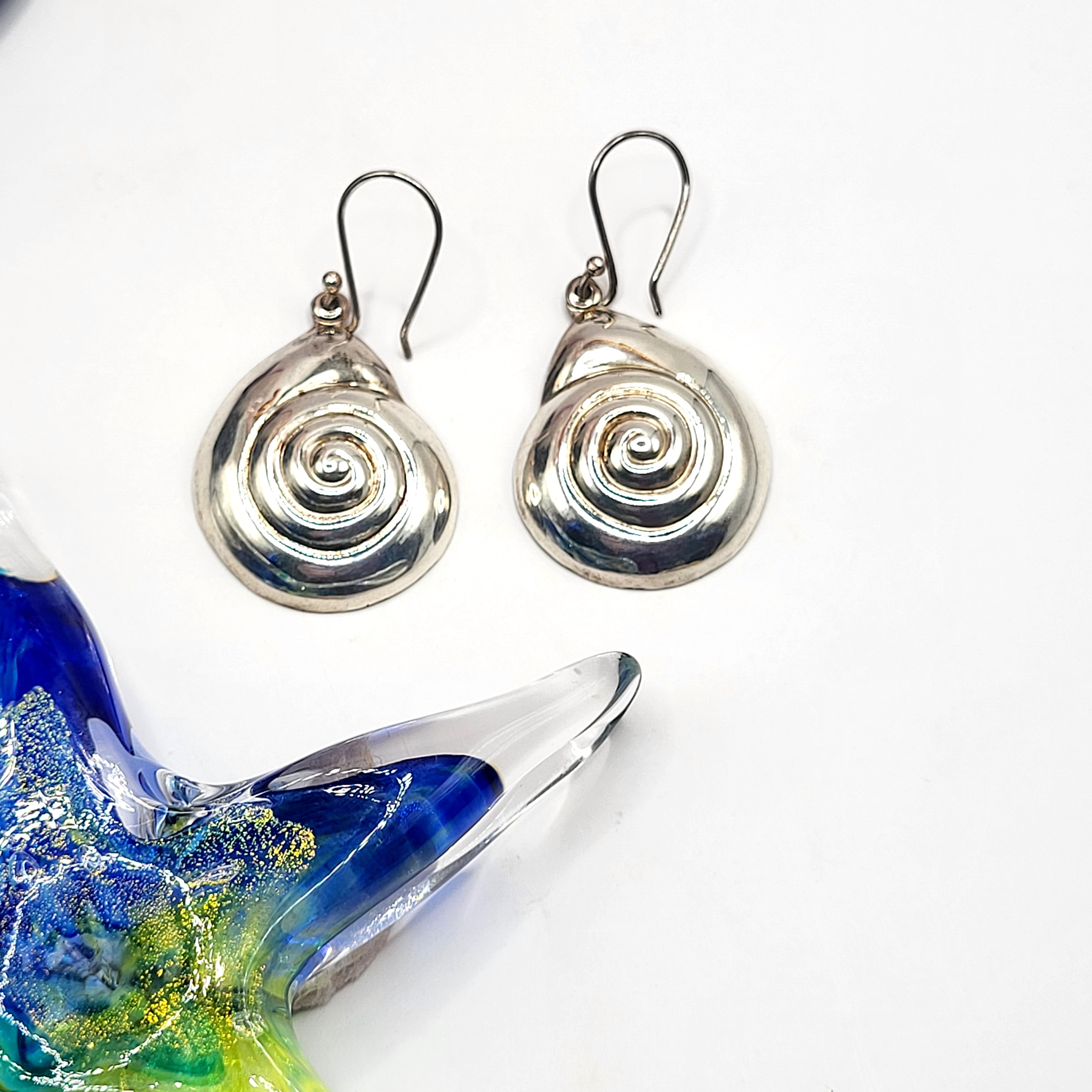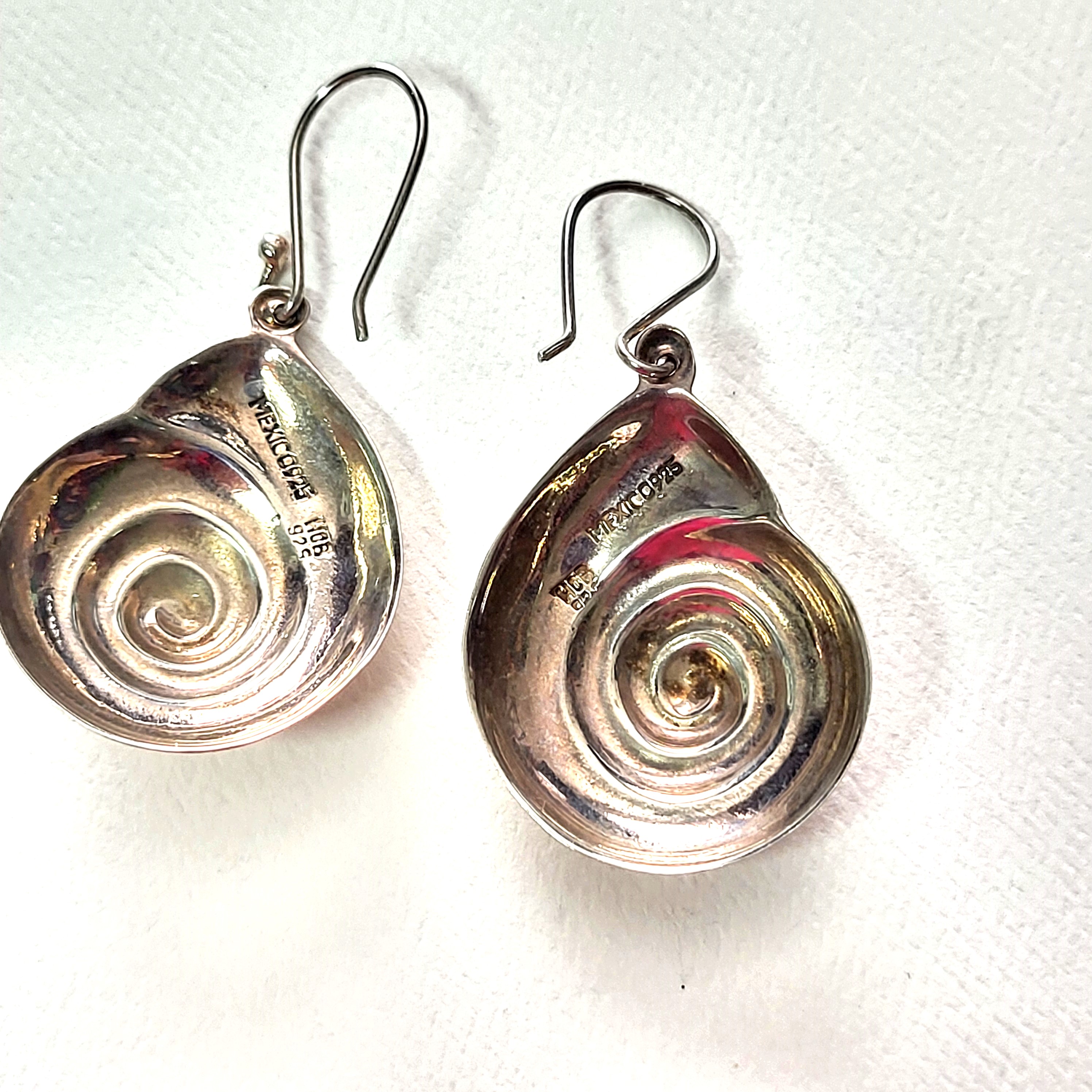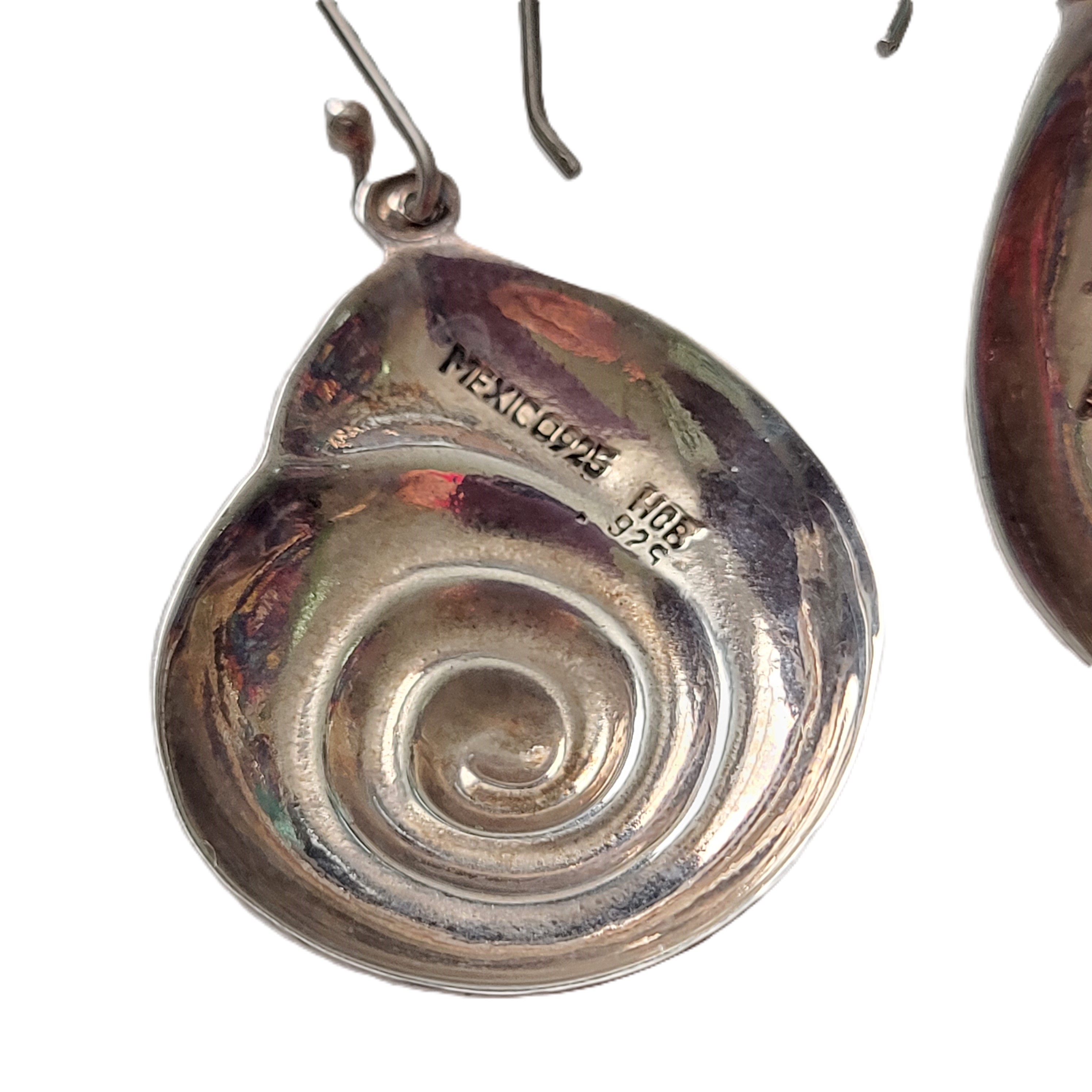 This pair of sterling silver earrings are super-trendy right now. They depict figural sea shells, perhaps as a chambered nautilus shell! The earrings are approximately 1" long x 1" wide and hang from strong wire hooks. They are circa early-mid 1980’s and made in Mexico. Admin: 33120/22bh