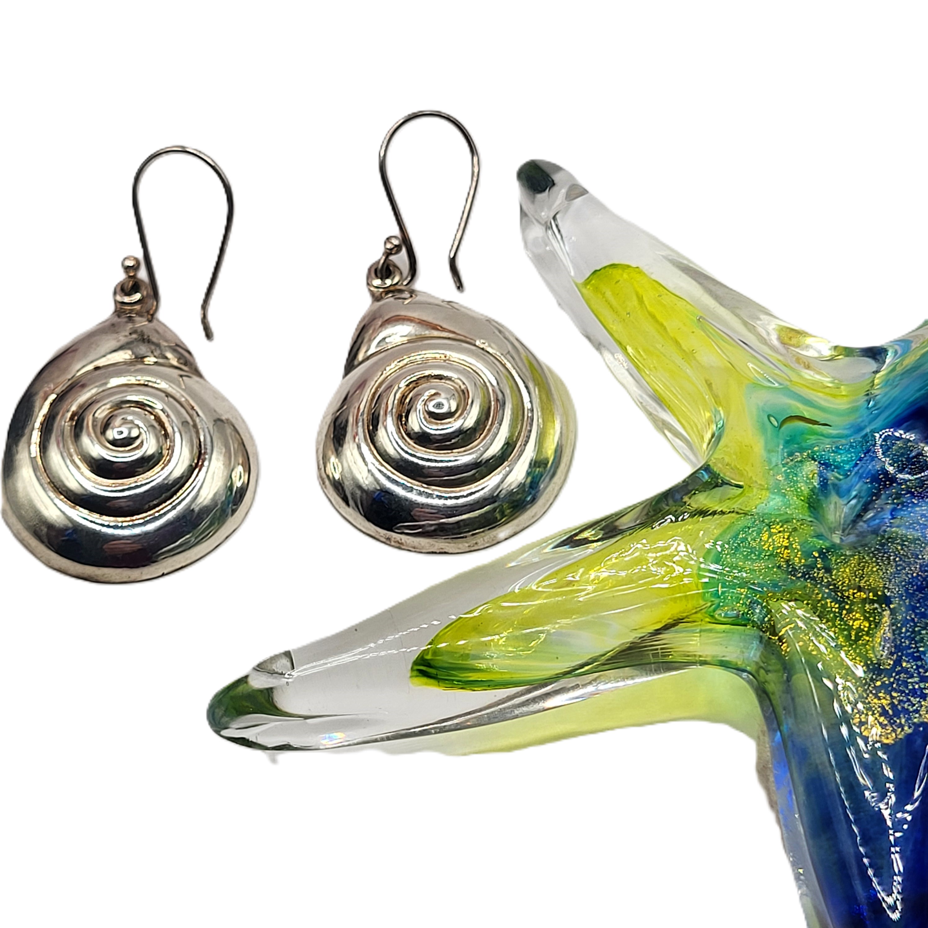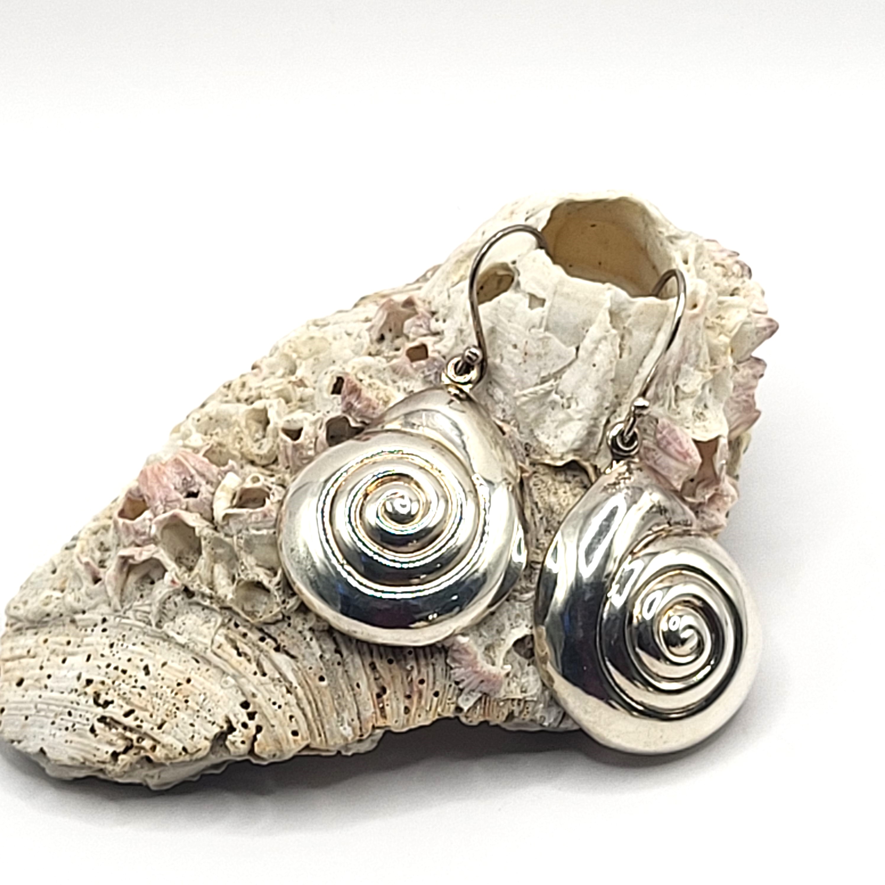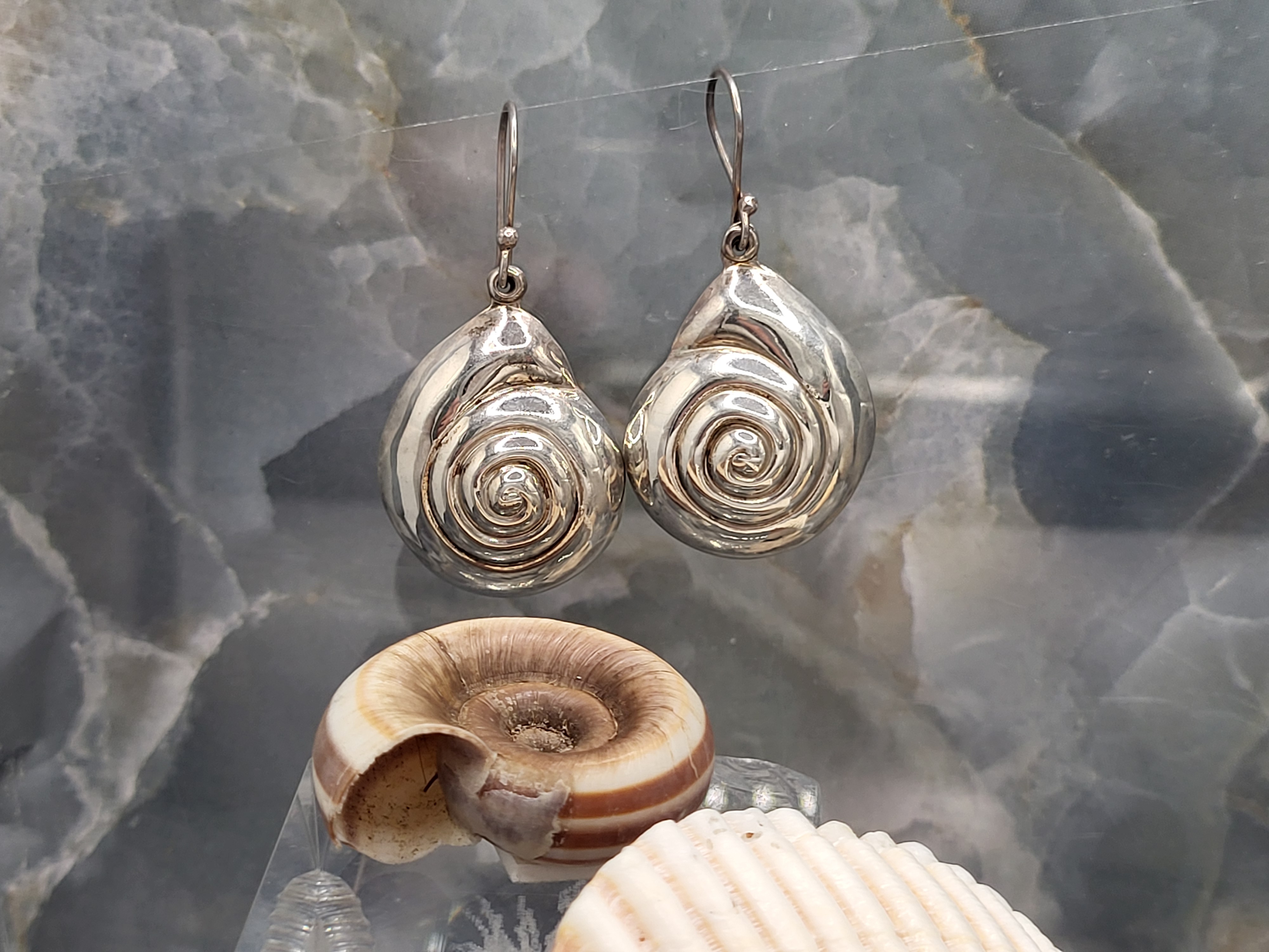 This pair of sterling silver earrings are super-trendy right now. They depict figural sea shells, perhaps as a chambered nautilus shell! The earrings are approximately 1" long x 1" wide and hang from strong wire hooks. They are circa early-mid 1980’s and made in Mexico. Admin: 33120/22bh