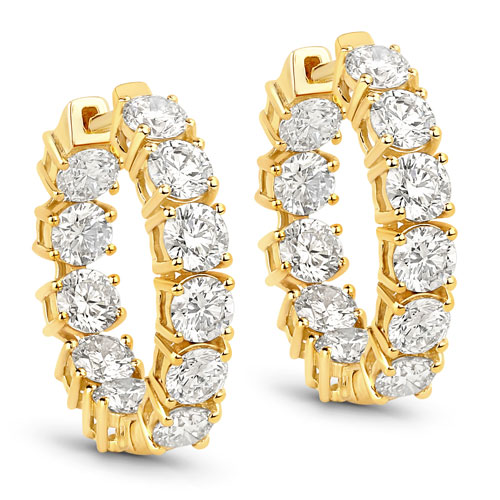 These 14 karat yellow gold huggie hoop earrings are super stunners. They feature 3.08 carats of round, brilliant-cut, colorless, VS clarity, lab-grown diamonds.  That is over 1.50 carats per ear!!! Wow! They are approximately 3/4" diameter and 1/16" wide.  They are hinged and attach to the earlobes with posts that insert into themselves with a snapping lock. Admin: Q5743/3-aae
