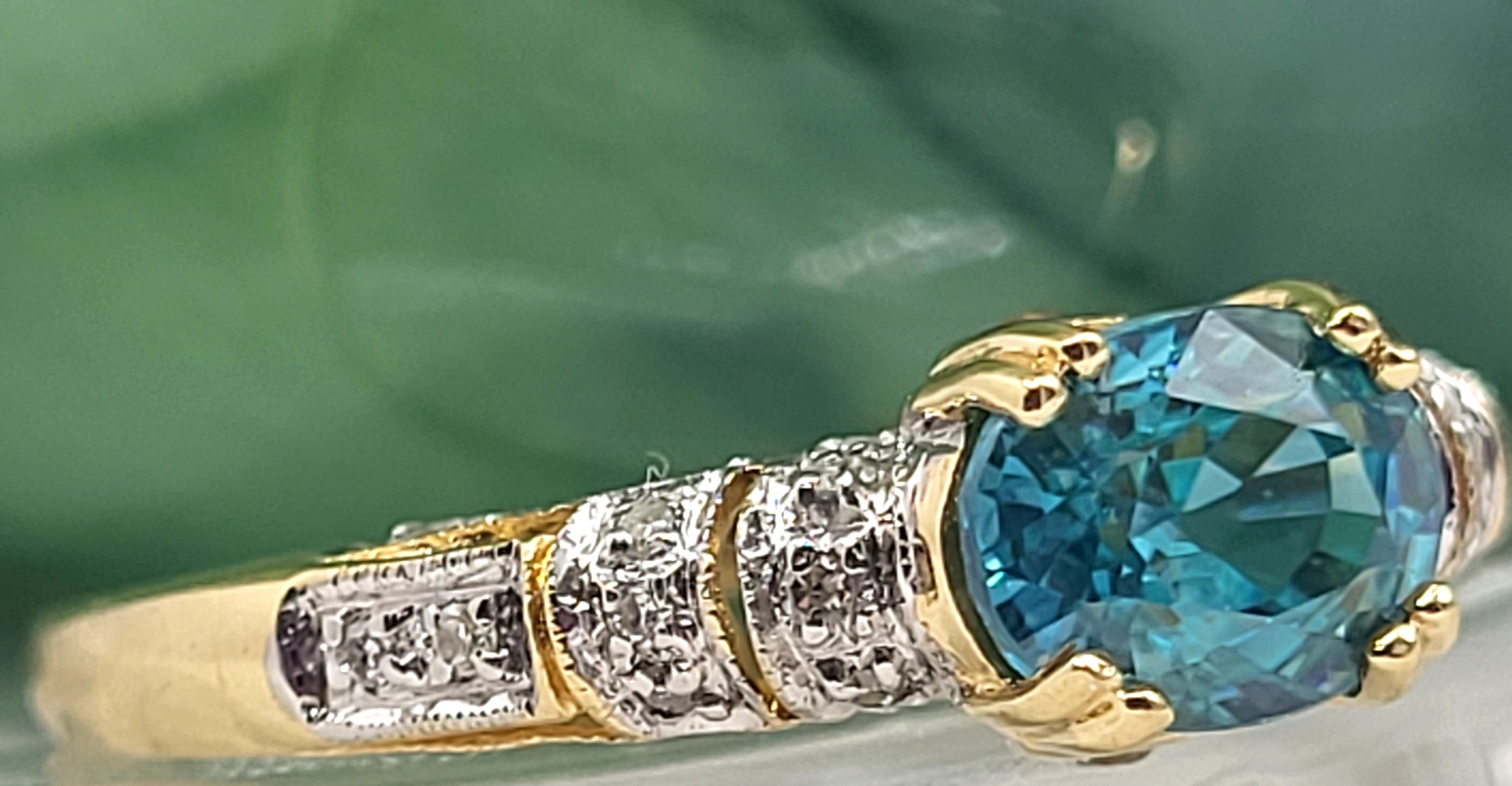 This is a 14 karat yellow gold ring that features a gorgeous oval-cut, East-West set with double prongs, genuine blue zircon, approximately 2.00 carats. There are .25 carats total weight of round, brilliant-cut diamonds in the bridge and along the shoulders. This ring is an approximate US size 10 and can be sized for an additional charge. Please contact Bidfair Fine Jewelry for sizing details.This is a brand new item that has been held in back stock. It is in excellent condition, but may have minor signs of storage, such as fine scratches or patina. Admin: 33110/10lh