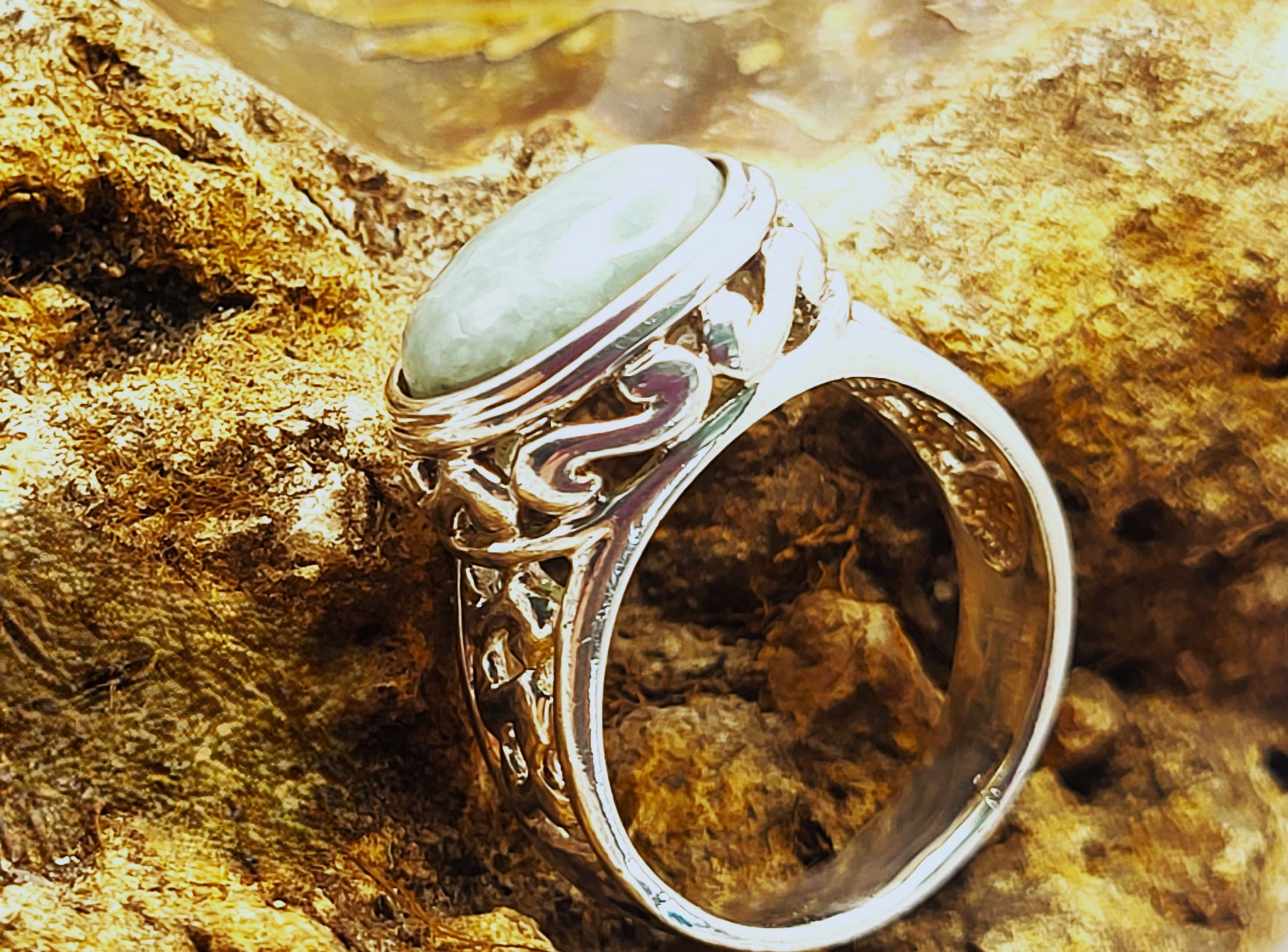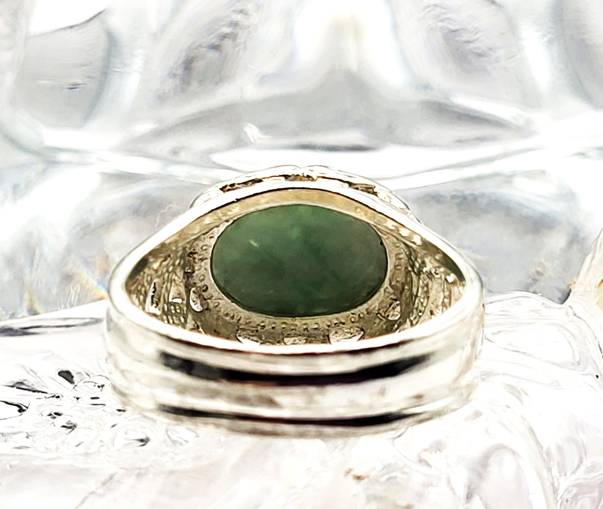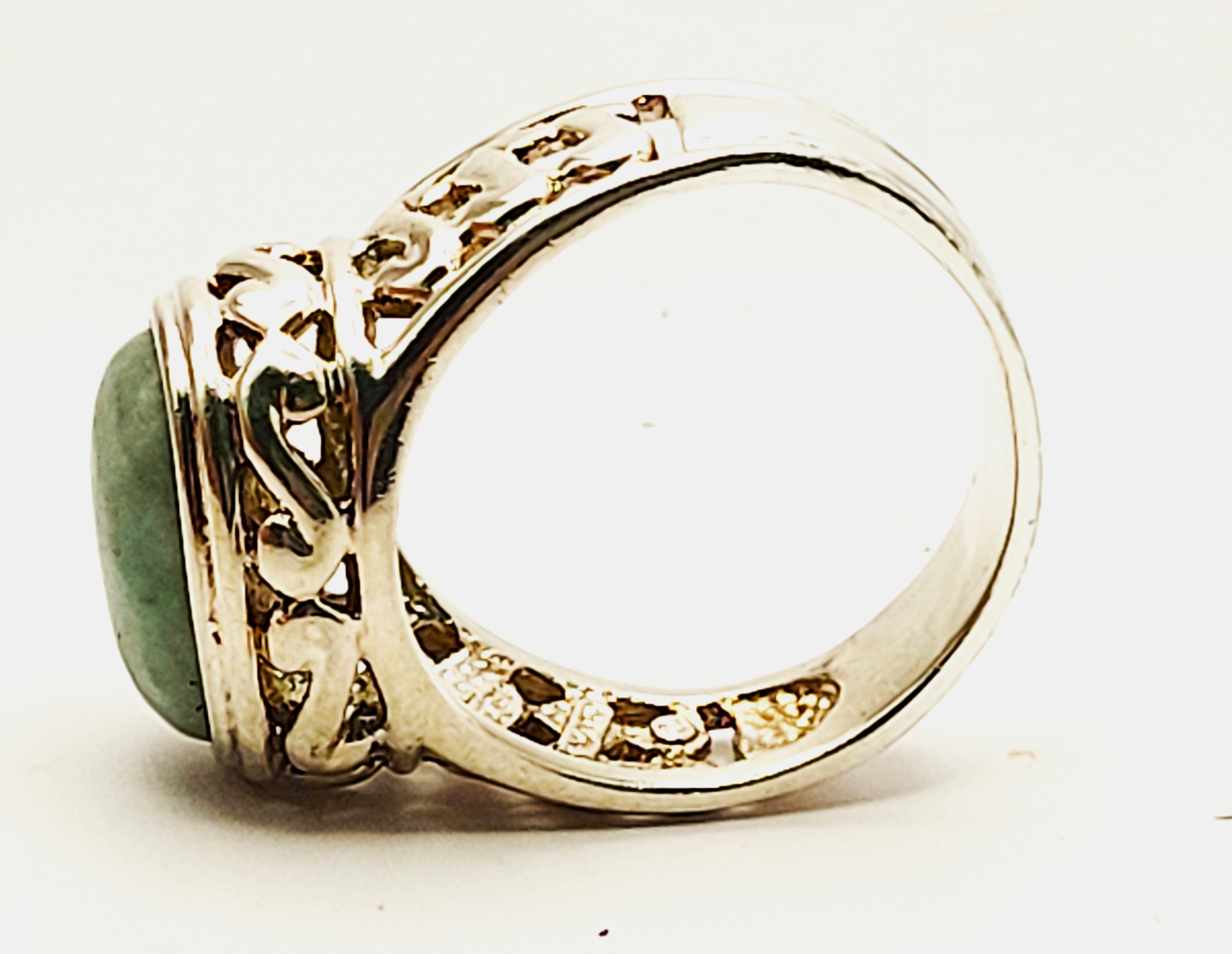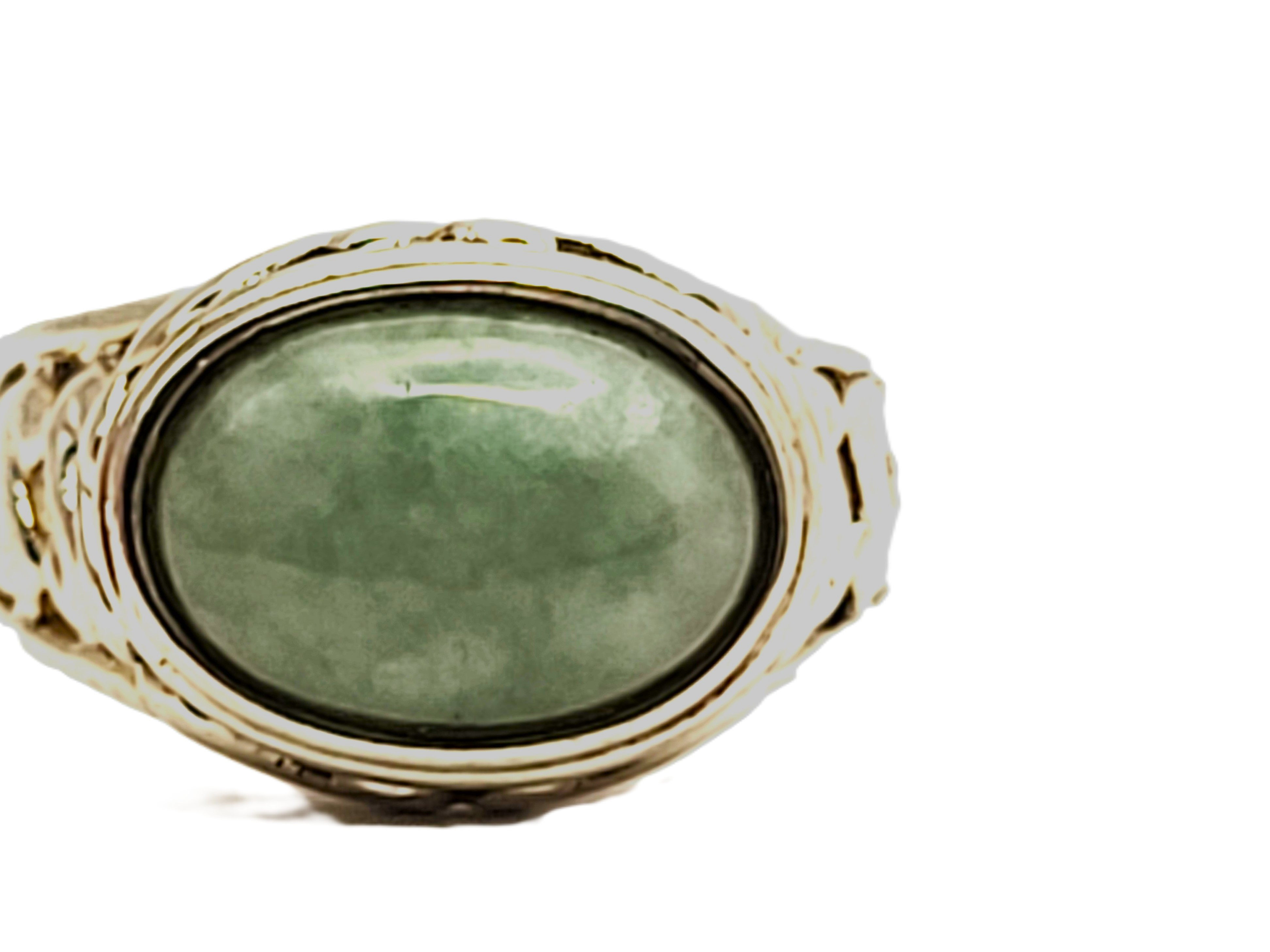 This sterling silver ring features an approximate 6.50 carat, oval cabochon, genuine, mottled green aventurine. The bezel-set aventurine rests on a sterling silver platform with open swirled designs and overlooks beautifully reticulated shoulders that taper to a solid 5.85mm shank. This ring is US size 9.5 and can be sized. See below for sizing options. This ring is appropriate for either a man or a woman. Admin: KSLH24/wr