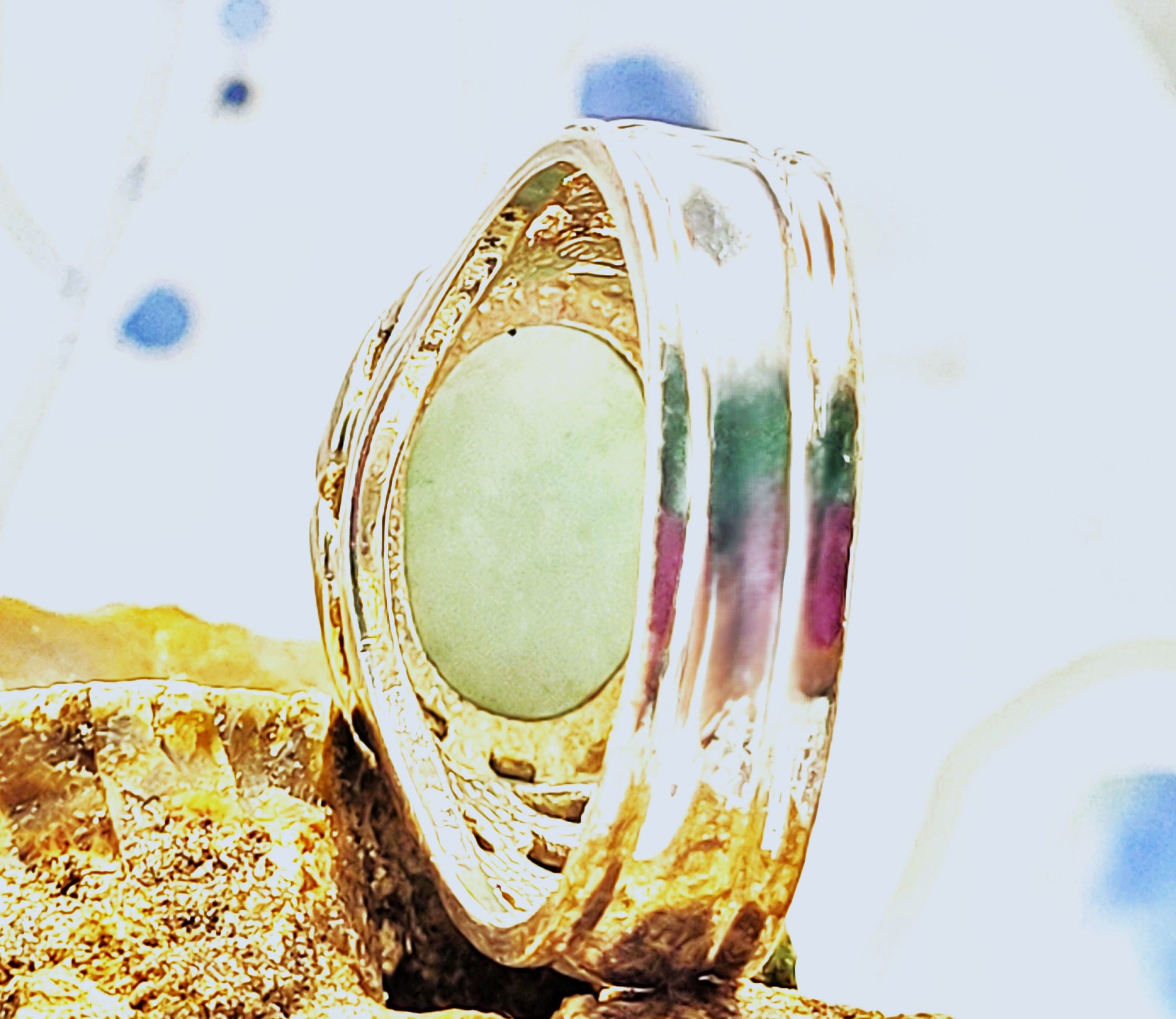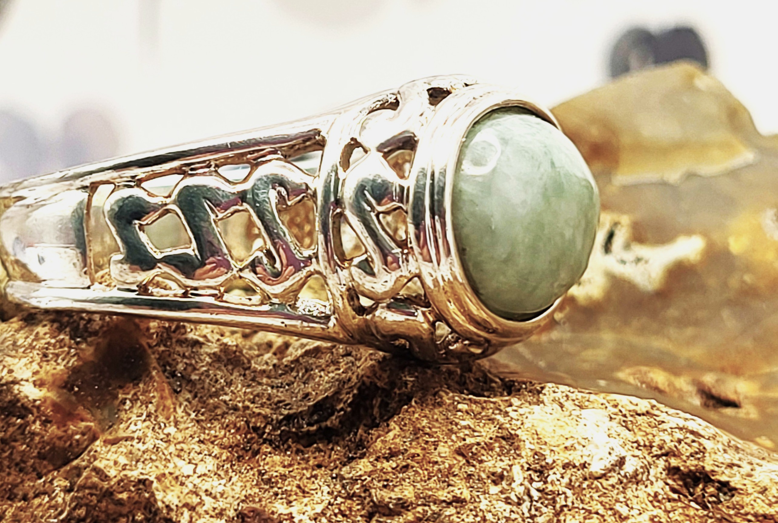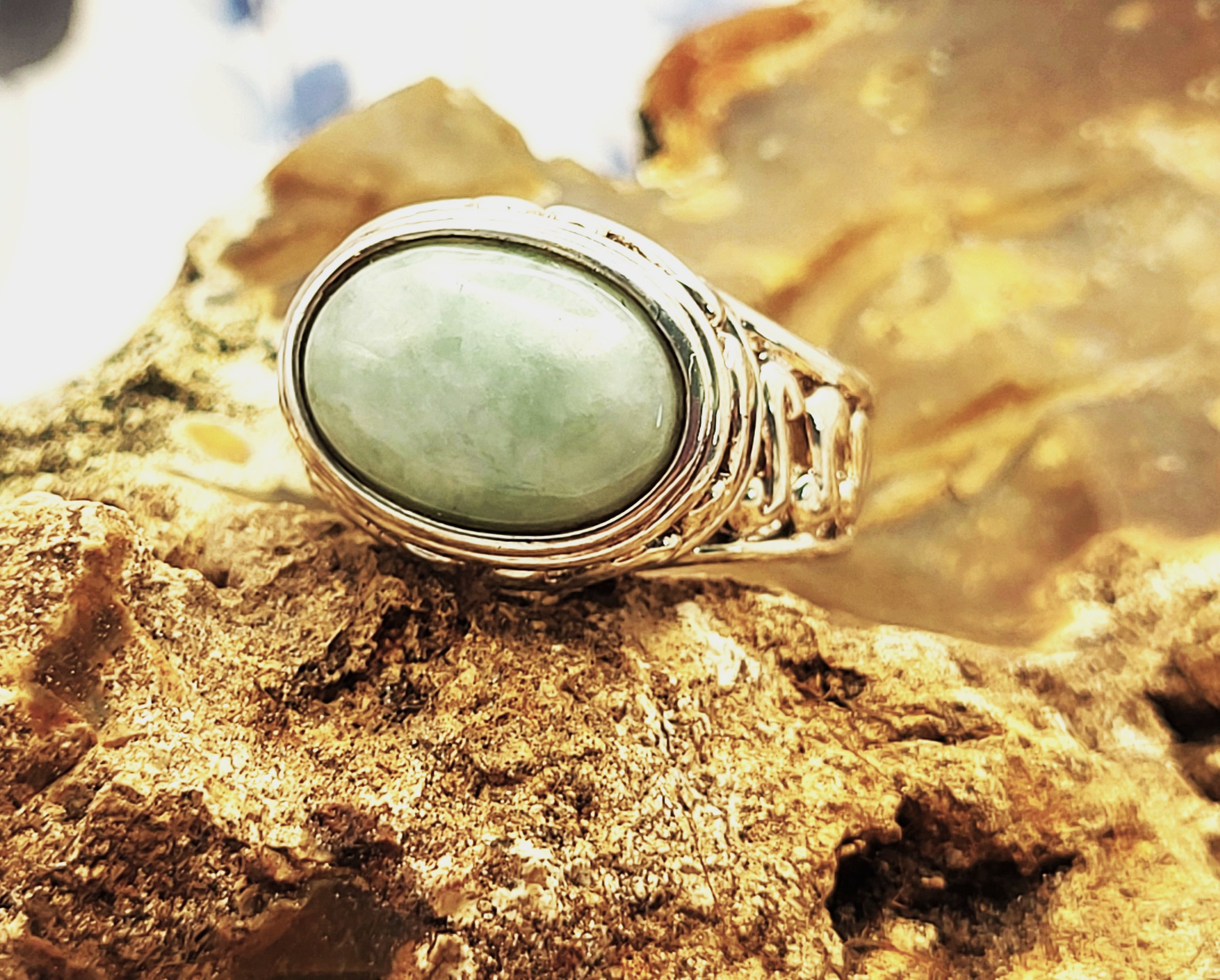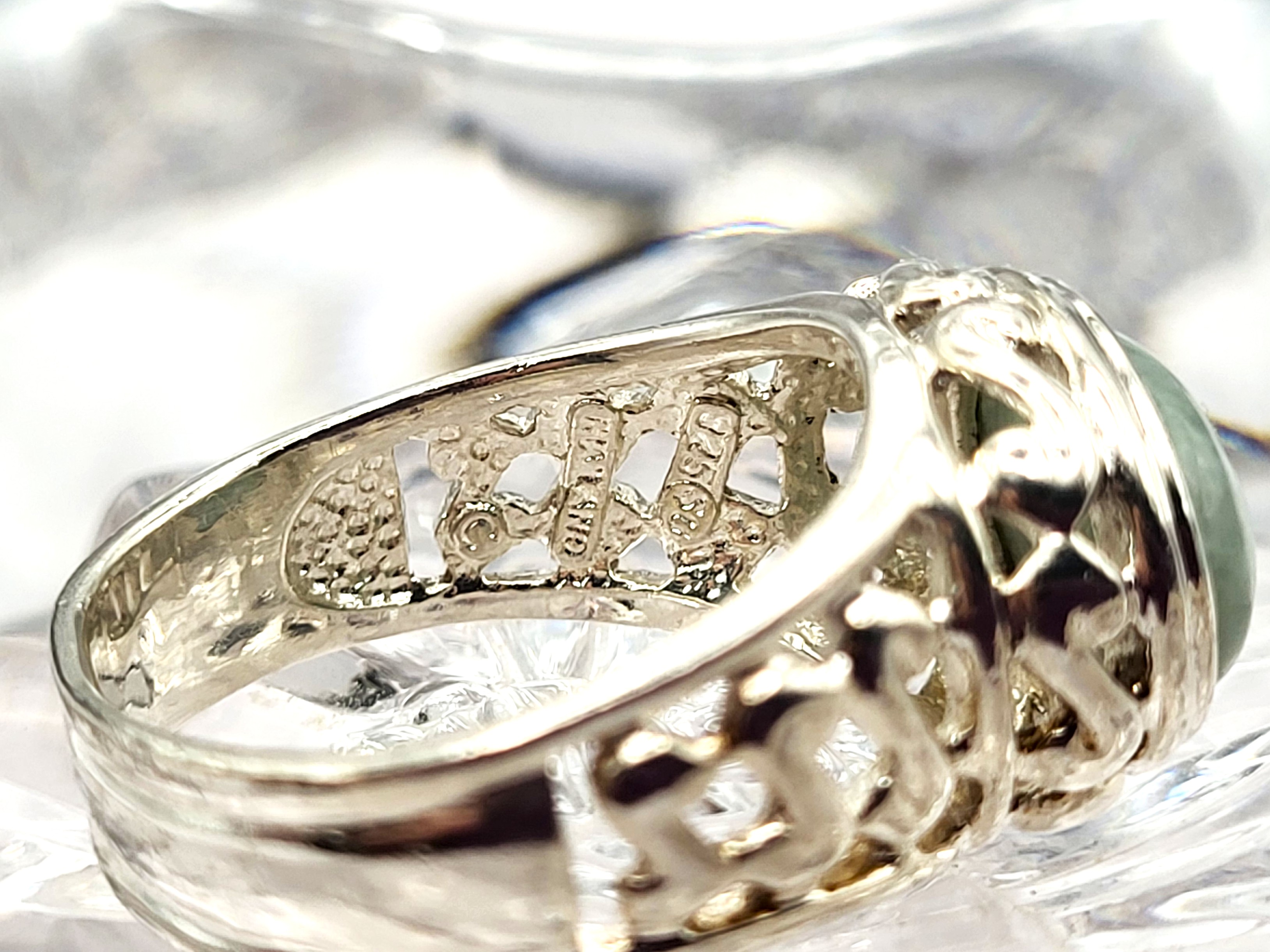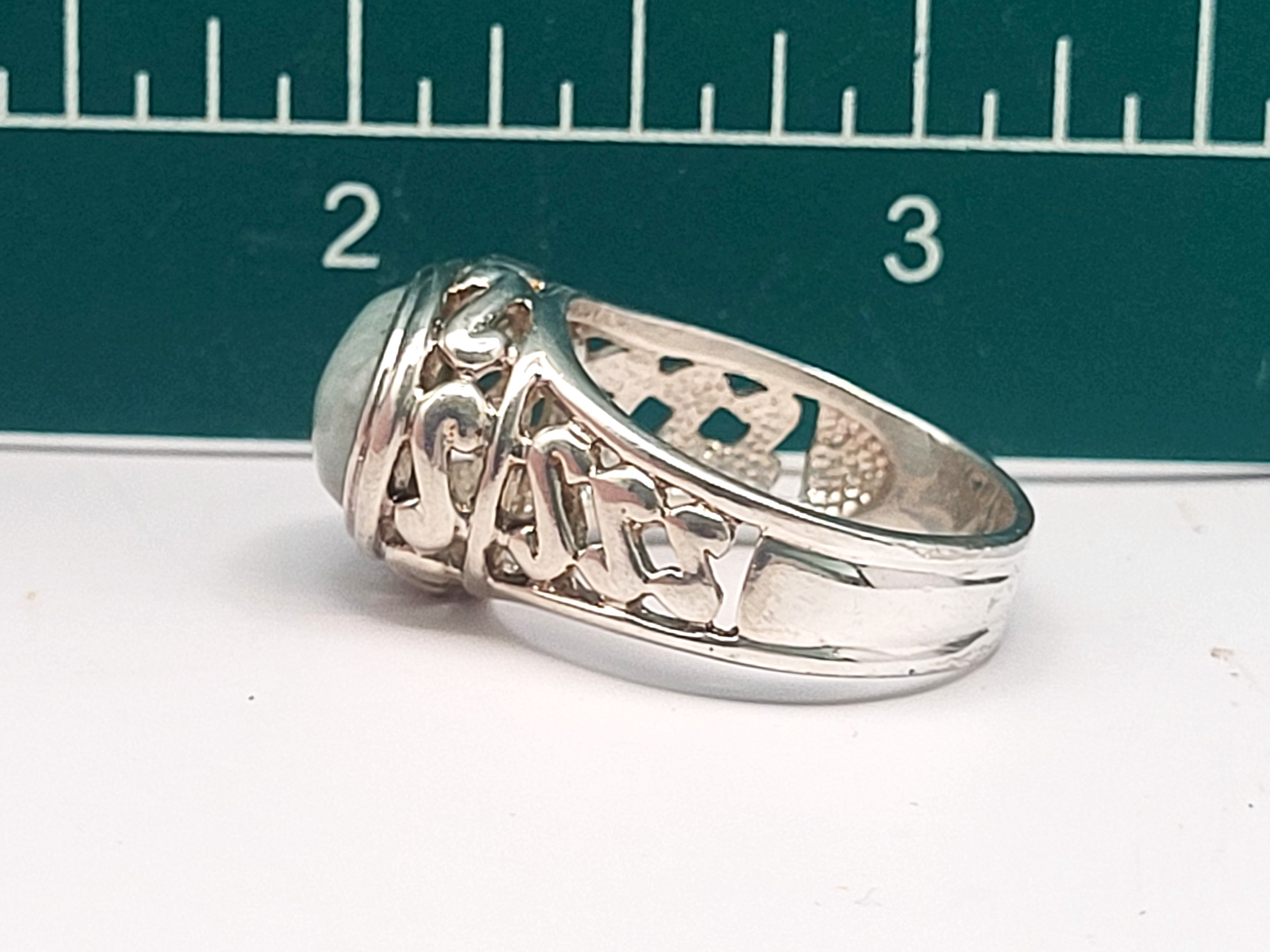 This sterling silver ring features an approximate 6.50 carat, oval cabochon, genuine, mottled green aventurine. The bezel-set aventurine rests on a sterling silver platform with open swirled designs and overlooks beautifully reticulated shoulders that taper to a solid 5.85mm shank. This ring is US size 9.5 and can be sized. See below for sizing options. This ring is appropriate for either a man or a woman. Admin: KSLH24/wr