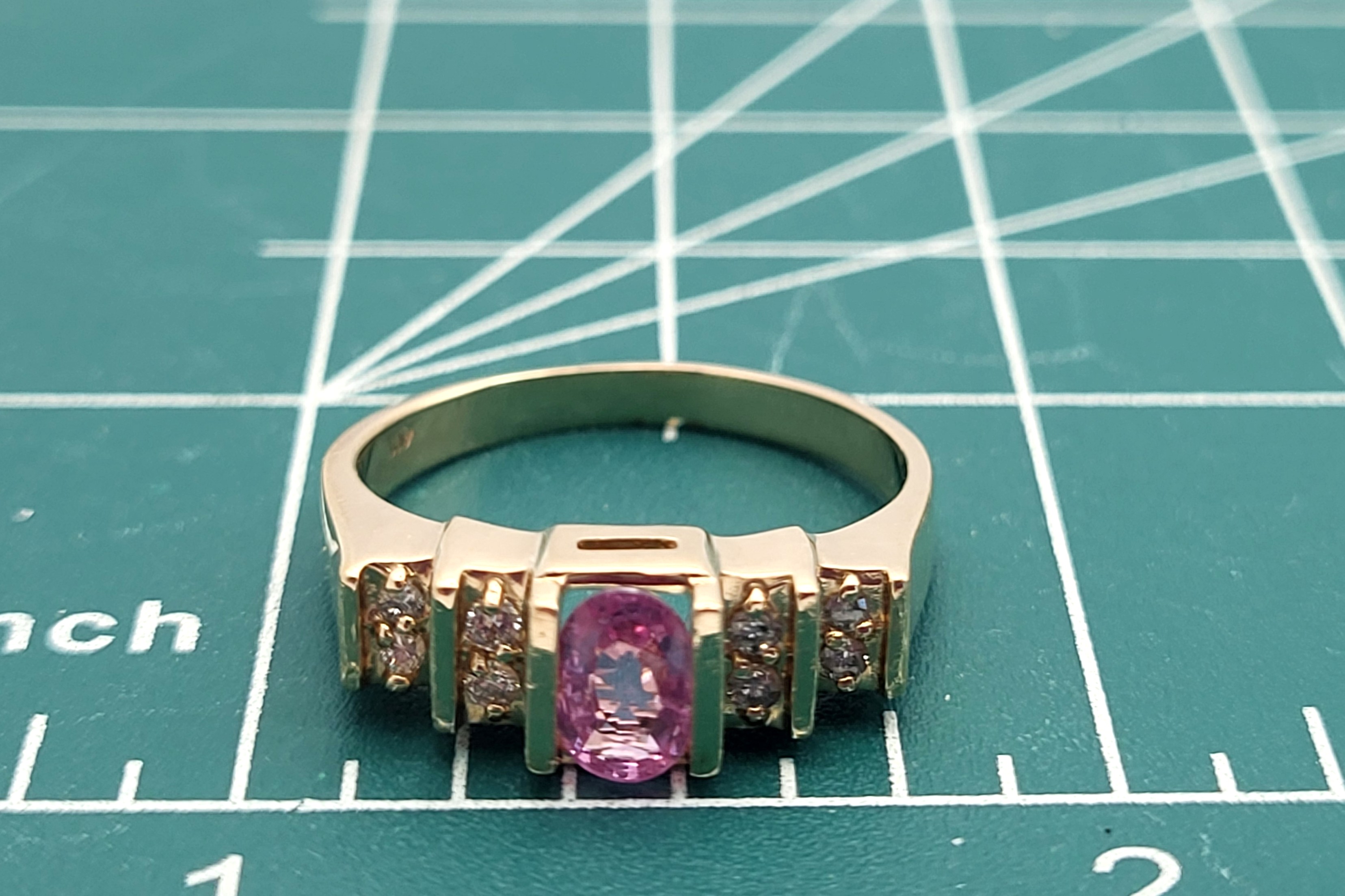 This is a 14 karat yellow gold ring that offers a tension-mounted .60 carat oval-cut, genuine pink sapphire and .16 carats of round, brilliant-cut, H-I color, SI2-I1 clarity, tension-mounted diamonds on the stepped shoulders. The ring is approximately 6.25mm wide at the top with polished shoulders that taper to the shank. The ring is US size 7.5, sizing details are listed below. Admin: G11241/8itt