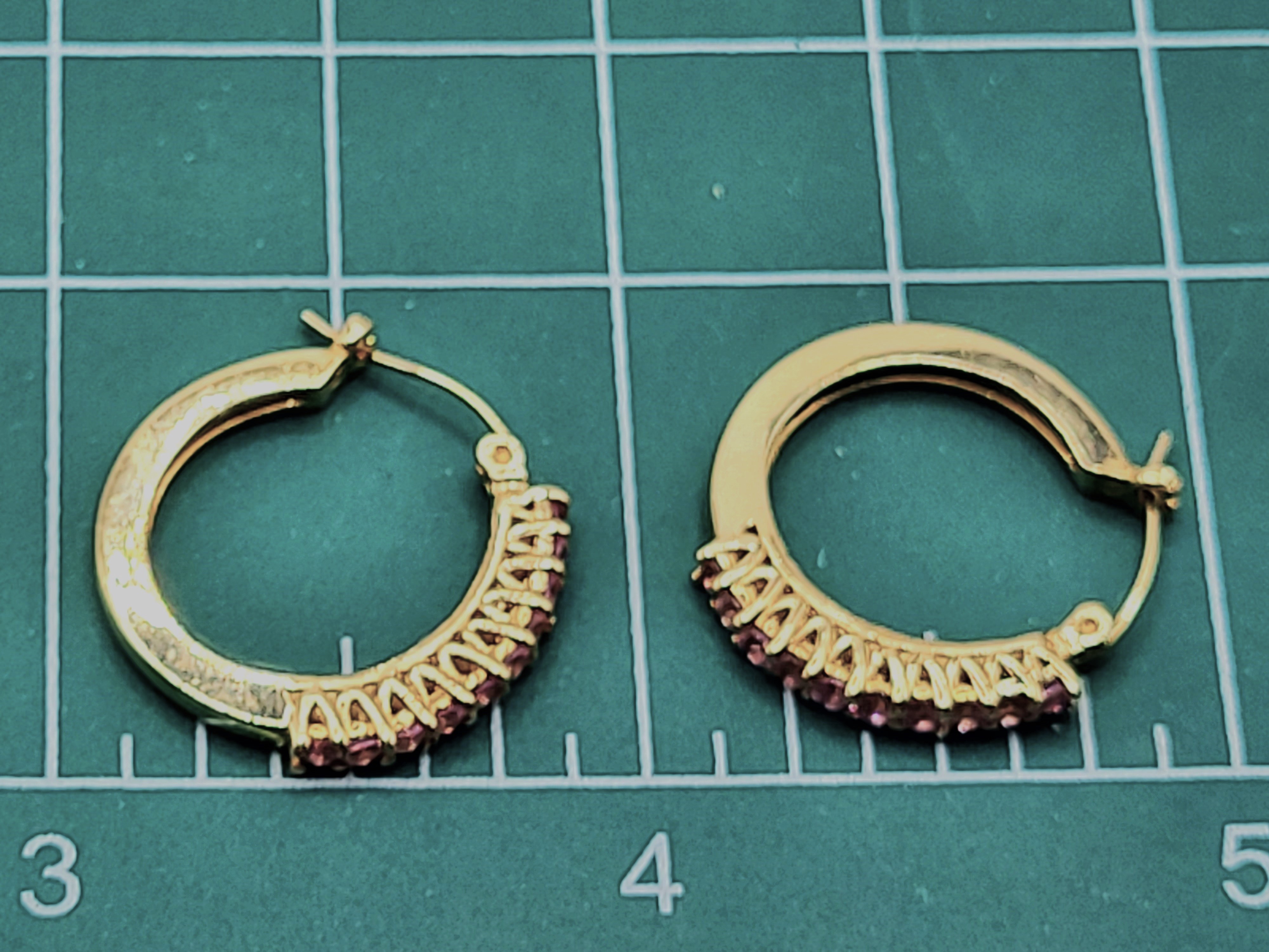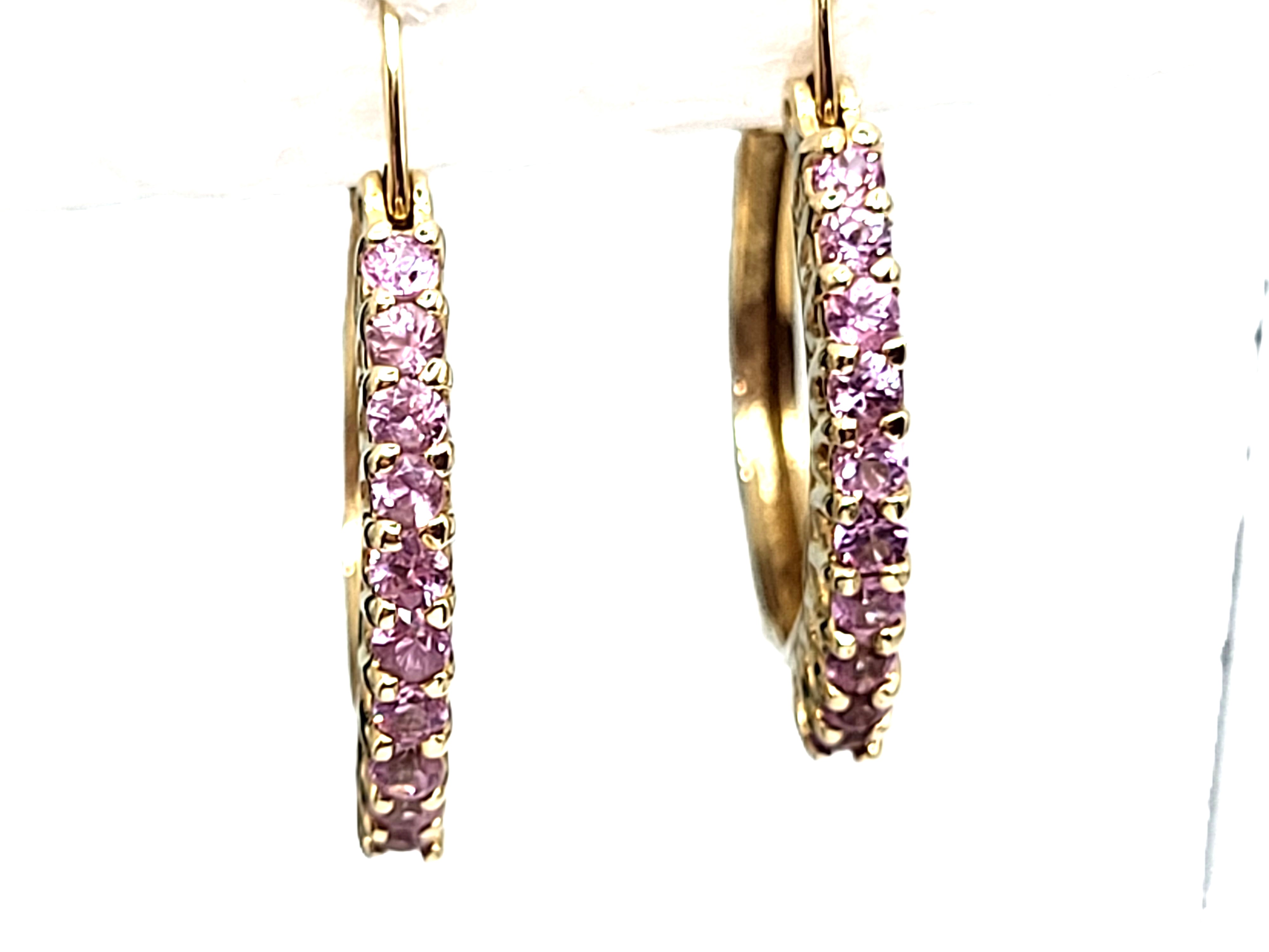 What a great pair of earrings for everyday wear! They are a modest size, at 3/4" diameter, yet sturdy, at 2mm wide and 2.38mm thick. These 14 karat yellow gold earrings have .85 carats total weight of round faceted, prong-set, genuine pink sapphires along the fronts. These earrings attach to the earlobe with hinged posts that lock in the back. Both earrings have a very solid "snap" upon closing! This is a brand new item with manufacturer’s approval to sale in a public auction. It is in excellent condition, but may have fine scratches from shipping or storage. Admin: G11241/33iit