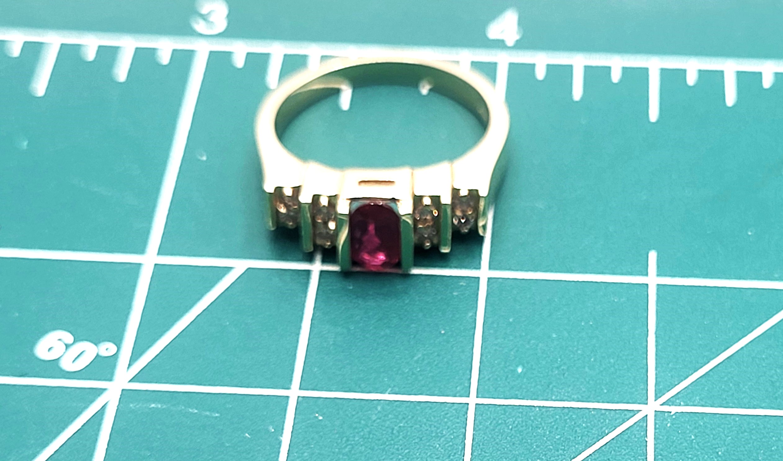 This is a 14 karat yellow gold ring that features an approximate .60 carat oval-cut, tension-set, genuine ruby with approximately .16 carats of round, brilliant-cut, H color, SI2-I1 clarity diamonds in the stepped shoulders that taper to an approximate 2.25mm shank. This ring is US size 7 and can be sized for an additional charge. 100021/4.1G