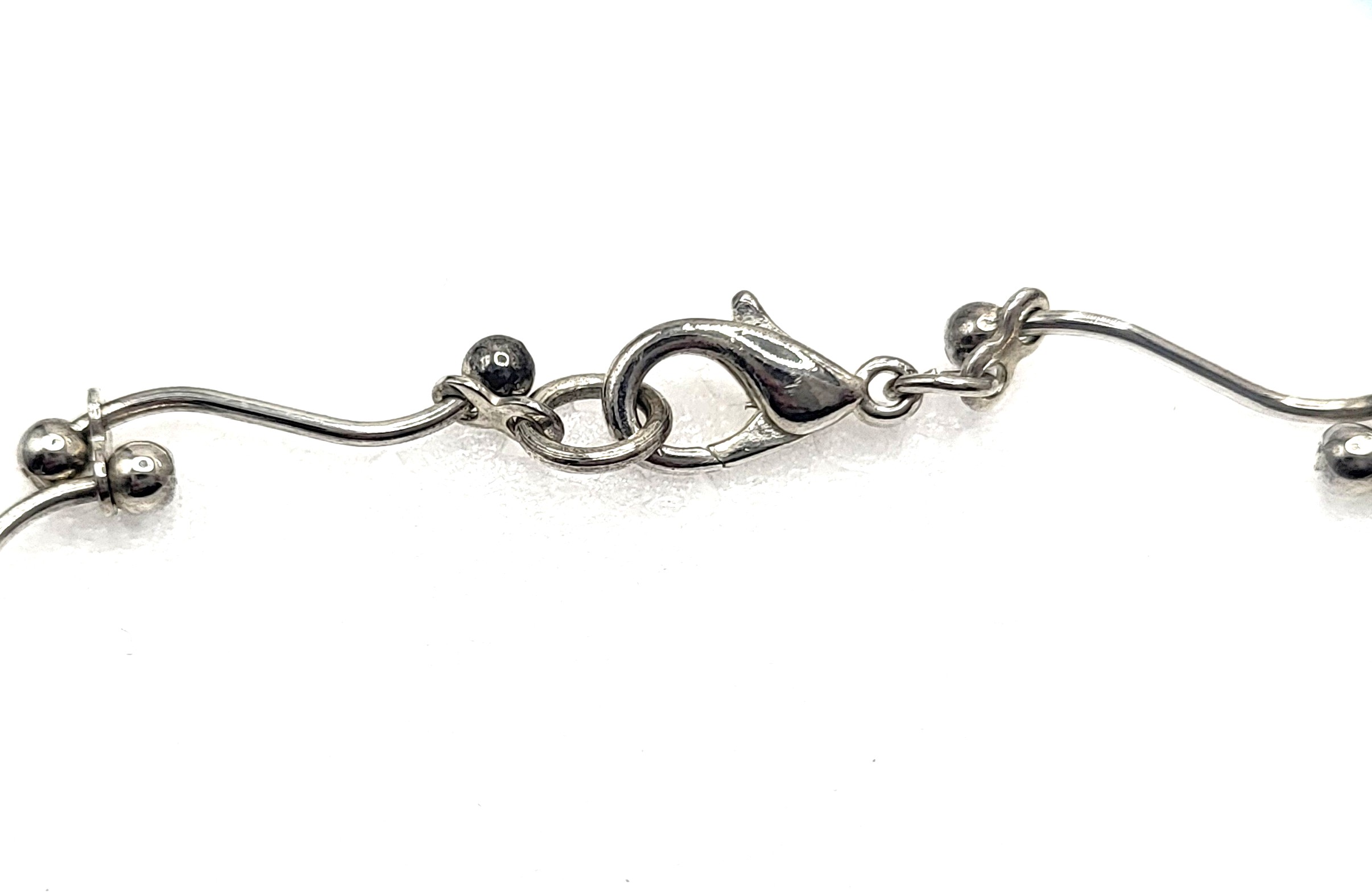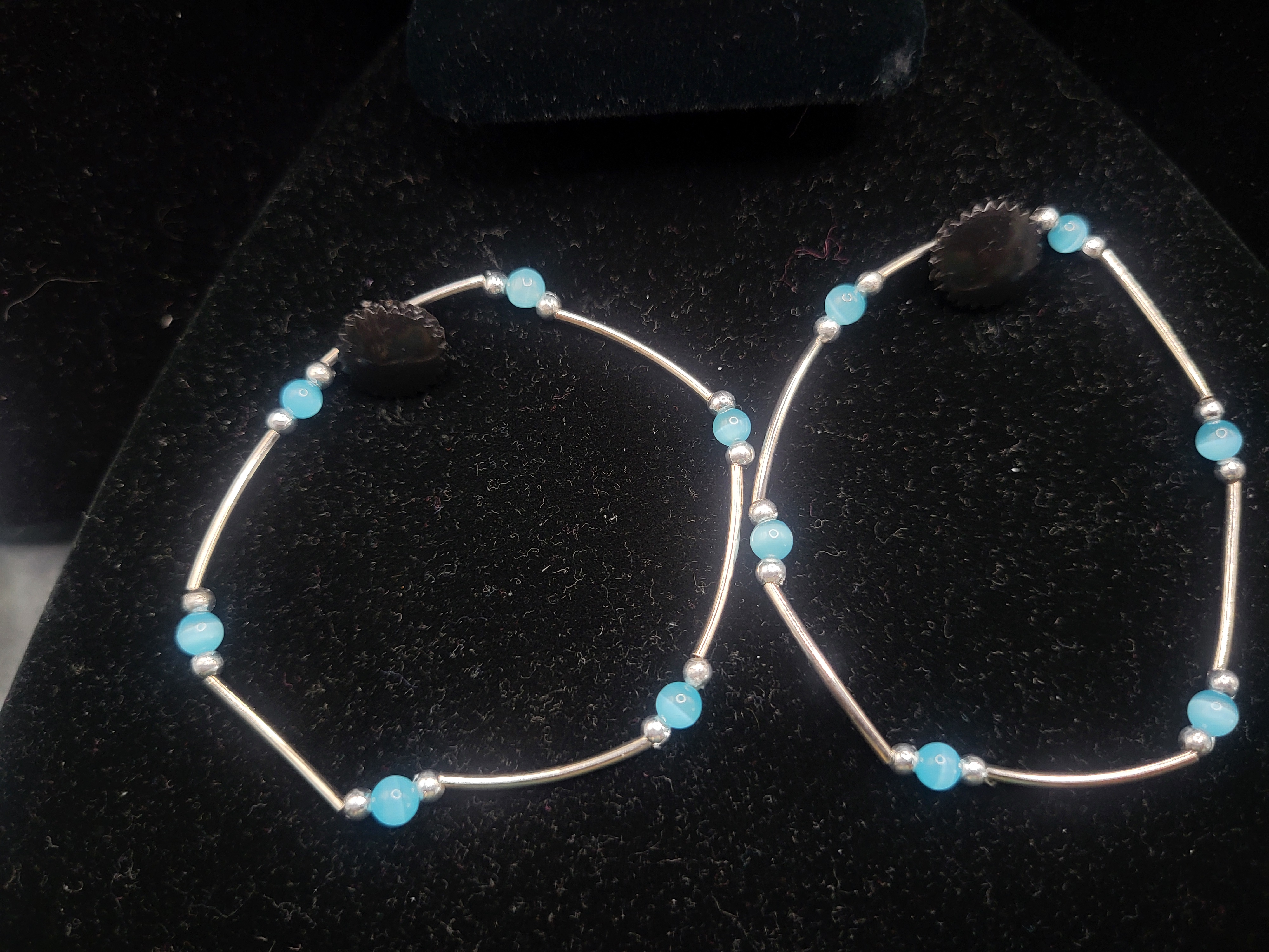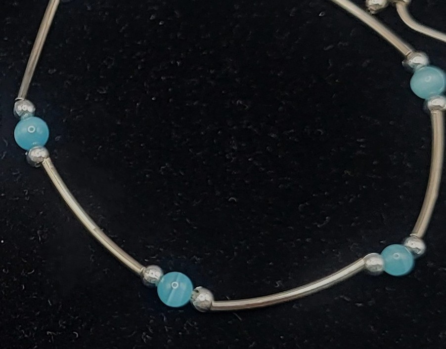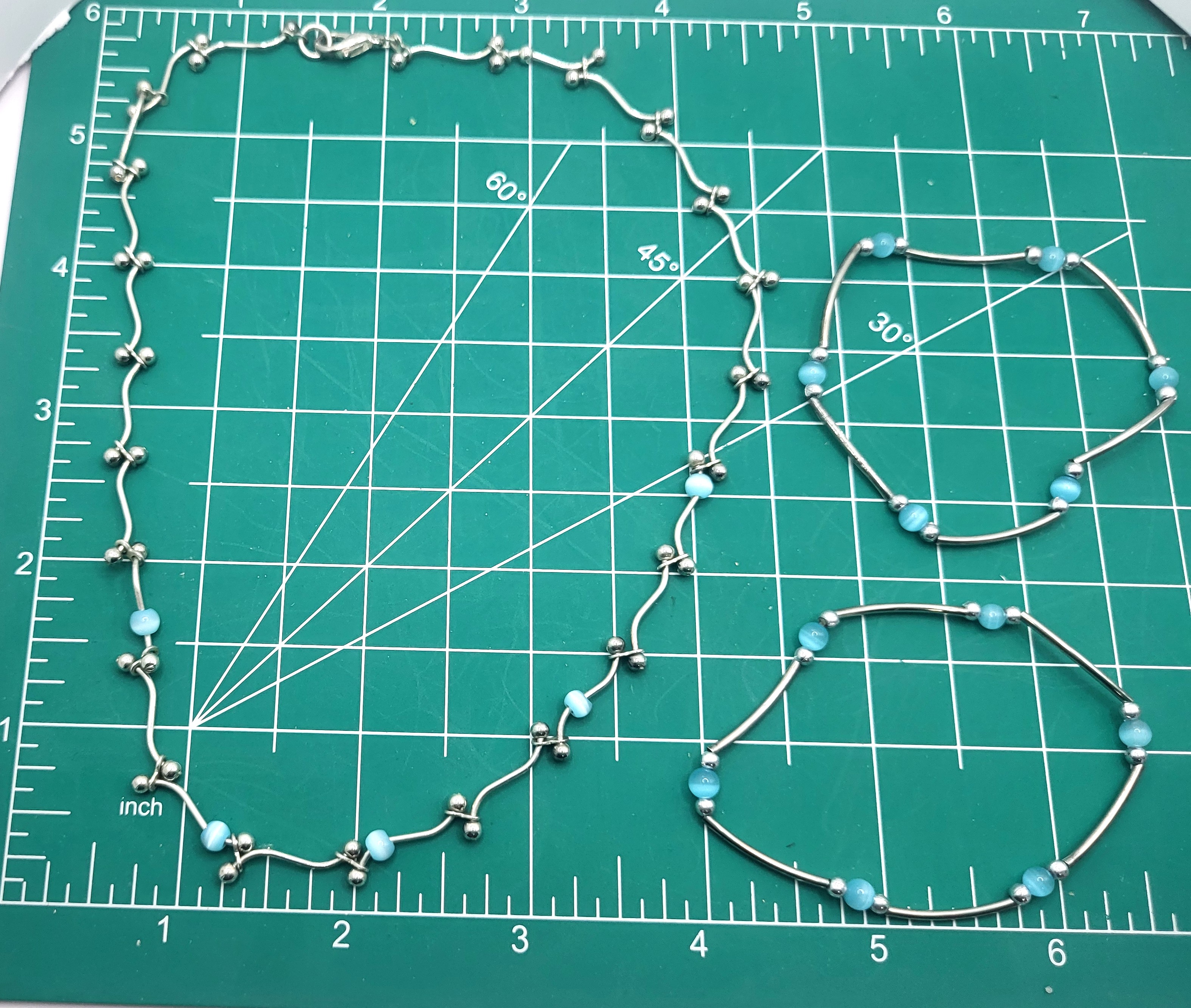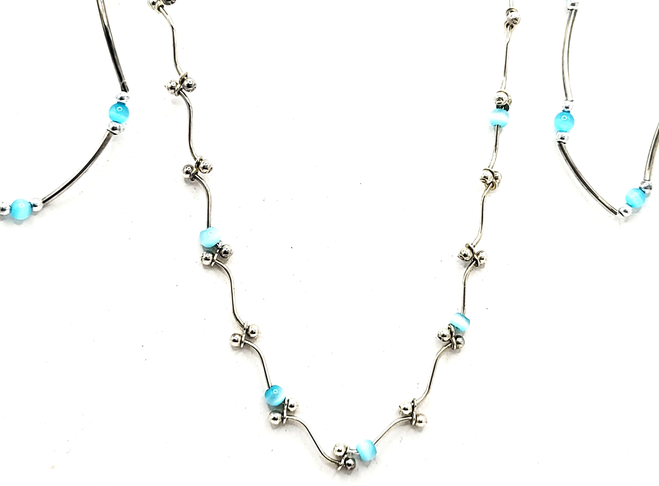 This sterling silver jewelry set includes two bracelets and one necklace. Both bracelets feature approximate 4-4.5mm beads of blue chrysoberyl, also called blue cat’s eye (most likely lab-created) and 2.75mm sterling silver beads that separate sterling silver tubes. Each segment of the combination is approximately 1" long and strung on elastic cord, making 2-7" bracelets. The necklace also features the lab-created blue cat’s eye and sterling silver beads and tubes, but the tubes in this necklace are tilda-shaped. The segments on the necklace are approximately 3/4" and connect to each other through an attached coupler. The necklace is approximately 17" with a lobster clasp. Admin: 33119-21bh
