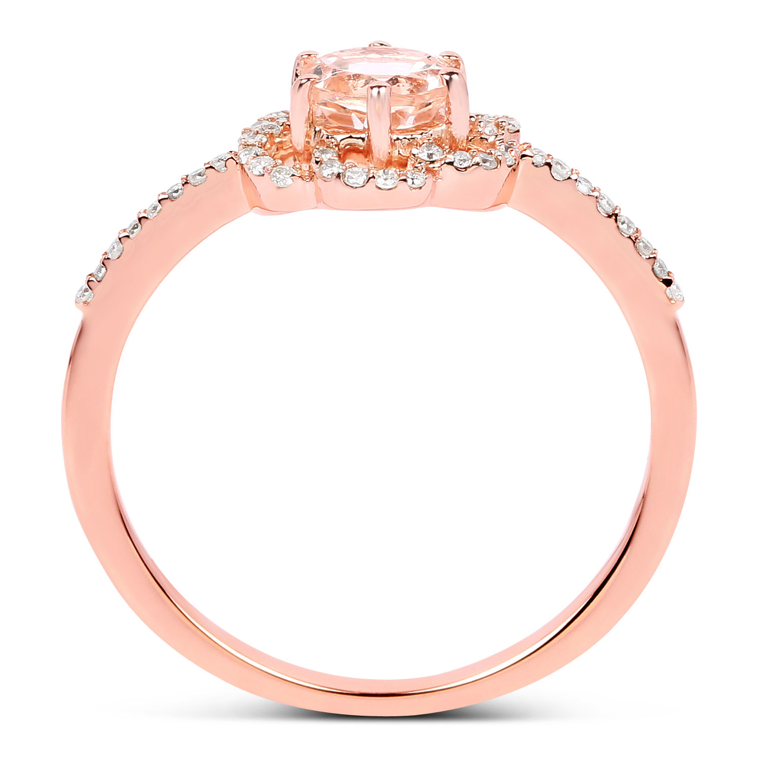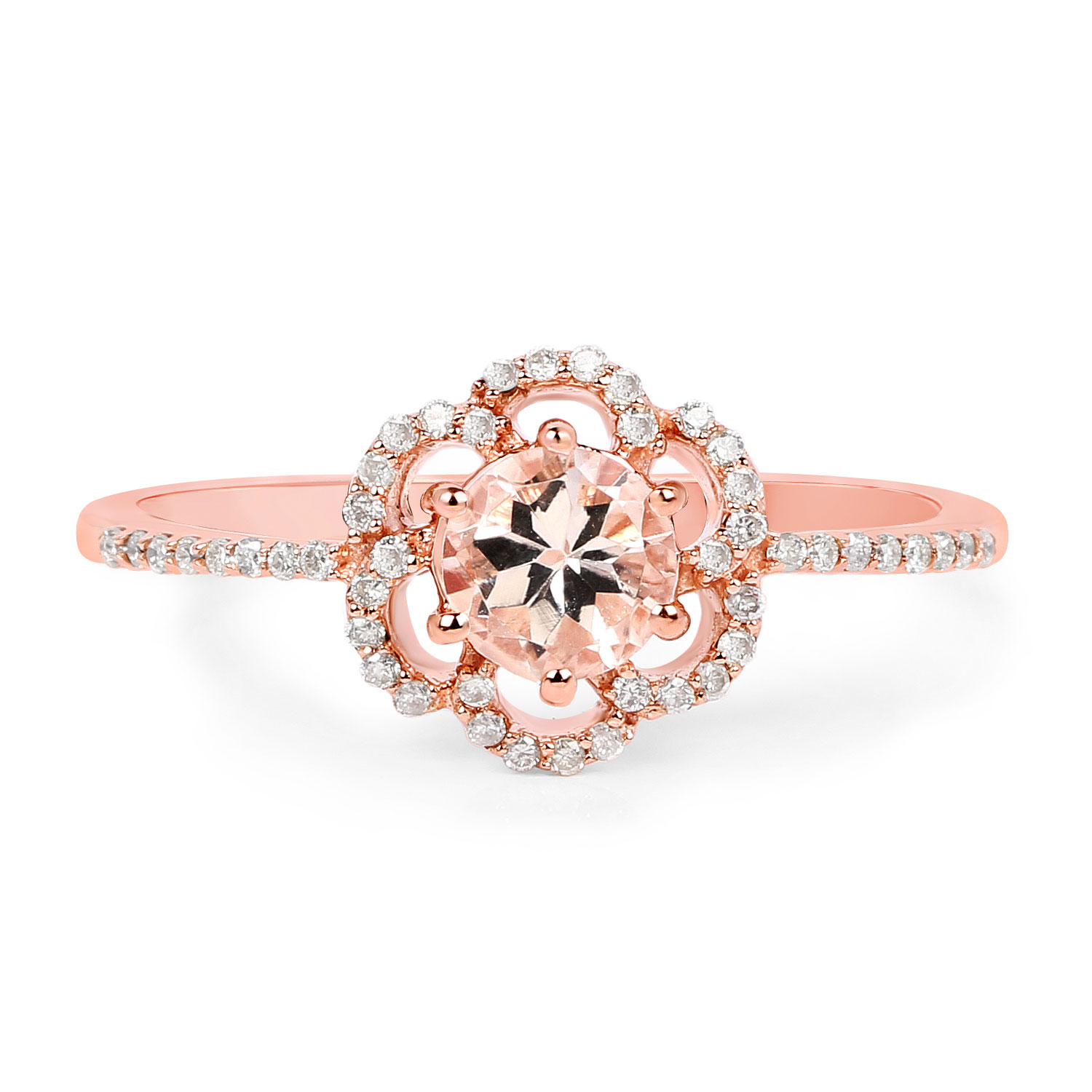 This 14 karat rose gold ring will be the standout in your stacker collection. The .41 carat, round, faceted, genuine Morganite is prong-set with diamonds on the shoulders and in the flowerette frame. There is a total of .13 carats round, faceted, H-I color, I1 clarity diamonds in this ring. It is US size 8. Find sizing details and other important information below. AdminCode: Qiee