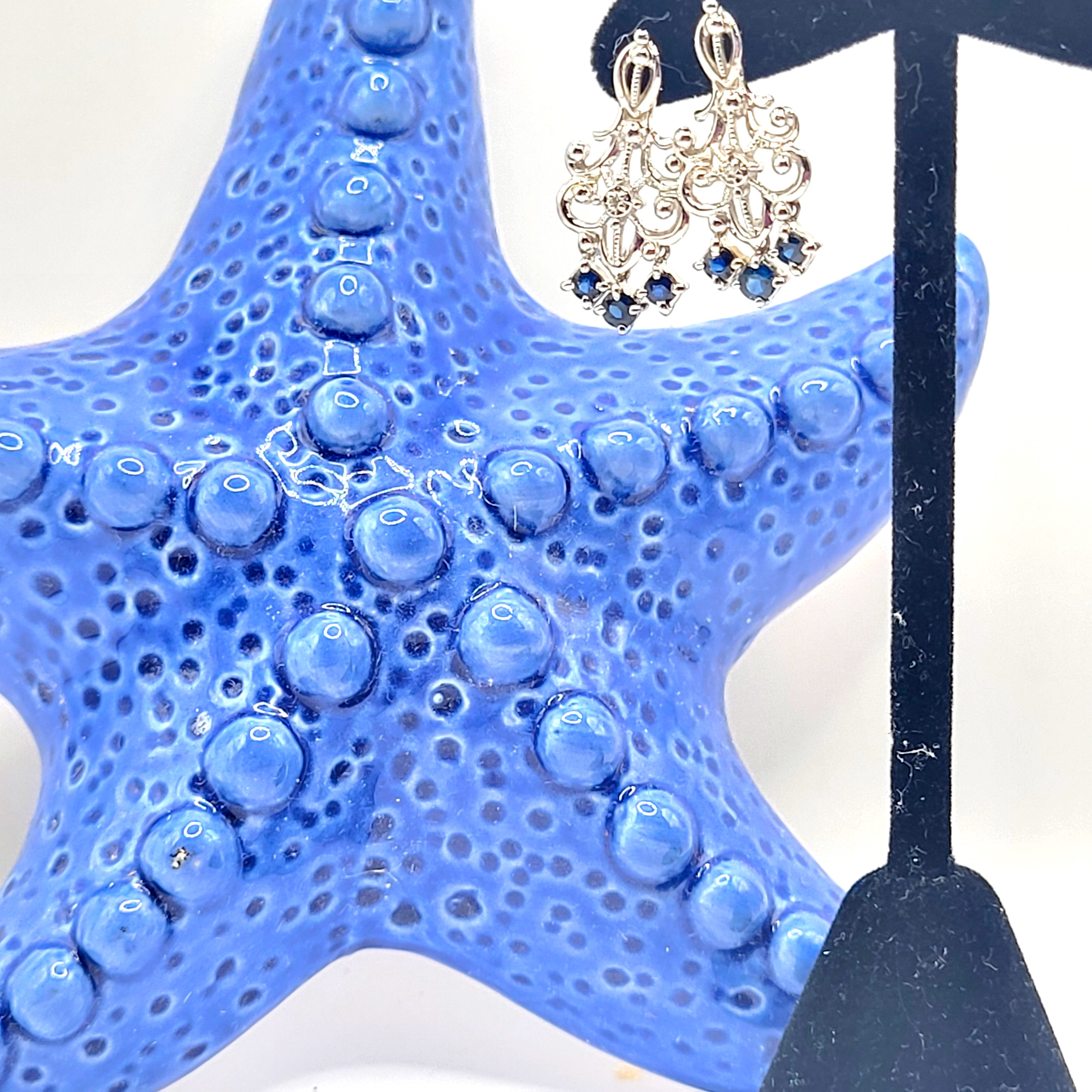 This pair of 14 karat white gold chandelier earrings dangle long enough to be flirty, but are short enough for more serious activities, like business meetings or parent-teacher day! They are adorned with .50 carats total weight of round, faceted genuine blue sapphires and accented with .01 carats total weight of round, faceted diamonds. They are approximately 7/8" long, 3/8" wide and attach to the earlobe with posts and friction backs. Admin: G11241/38lrt