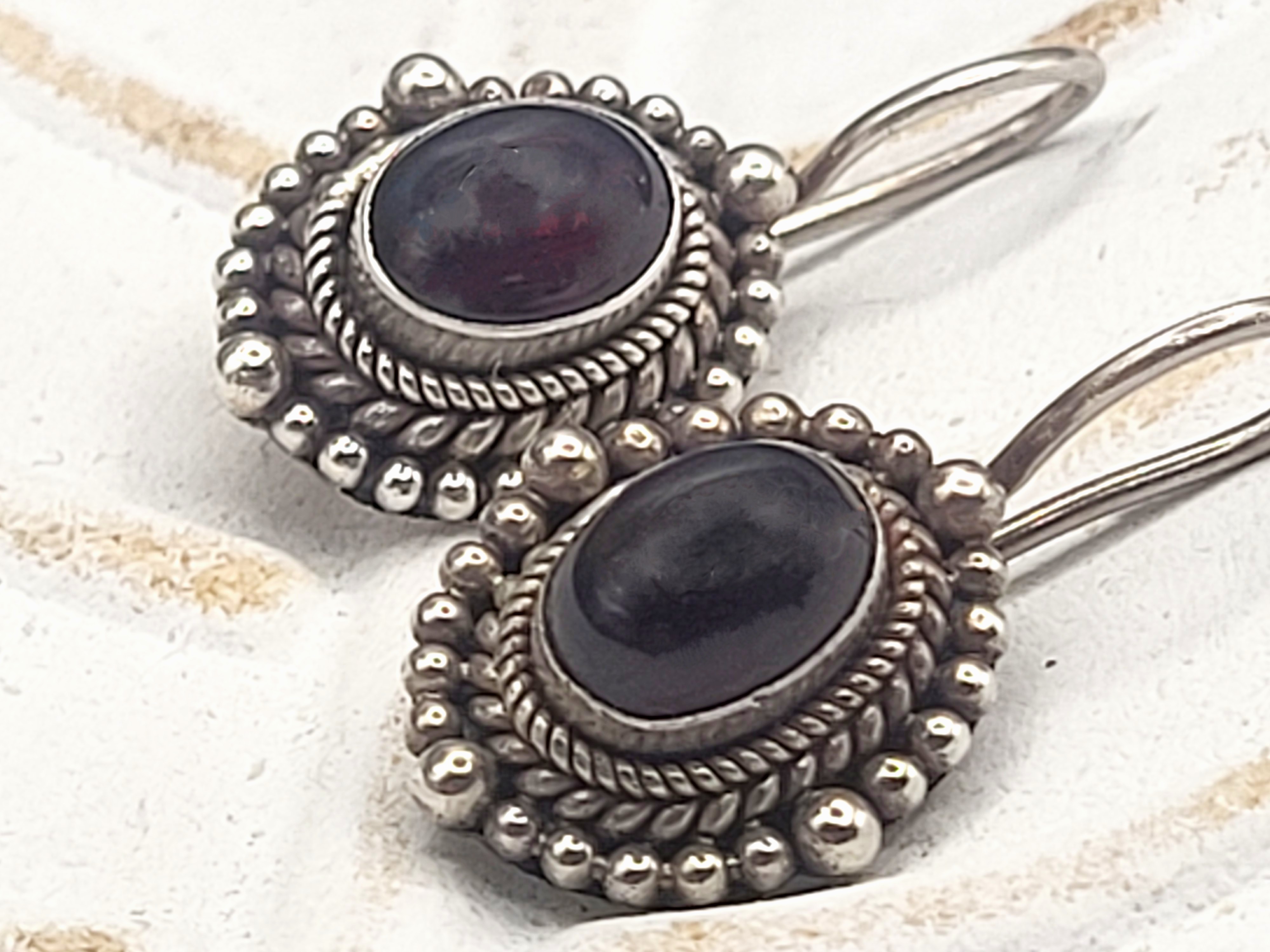 This is a pair of vintage sterling silver drop earrings, featuring approximately 1.50 carats total weight of oval, cabochon, bezel-set genuine rhodolite garnet. The rhodolites are centered in a frame with a twisted wire border around the base of the bezel and hand-crafted beadwork on the rim with smaller beads between four larger beads at compass points. The earrings attach to the earlobe with a rigid hook. Admin: 82/A8
