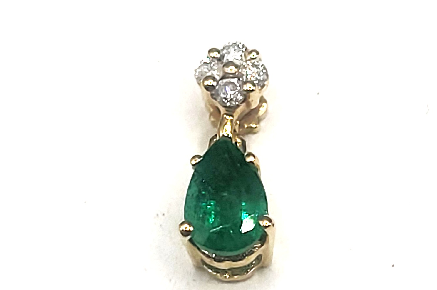 This is a 14 karat yellow gold pendant that features an approximate .35 pear-cut , prong-set emerald that dangles below approximately .05 carats total weight of round, brilliant-cut, H-I color, SI2-I1 clarity diamonds. This pendant is approximately 1/2" long and has a hidden bail that can accommodate an approximate 2.5mm chain. Admin:33109/3ng