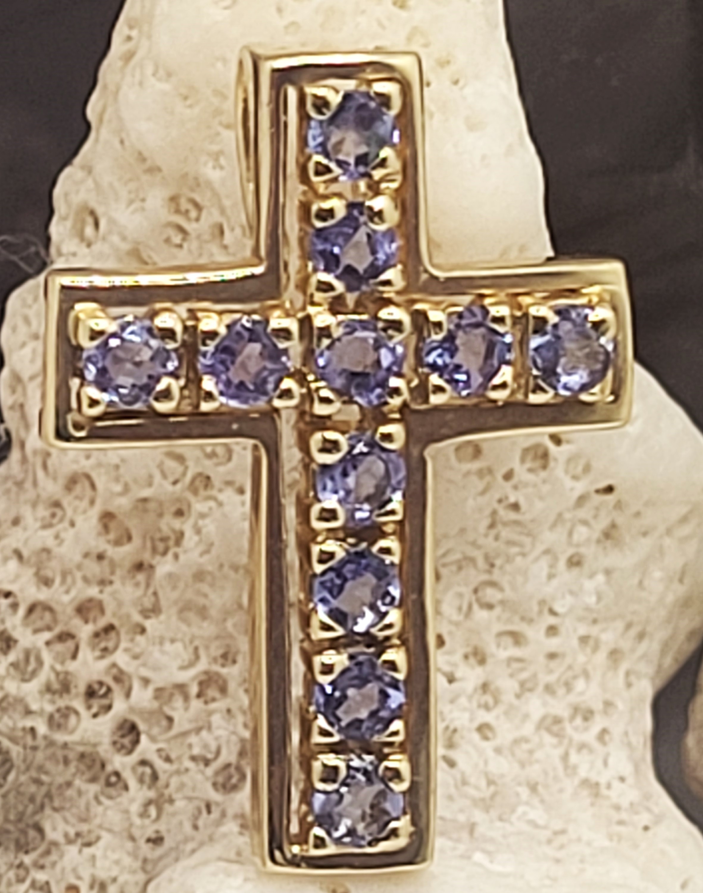 This 14 karat yellow gold pendant features .64 carats total weight of round, faceted, genuine purple tanzanite. The cross is approximately 7/8" long, 3/16" wide, and 1.75mm thick with a hidden rabbit ear bail to create a slide style pendant. The bail can accommodate up to an approximate 3mm thick chain. This is a brand new item approved by the manufacturer for sale to the public, by auction. It is in excellent condition, but may have fine scratches from shipping or storage. Admin: G11241/20btt