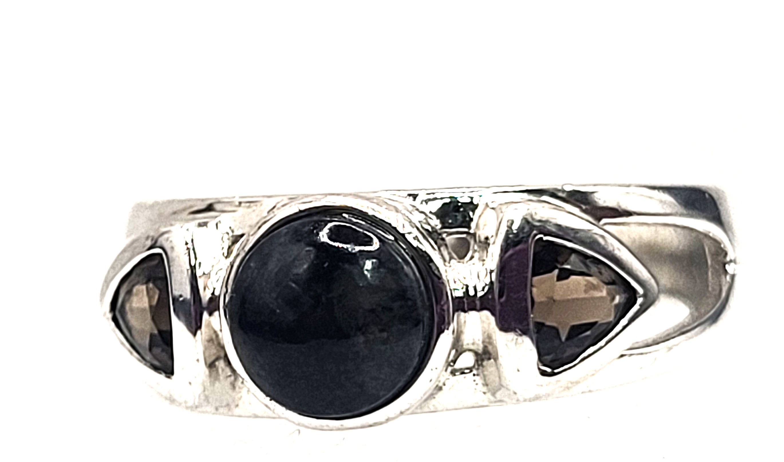 This is a STERLING SILVER ring that features a cabochon center amethyst and trilliant-cut citrine adjacent. The open (split) shoulder design and the bezel-set gemstones make an attractive ring for a man or a woman The ring is US size 9.75 can be sized by a professional jeweler. It does not appear to have a protective finish that would hinder sizing. Admin: KMEL3/lg