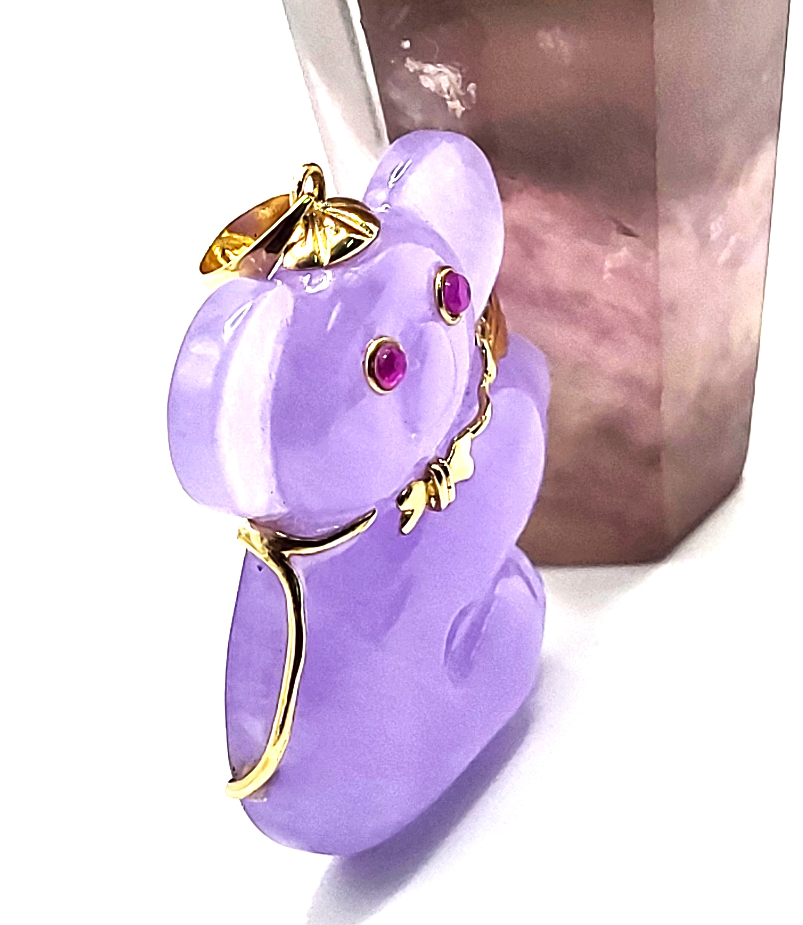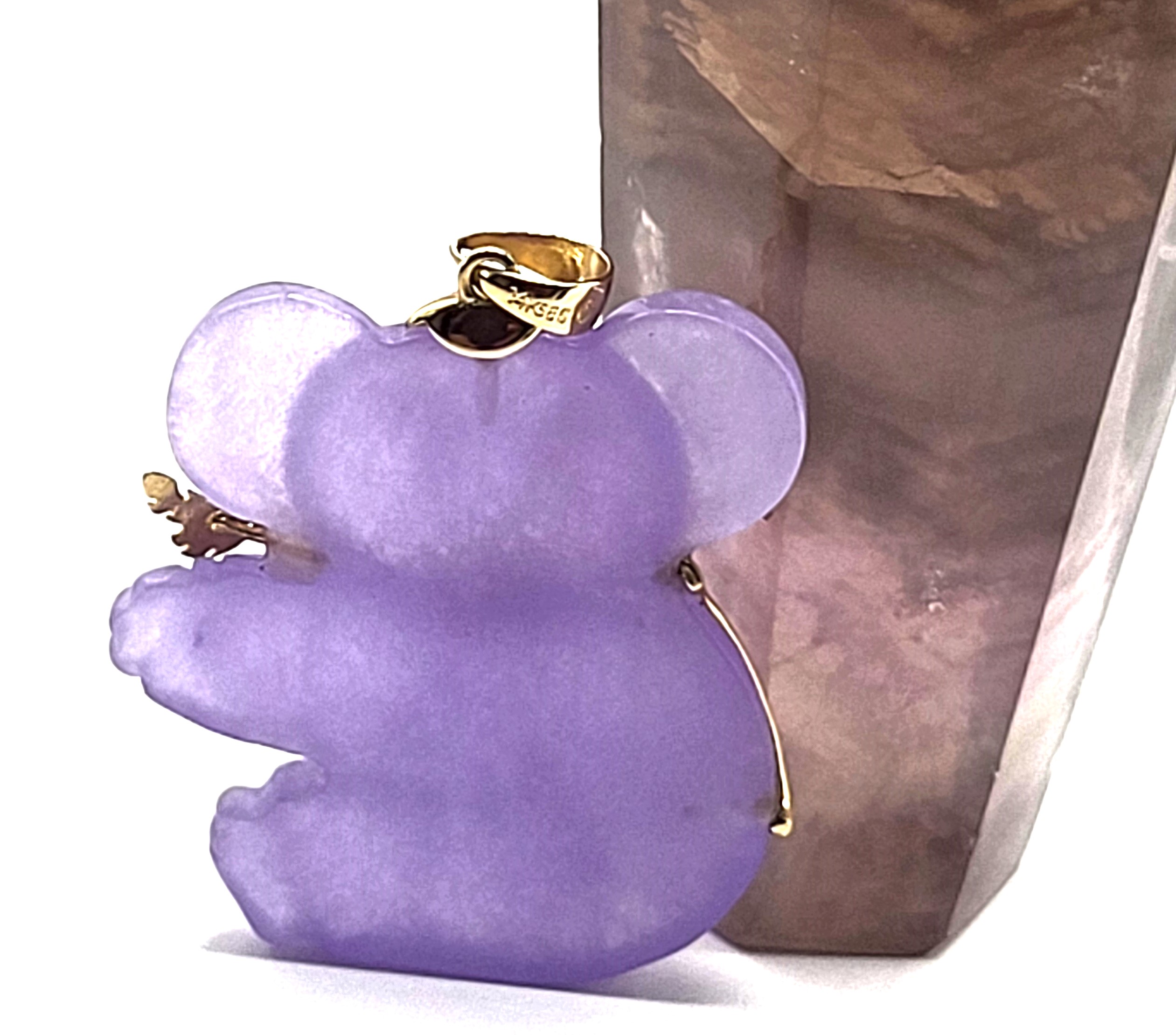 You will love this 14 karat yellow gold pendant with a Koala bear, carved from Lavender Jadeite with approximately .10 carats total weight of round, faceted, genuine rubies for the eyes. The pendant is approximately 1.25" x 1.25" and the bail can accommodate an approximate 3.5mm chain.