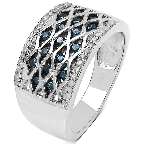 This sterling silver ring has a peek-a-boo appeal with the lattice pattern, exposing the blue diamonds and the white diamonds lining the borders. There are .41 carats total weight of blue and white, round, brilliant-cut, I2-I3 clarity diamonds. The wide band is approximately 11mm at the top, tapering to a 4mm shank. The ring is US size 7.25. Admin: KQ86371/11ae