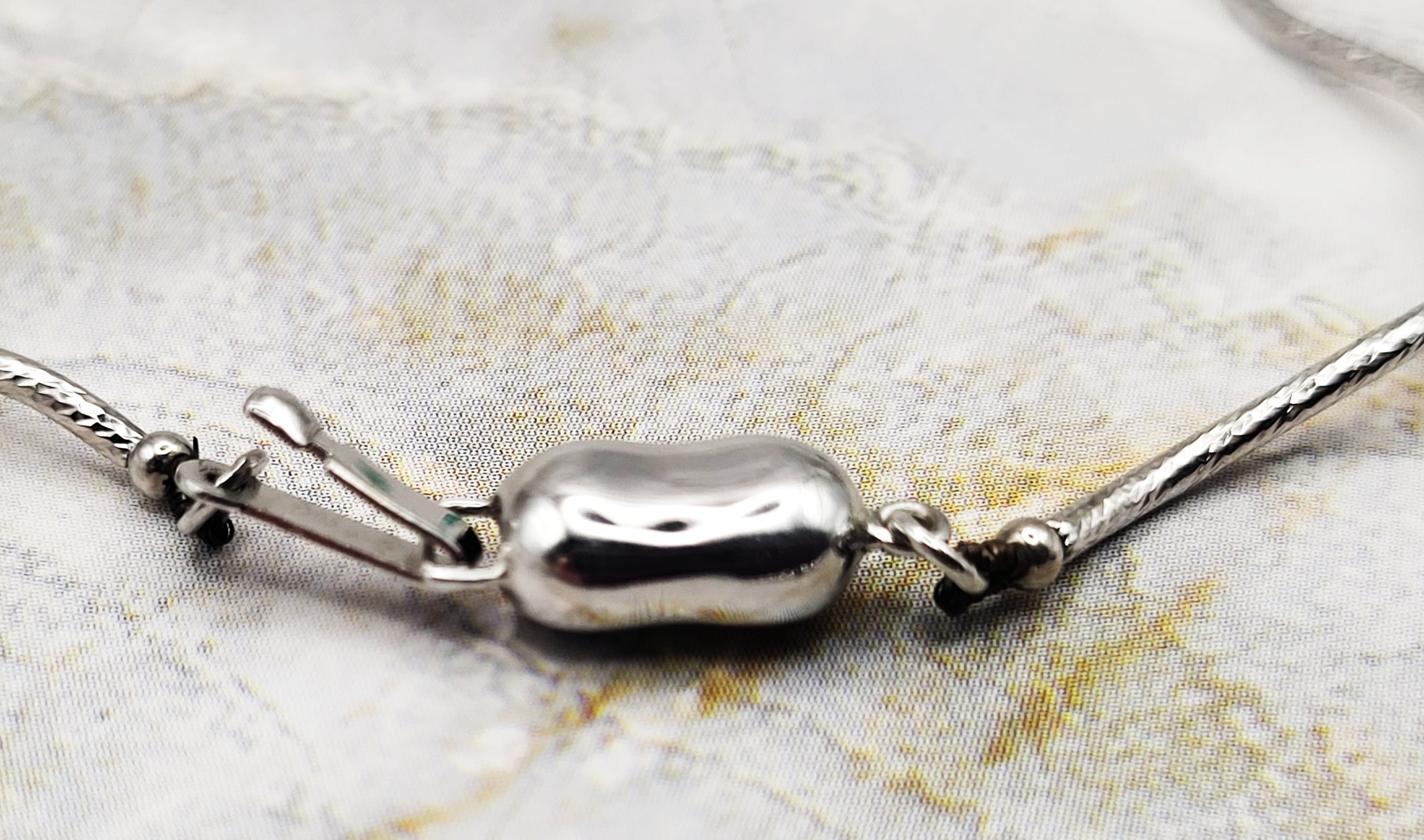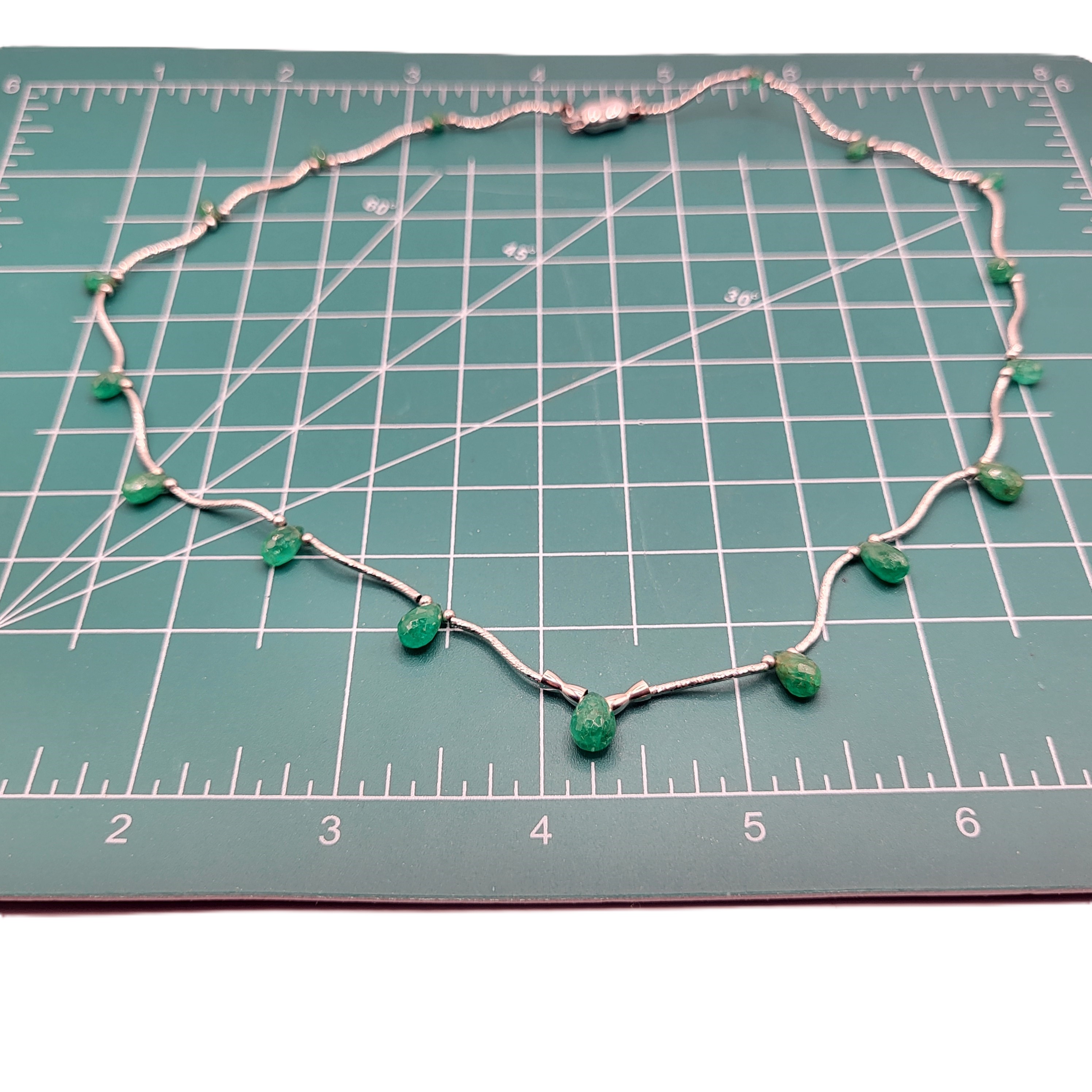 This necklace is constructed with beautifully etched, 14 karat white gold, curved, hollow tubes that are strung onto a silver-colored cable (unknown metal, may be white gold).  Each segment is separated by 14 karat white gold beads and briolette-cut, teardrop-shaped, genuine emeralds for an approximate total of 5.00 carats. The necklace is 18" with a "bean" shaped plunger clasp.