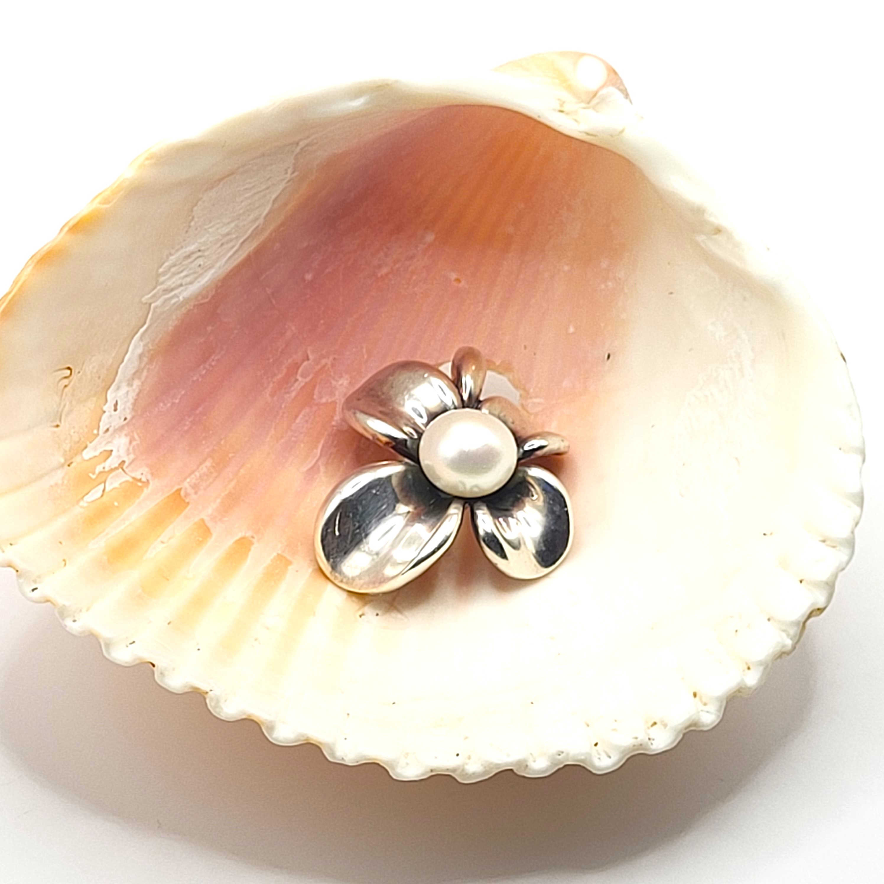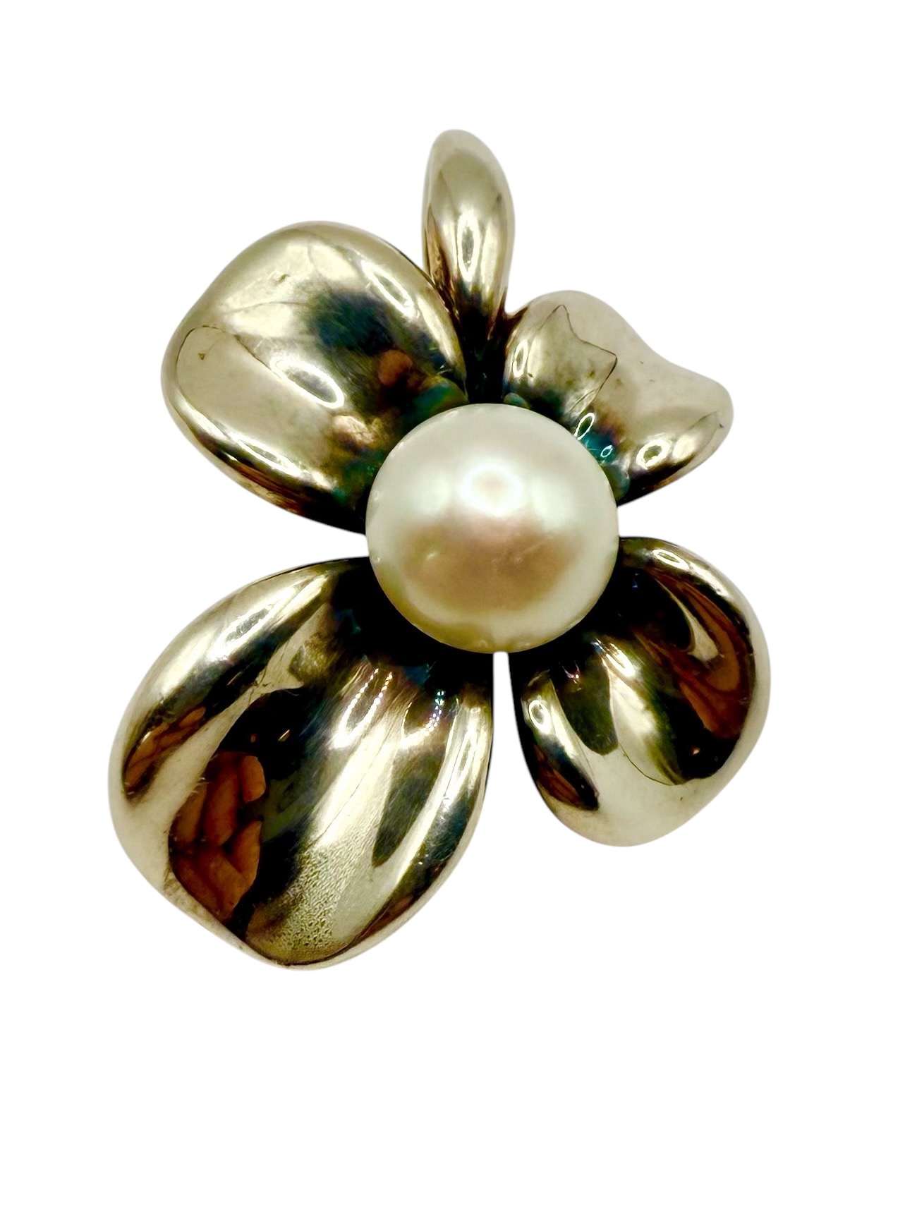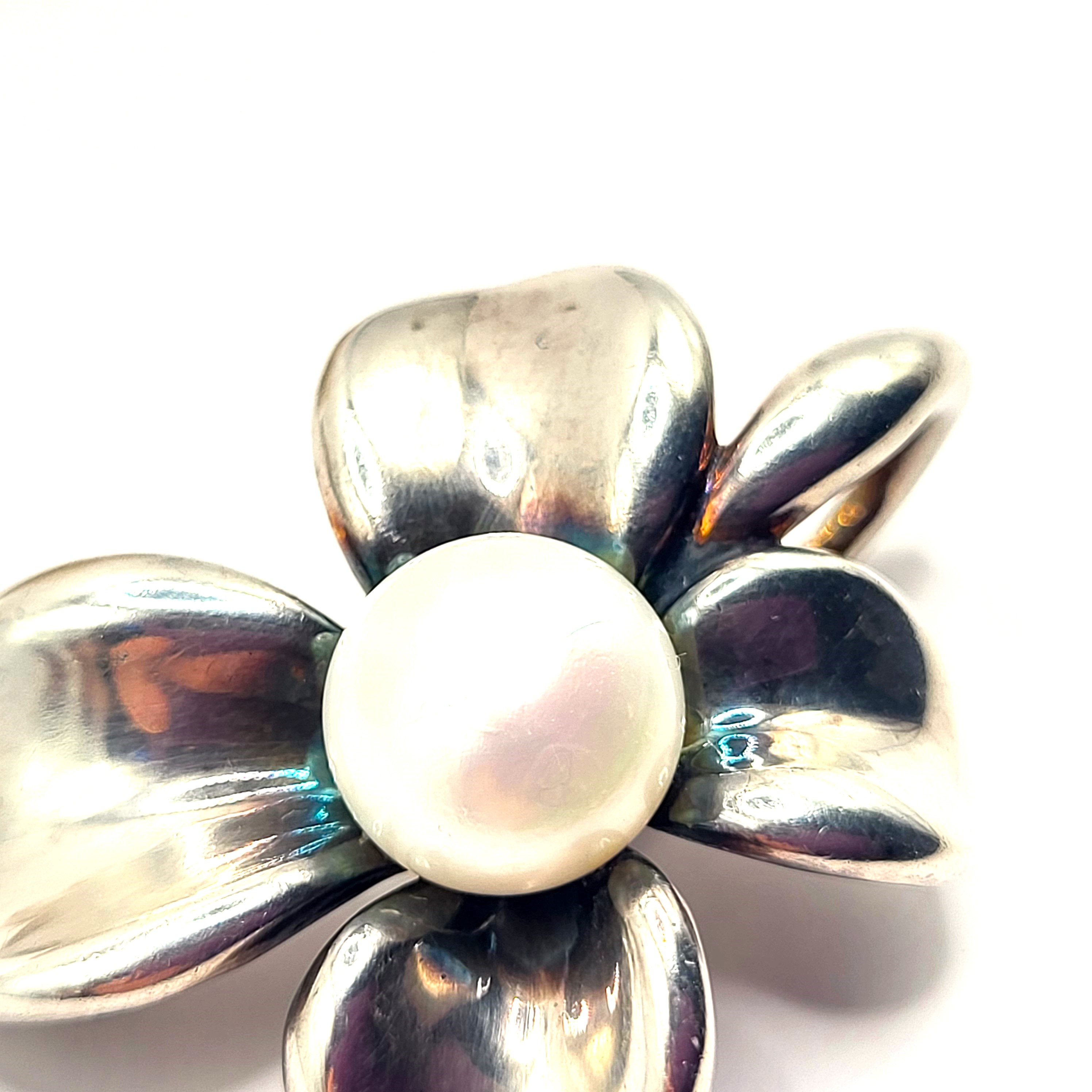 This sterling silver (.925) pendant, represents the figural dogwood flower bloom with an approximate 11x8mm, white, shimmery, button pearl in the center. The 15.06 grams freshwater pearl has a beautiful sheen that picks up on the surrounding colors. The pendant is approximately 1.75" long and 1.50" wide, it is 3-dimensional, and has a large, carabiner-syle bail, to also serve as an enhancer. This pendant bears the signature hallmark of Ann King, an award-winning jewelry designer. Admin: F1226/19d-hhh