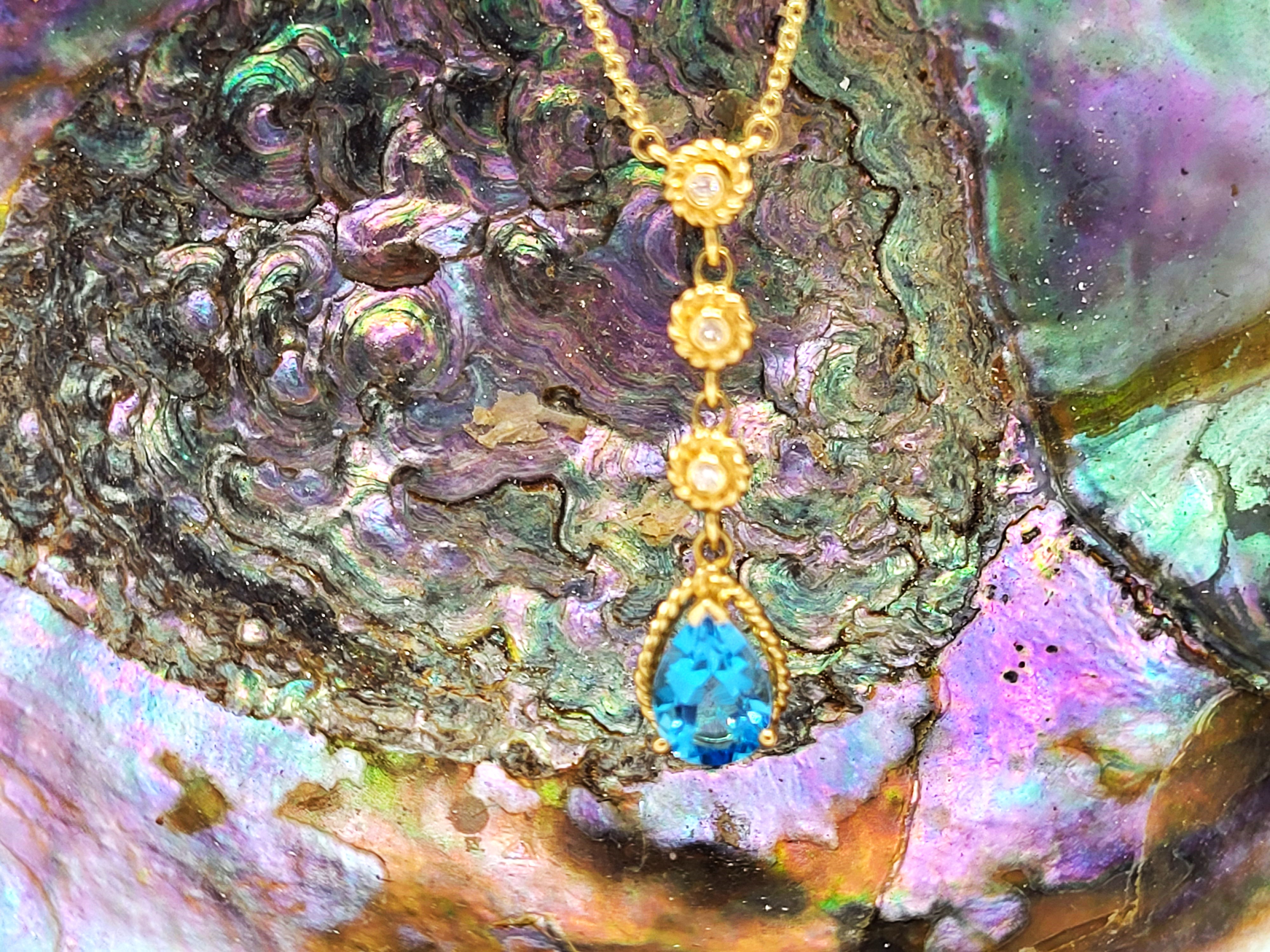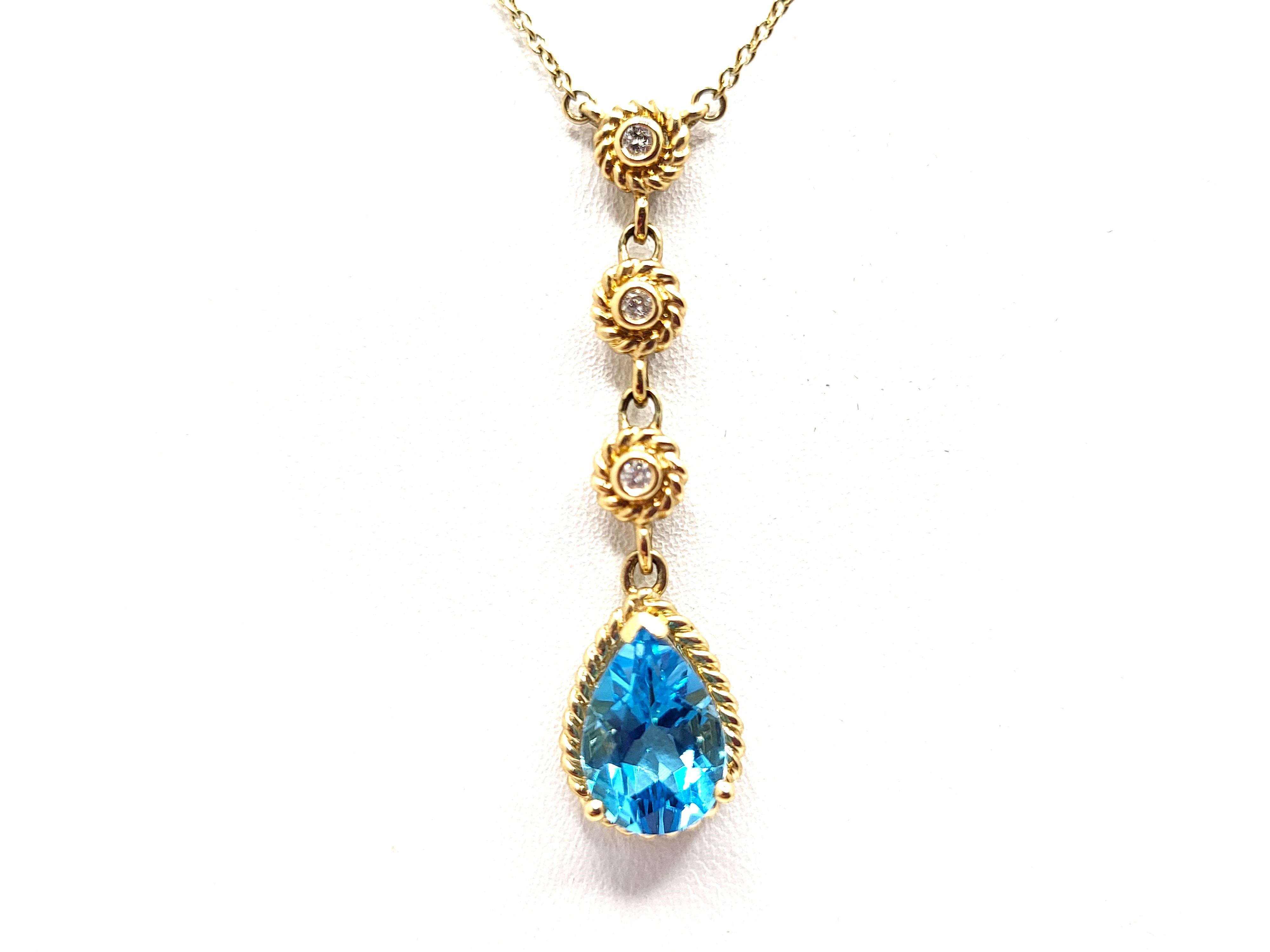 This is a 14 karat yellow gold lavalier style necklace that focuses on a 2.29 carat pear-cut, prong-set, genuine Swiss Blue Topaz. This mesmerizing gemstone is framed with yellow gold twisted rope. It dangles from a 16" fine link chain that has a lobster clasp and .14 carats total weight of round, brilliant-cut, H color, SI2-I1 clarity, bezel-set diamonds that are stationed throughout the necklace in twisted rope frames. The pendant dangles approximately 1.5" from the center of the chain. Admin: G11241/44nat