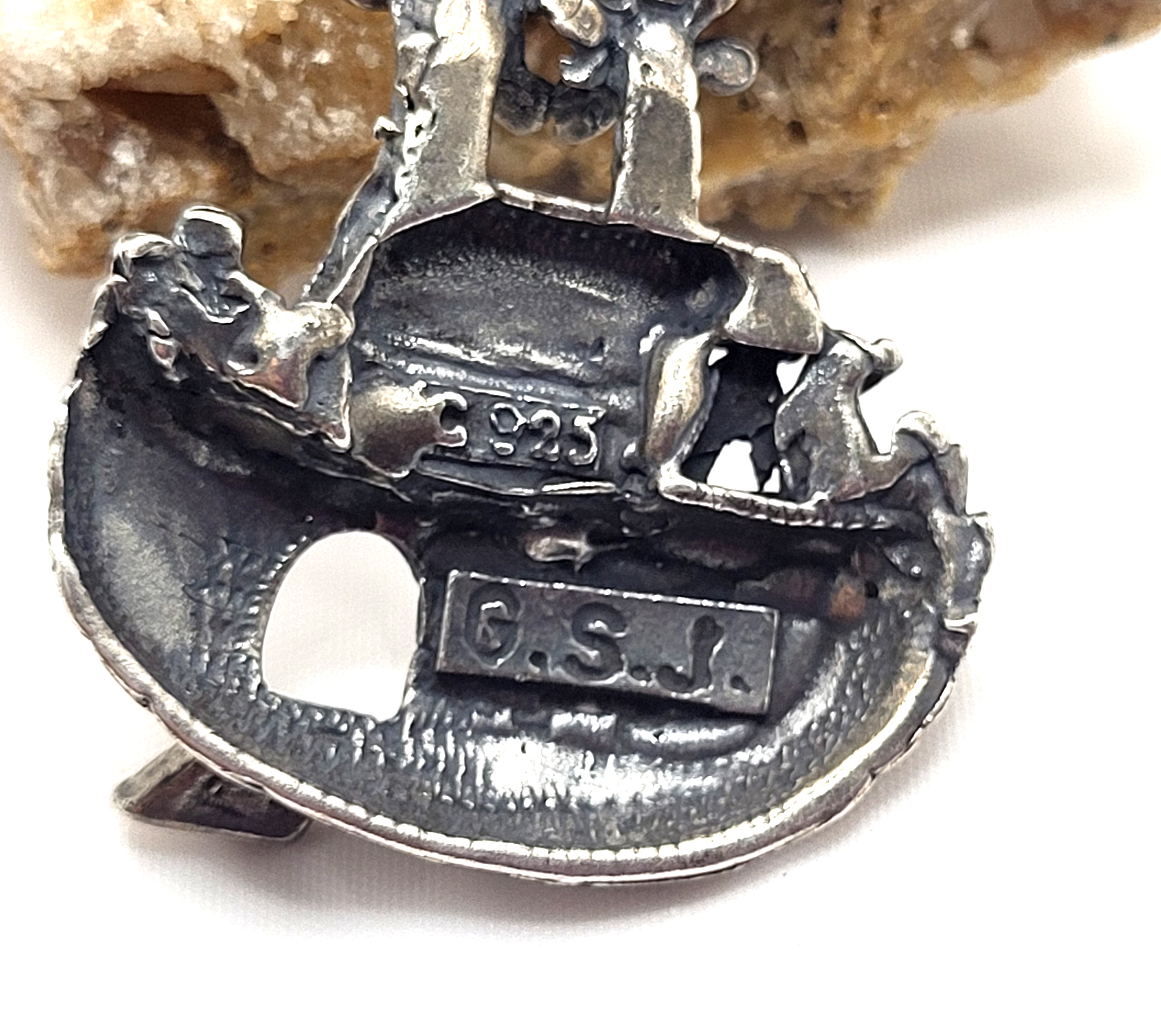 This is a sterling silver pendant, circa mid-’90’s. The figural pendant depicts Noah’s Ark, with giraffes, a lion cub, a lamb, and perhaps, Noah himself?. Feel free to give us your opinion of the figure at the stern! The pendant measures approximately 1.5" x 1.75" and has a bail that can accommodate an approximate 4mm wide chain. The hallmark on this pendant is G.S.J. with the copyright mark. (Gold Stone Jewelry-no import stamps indicating made somewhere other than (the US) America. This is much nicer looking than others seen online that appear to have been recast from an original.