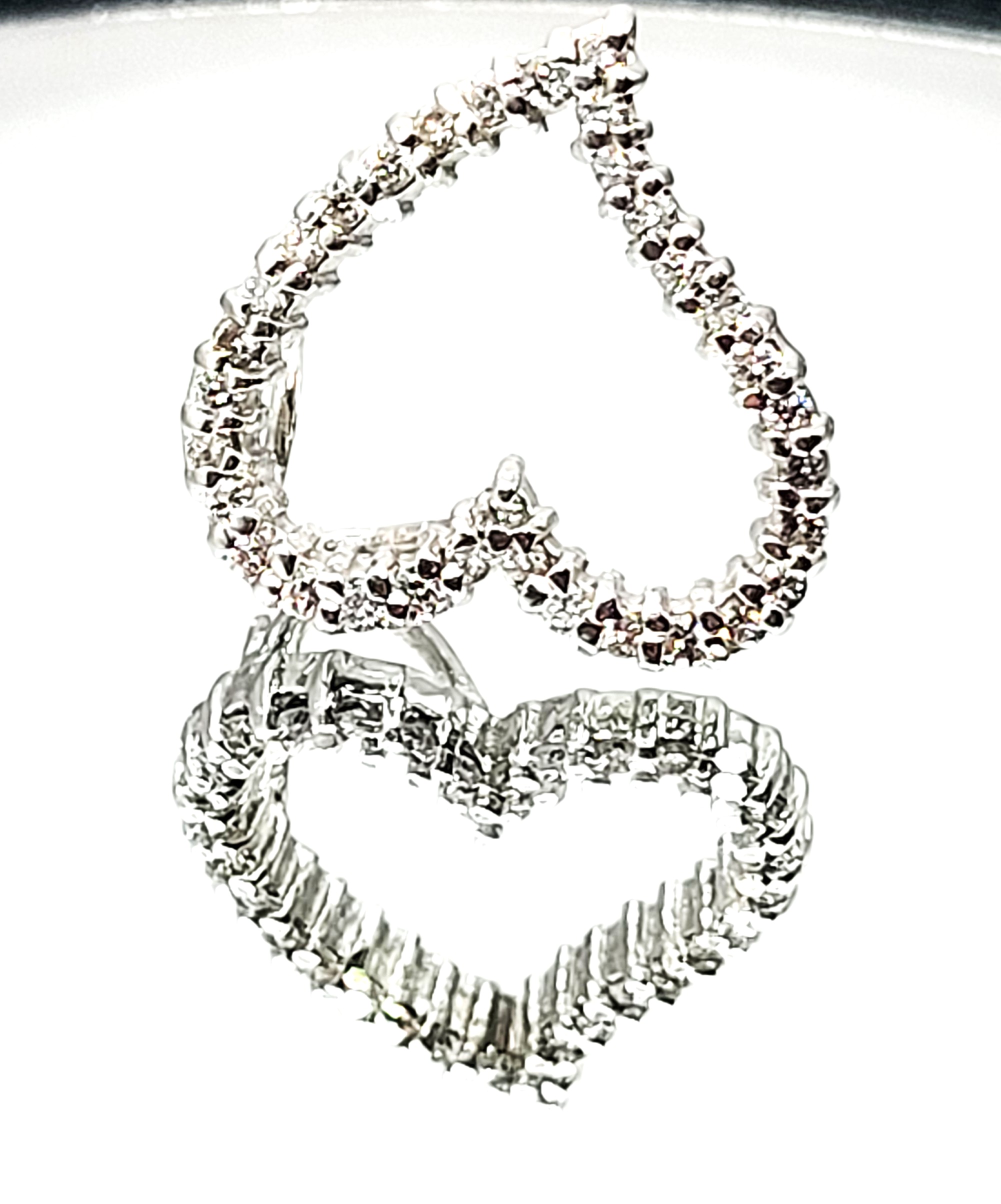 This is a 14 karat white gold heart-shaped pendant, set with .66 carats of round, brilliant-cut, I color, SI2-I1 clarity diamonds and two hidden bails that can accommodate an approximate 2.75mm wide chain. The heart is approximately 3/4" in diameter and has a curved sway and open center. This is a pendant only and does NOT include a chain. Admin: G11241/16ett