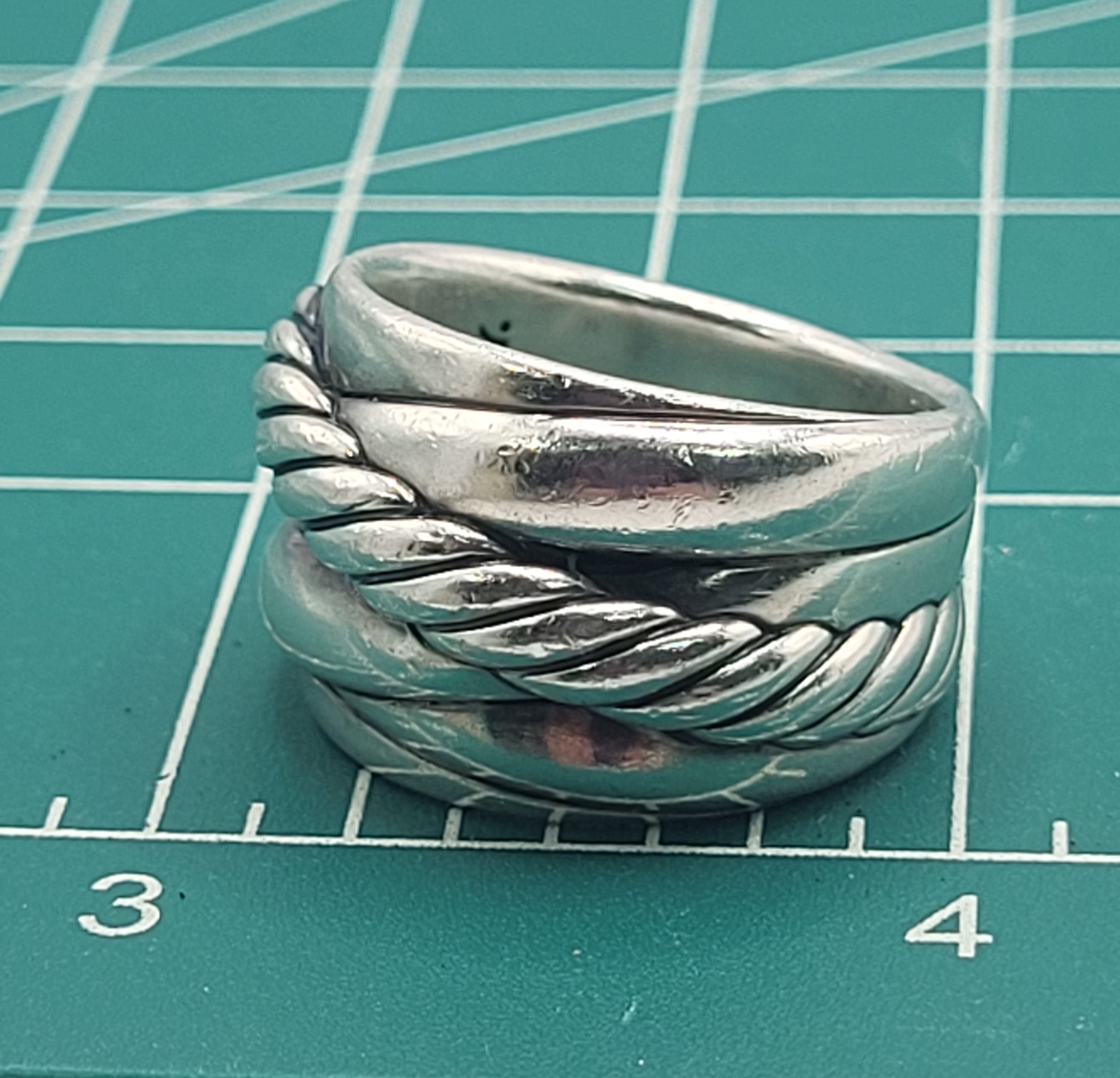 This David Yurman band is crafted from sterling silver with iconic twisted cable crossing smooth bands on the approximate 15.35mm wide top surface that tapers to an approximate 9mm shank. This ring bears the D.Y. hallmark for David Yurman. It is approximately US size 8.25 and can be sized at an additional cost. If sizing is requested, the skilled jeweler who provides the service is a master jeweler and will size this ring without removing the D.Y. hallmark. Admin: 1226/8hhh