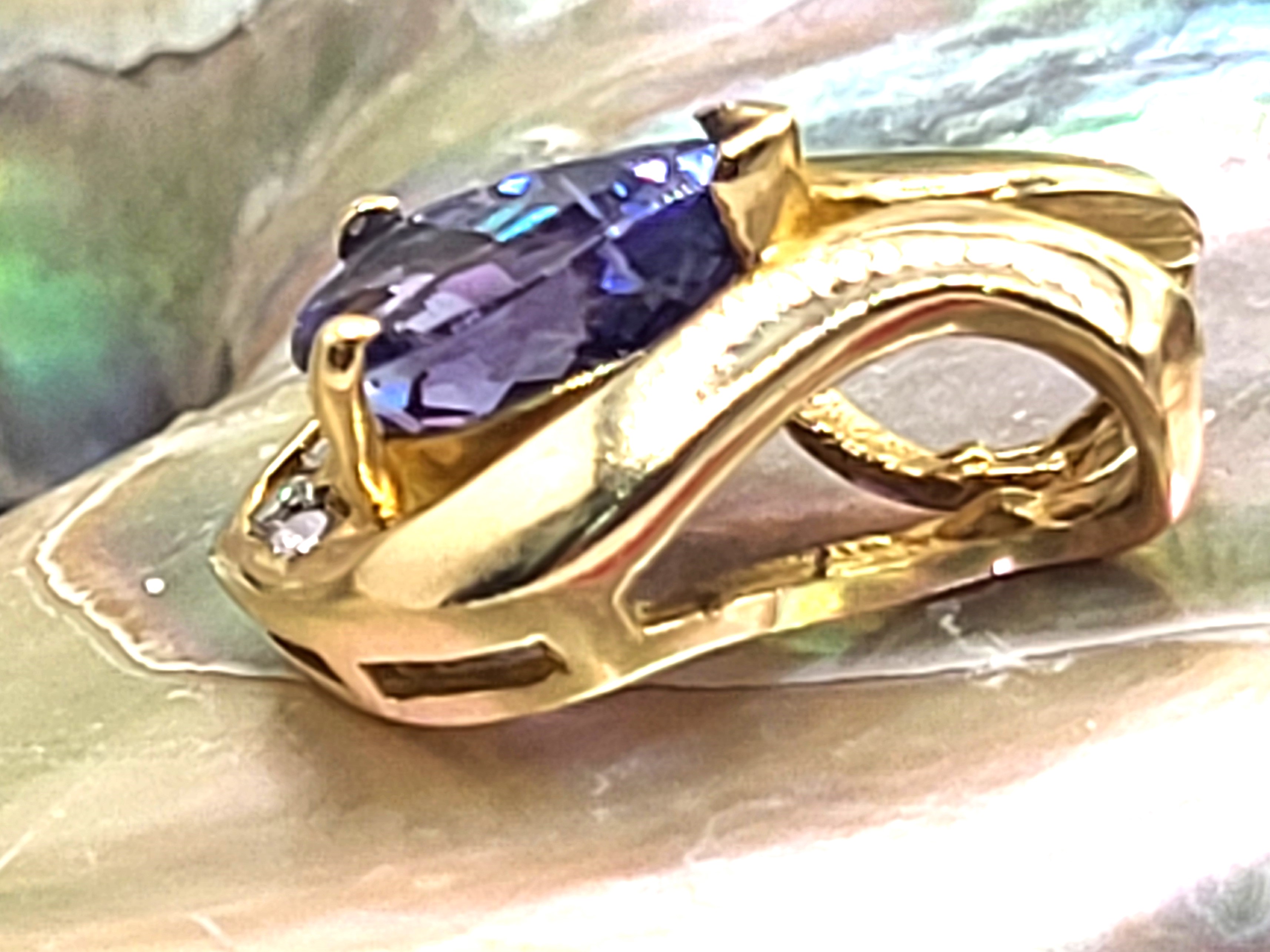 This is a 14 karat yellow gold pendant that features a 1.12 carat pear-cut, prong-set, rich bluish purple, genuine tanzanite. Channel-set at the bottom of the curvy yellow gold frame are .05 carats of round, brilliant-cut, H, SI2 clarity accent diamonds. The pendant is approximately 5/8" diameter and has a built-in bail that can accommodate an approximate 3.75mm wide chain.  Admin: G11241/15grt