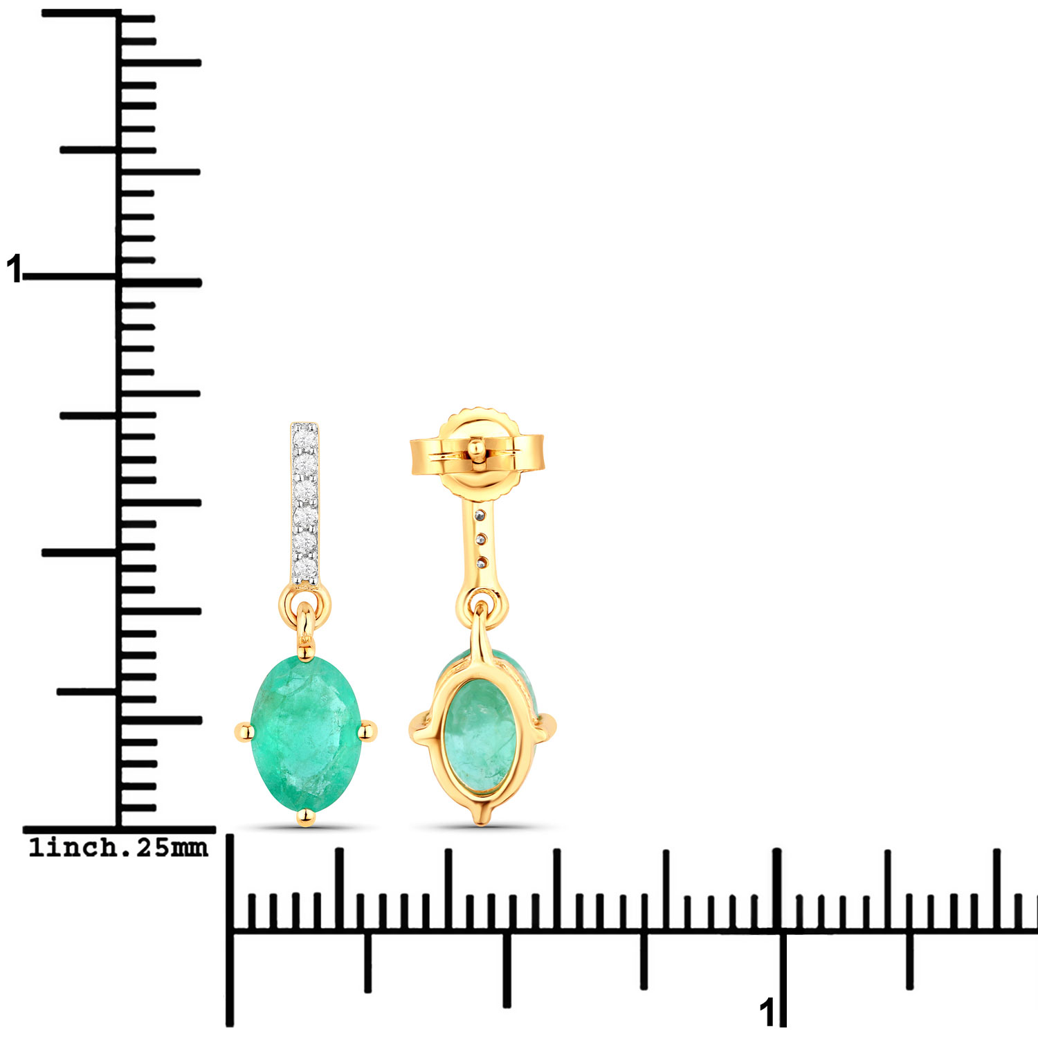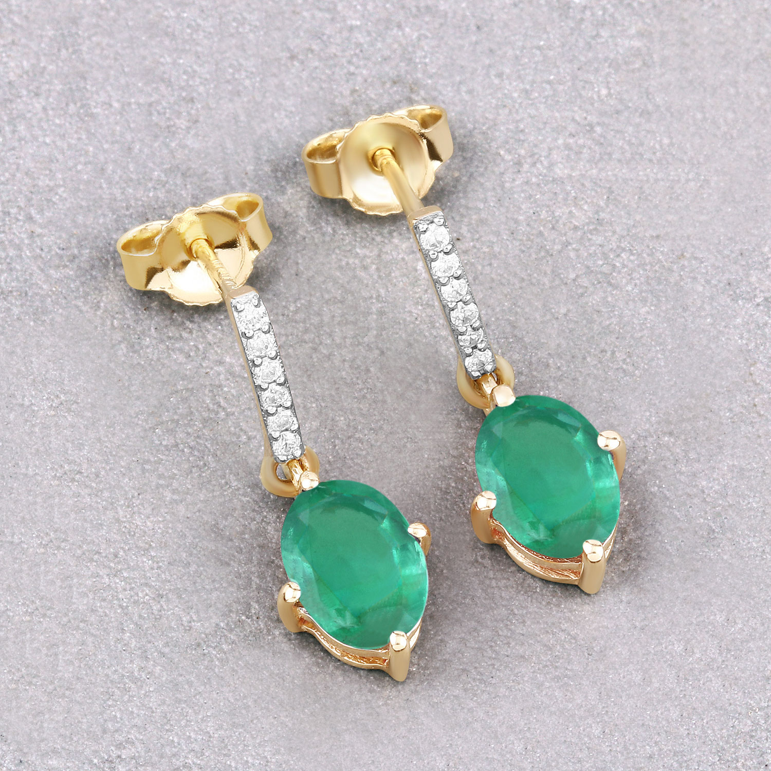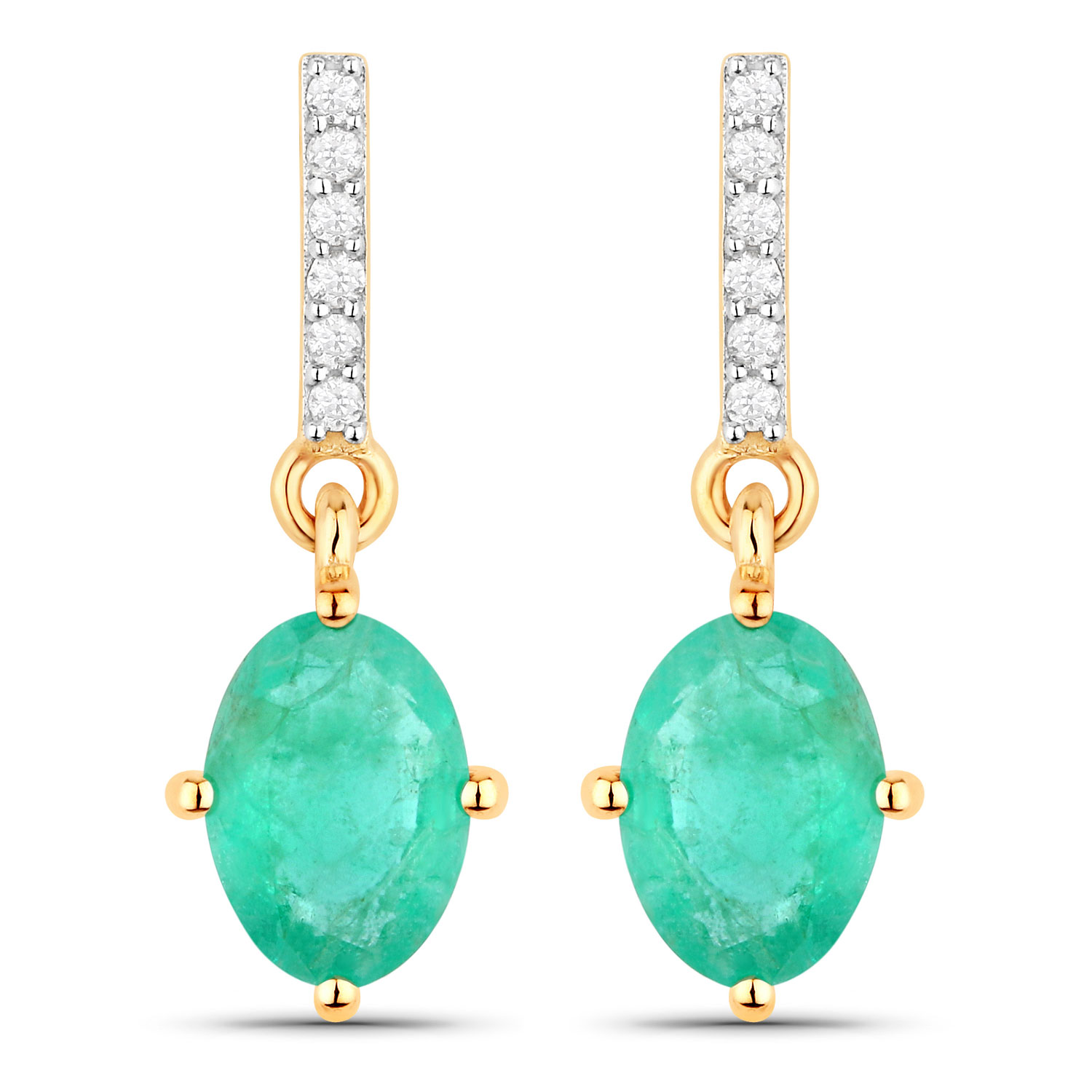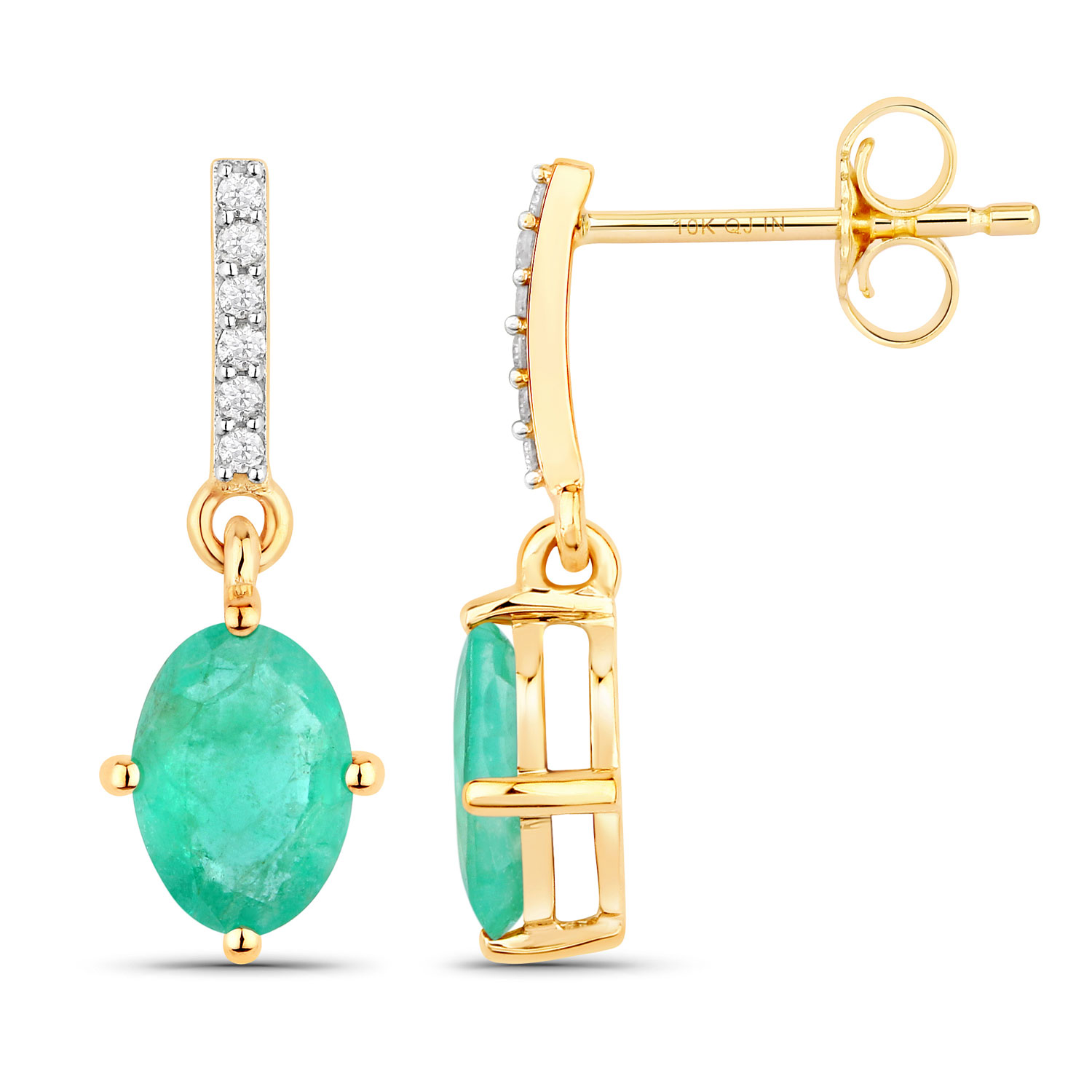 These earrings are absolutely delightful! They are cast with beautiful, yet affordable, 10 karat yellow gold with 1.44 carats total weight (nearly 3/4 carat each), oval-cut, genuine Zambian emeralds that are set in compass-positioned prongs (N, W, E, and S) and dangle approximately 3/4". They are diamond accented with a total of .05 carats total weight, round, faceted, Earth-mined, H-I color, I2 clarity diamonds and they attach to the earlobe with posts and friction backs. The emeralds measure 7 x 5 mm, keeping them elegant with being ostentatious! AdminCode: Q13600/13/ige