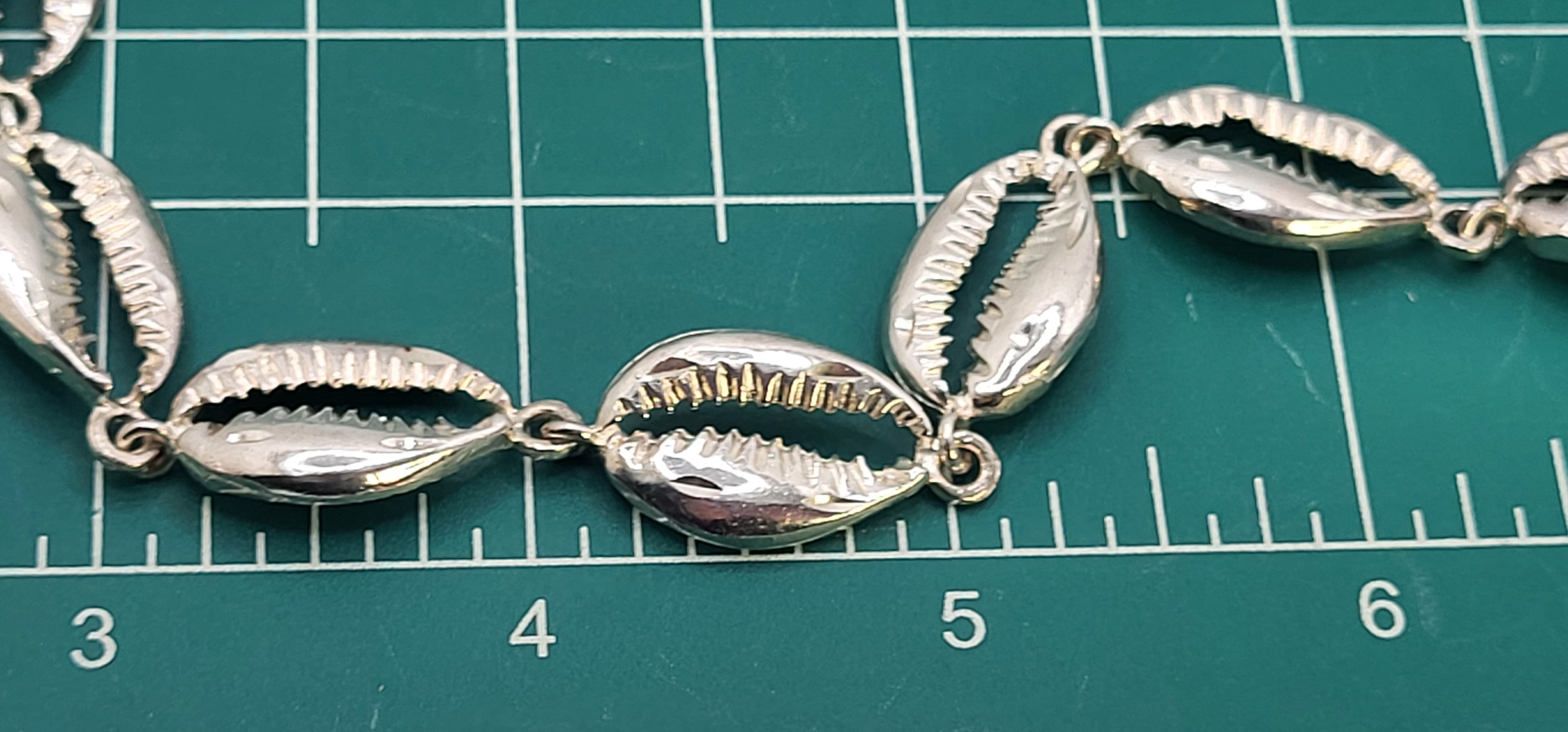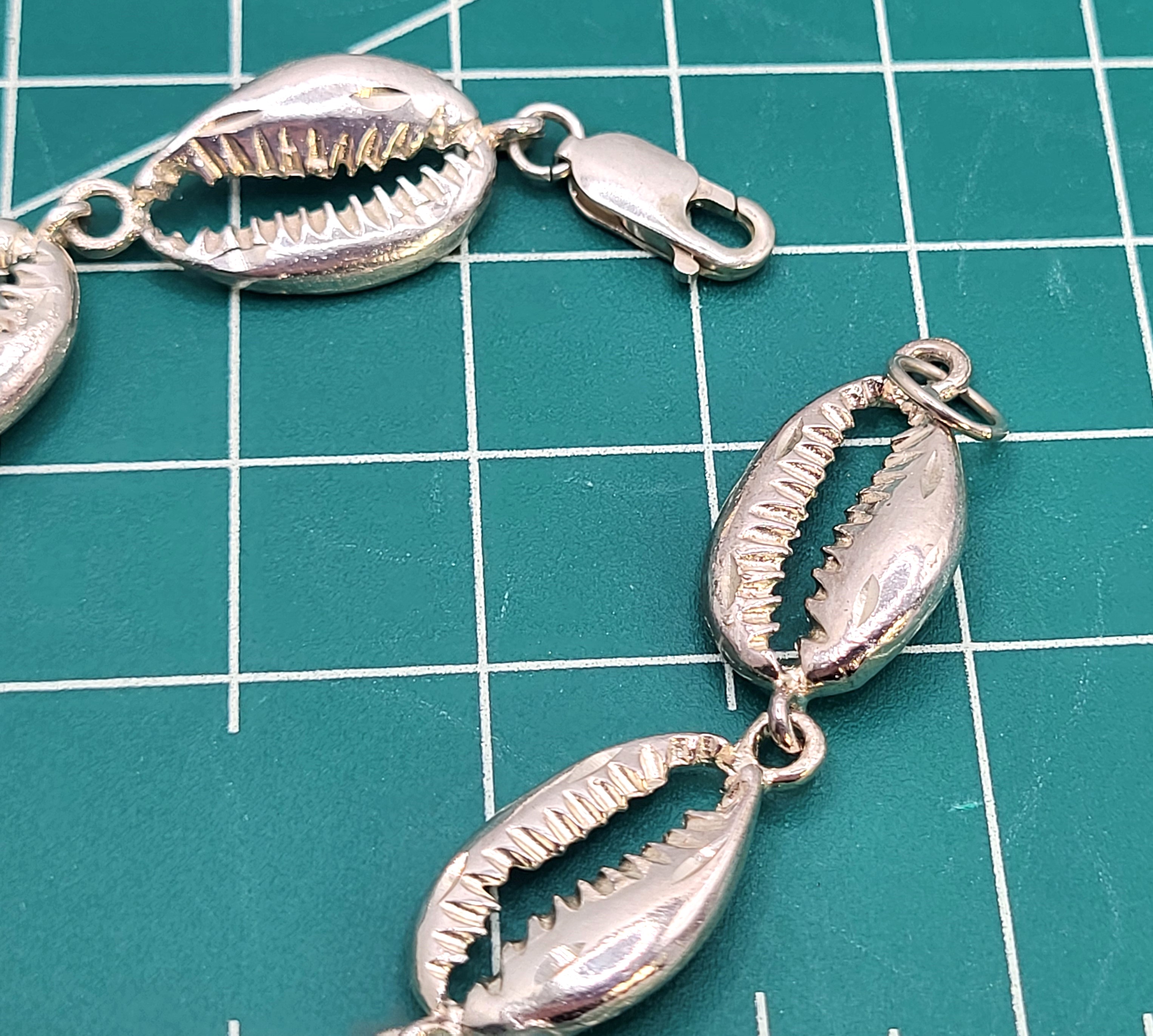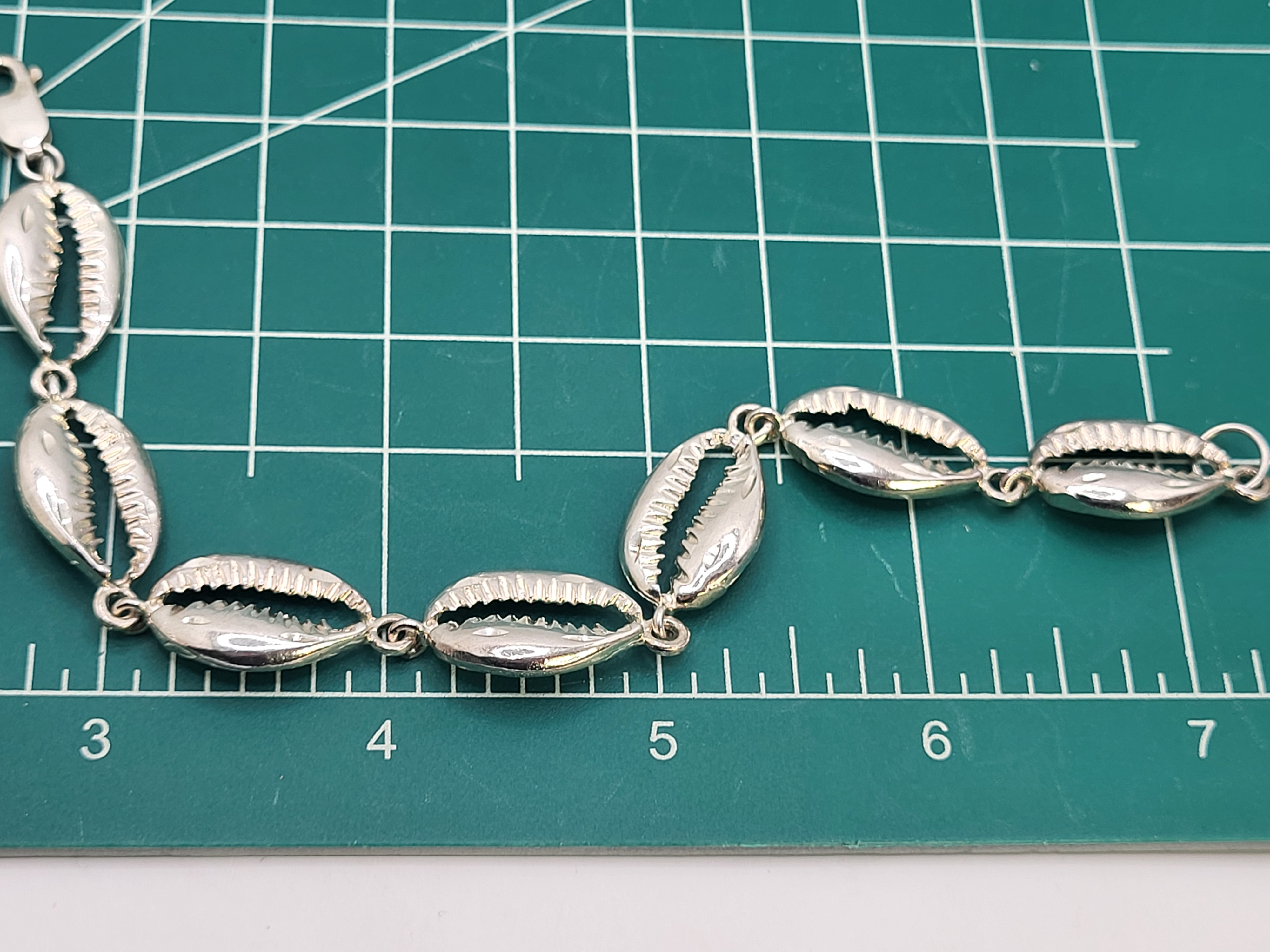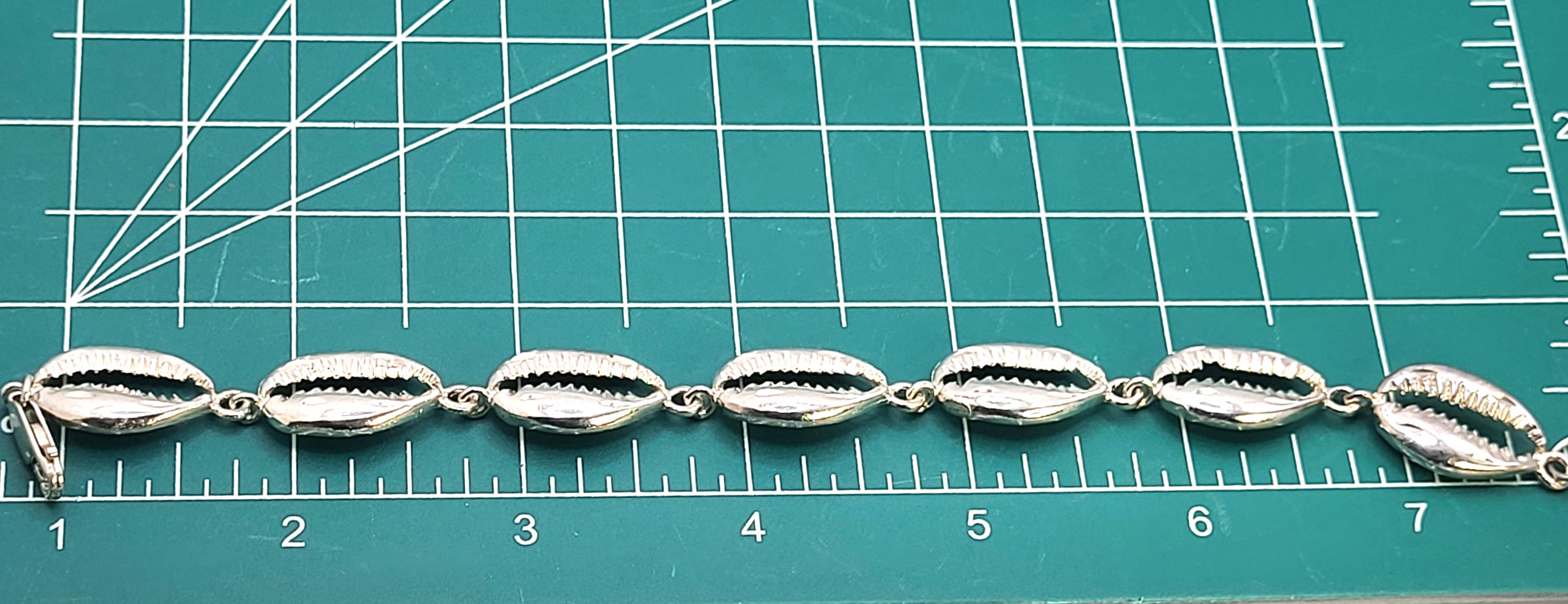 This is a sterling silver bracelet with "Cowrie Shell" links that span 8" and end with a lobster clasp. The bracelet is approximately 12mm wide. This bracelet is suitable for wear by either gender. Admin: 33121/10