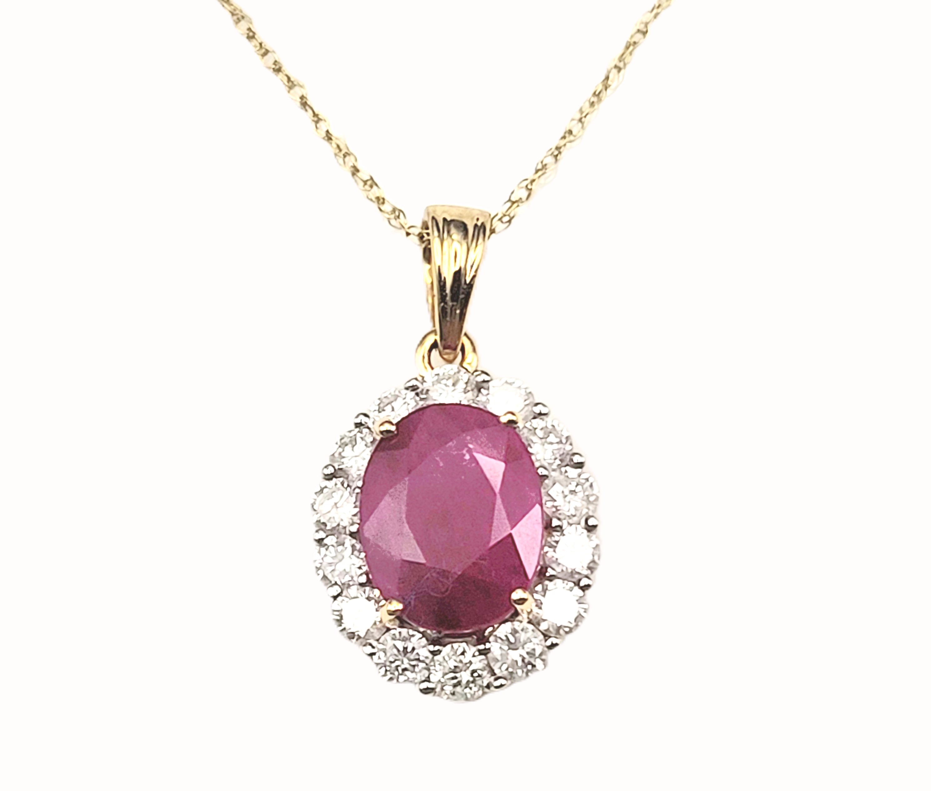 Burma rubies have long been considered one of the most treasured gemstones. So, perhaps you can treasure this 18 karat yellow gold necklace that features a semi-translucent, 2.00 carat oval-cut, genuine Burma ruby* that is prong-set in a halo of .56 carats round, brilliant-cut, H-I color, I1 color, natural diamonds. The pendant has an open back, and a raised rib gallery for support. The solid bail is attached to a fixed ring at the top of the pendant and can accommodate up to an approximate 2.75 mm chain. The pendant currently hangs from an 18 karat yellow gold, ultra-fine rope chain that is 18" long with a lobster clasp.Admin: Q5743/19-brrr – *This ruby is assumed to be heat-treated, the most common method of treating over 95% of marketable rubies.