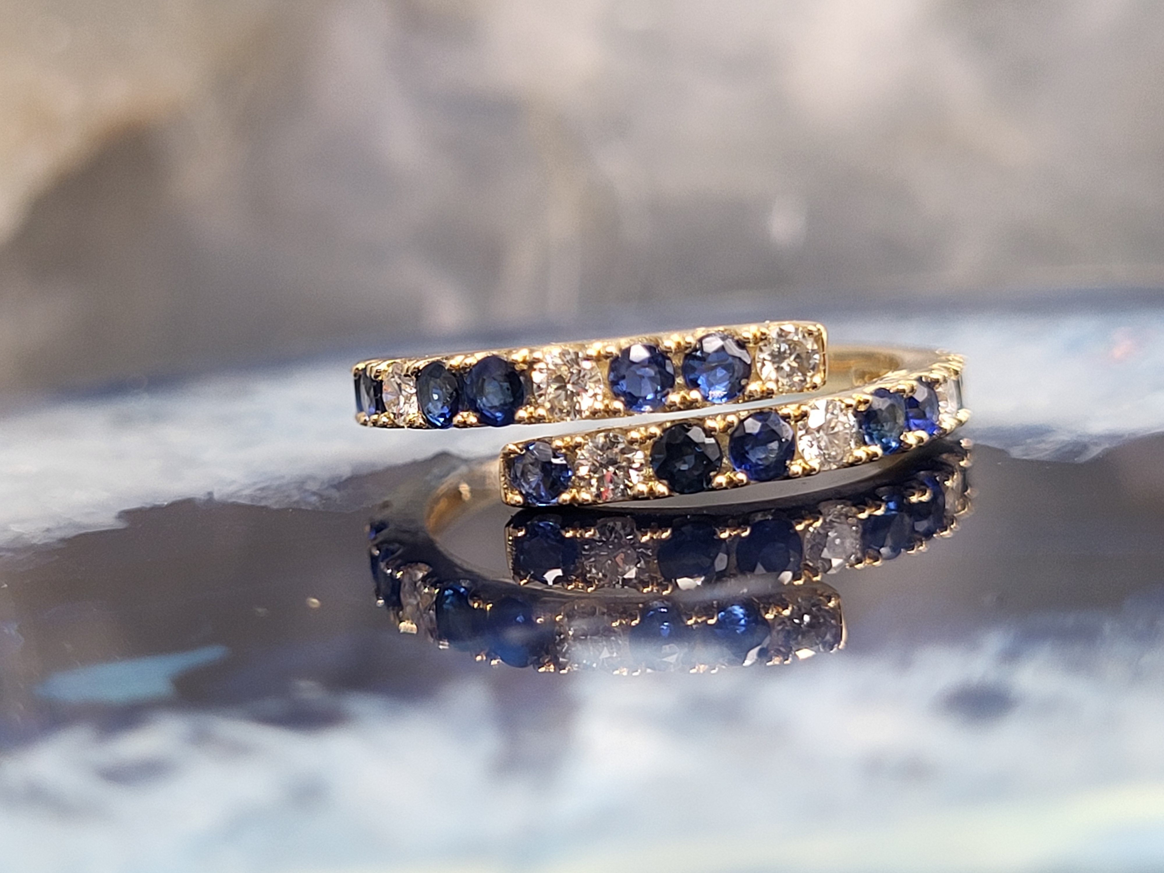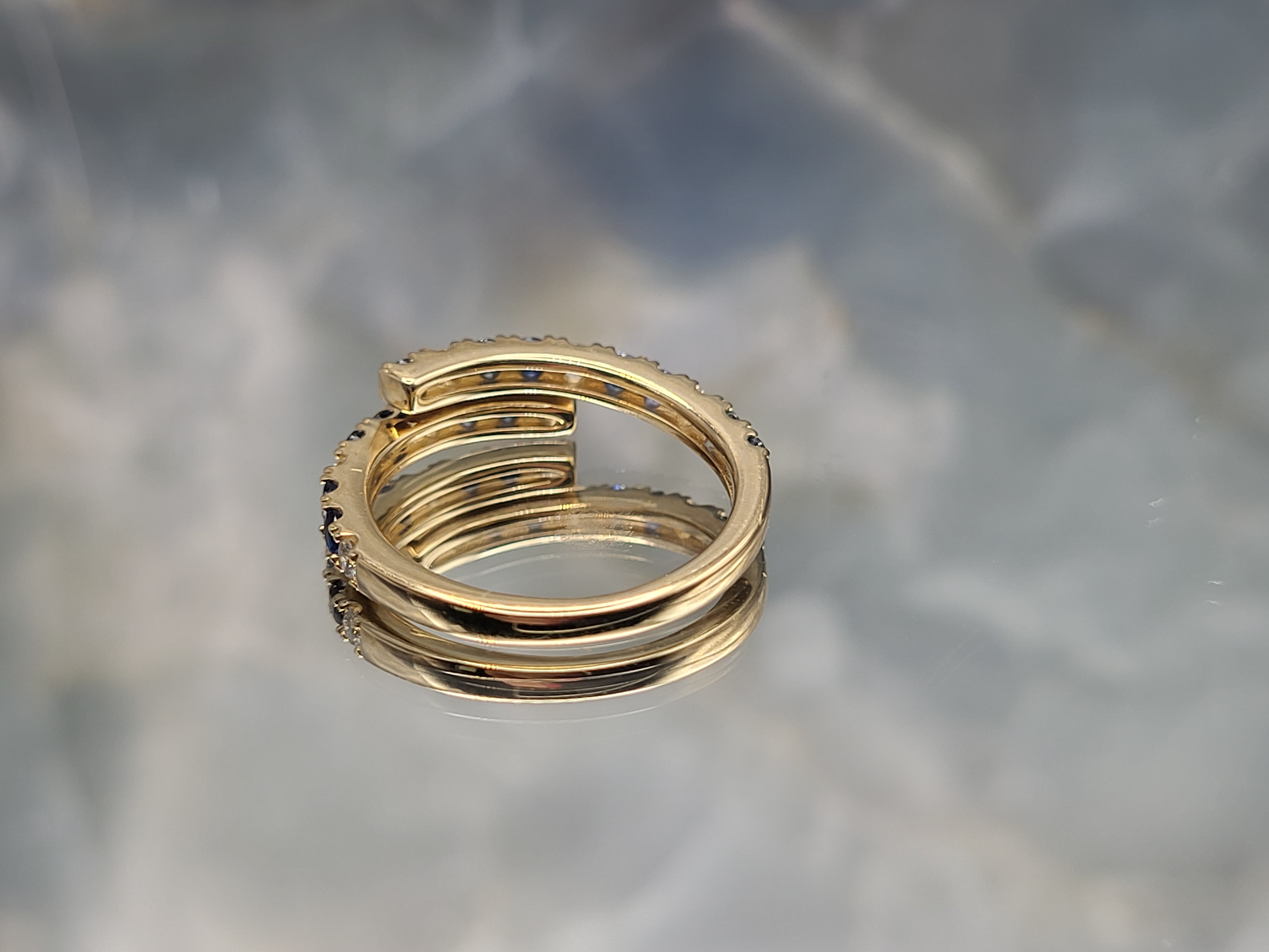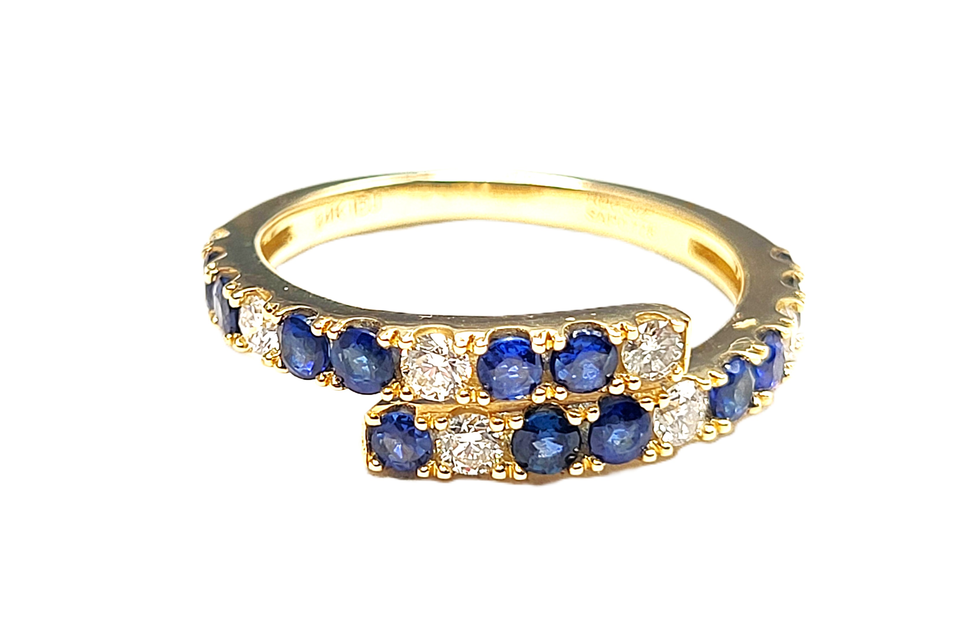 This 14 karat yellow gold ring features .72 carats of round, faceted, genuine, royal blue sapphires that are bordered with .29 carats of round, brilliant-cut, Earth-mined, G-I colored, SI1-I1 diamonds. The ring wraps from the 2.25mm smooth, polished shank up to the top of the finger on each side as one sparkling ribbon sweeps past the other. This ring is US size 7 and due to the nature of the ring, no sizing options are offered. See below for important details about this ring. 3g AdminCode: 6282/24-grr