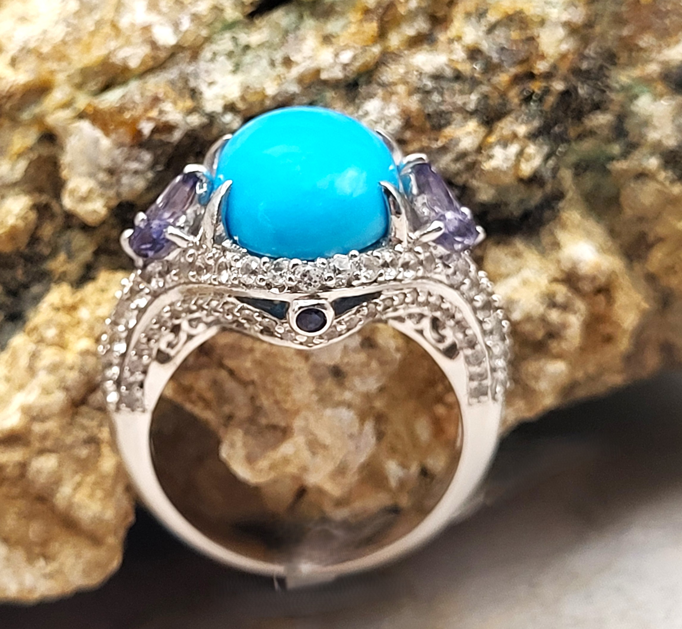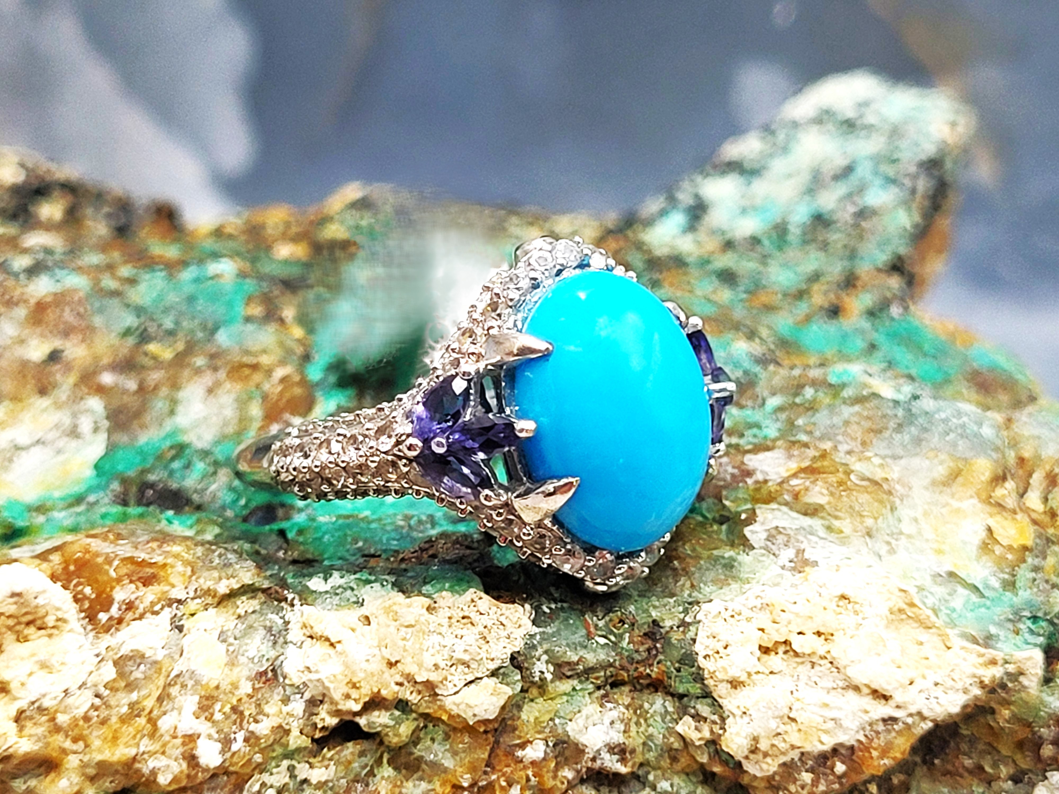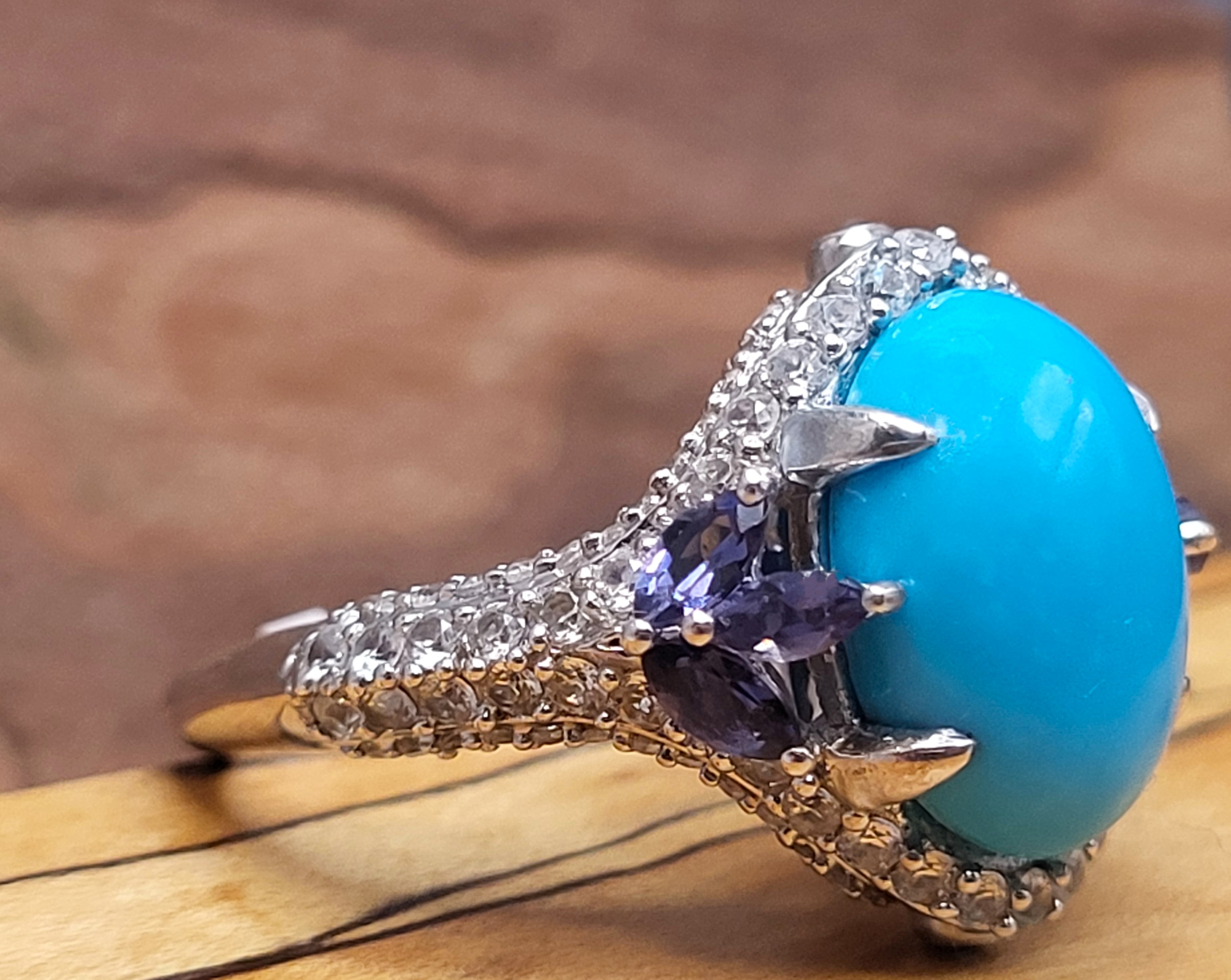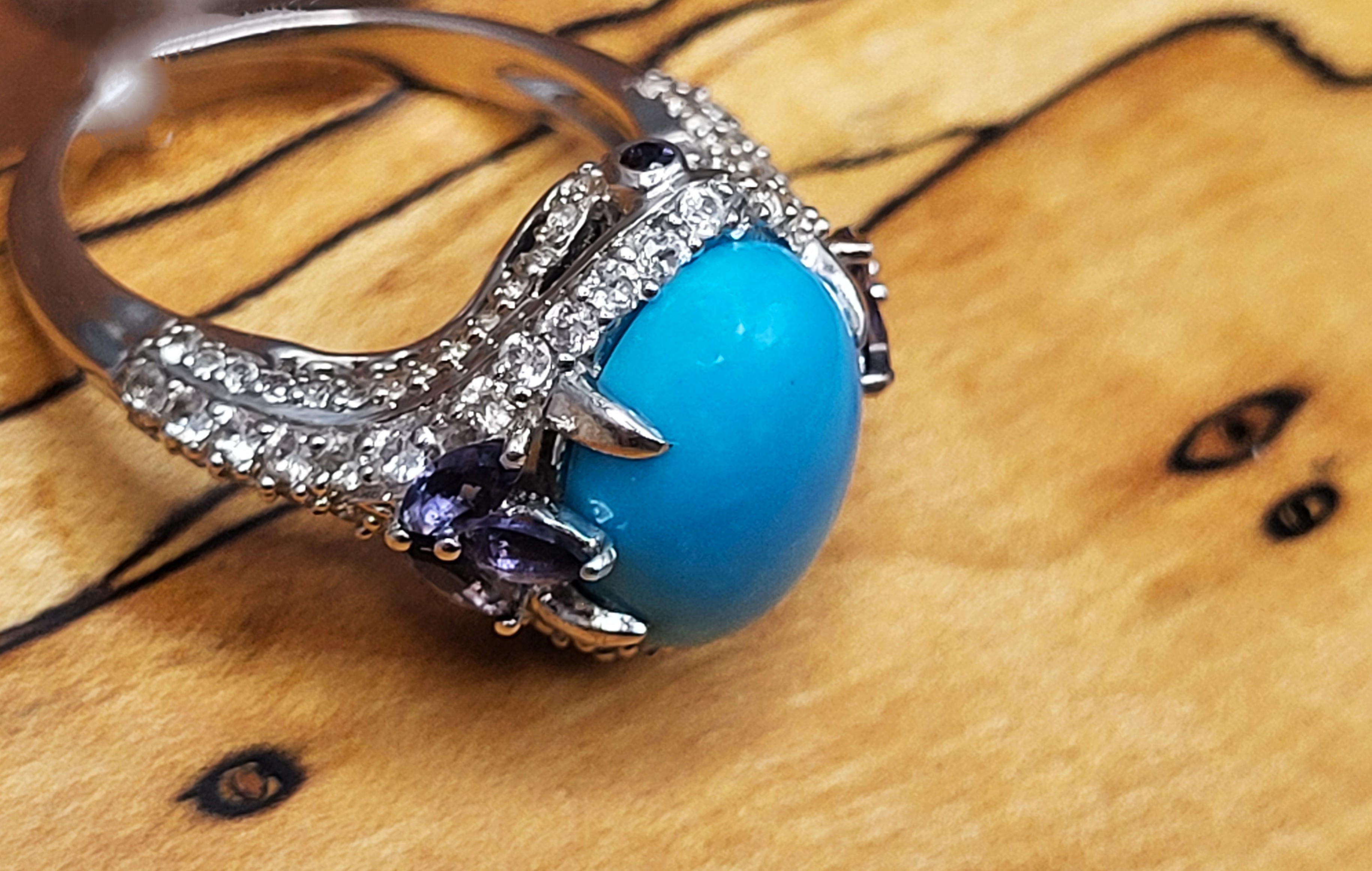 This sterling silver ring has so many positive attributes. Not only does it feature a 4.26 carat oval cabochon of genuine Sleeping Beauty turquoise set with claw prongs that are uniquely designed by placing three on each shoulder. Both shoulders of the ring are adorned with trefoil flowers. The flowers share the claw prongs to hold .40 carats total weight of marquise-cut, genuine iolite.There is 1.26 carats total weight of round, faceted, genuine white topaz rising from the knife-edge shank and encrusting both shoulders and forming a halo-like frame around the vivid baby blue turquoise. Adding charm to elegance, there is a .01 carat genuine iolite bezel-set on the chevron-shaped front and rear bridges. This ring has a supportive and comfortable under gallery and is US size 7. See additional details and other information about this ring below. 6.27g AdminCode: 6282/27-gr