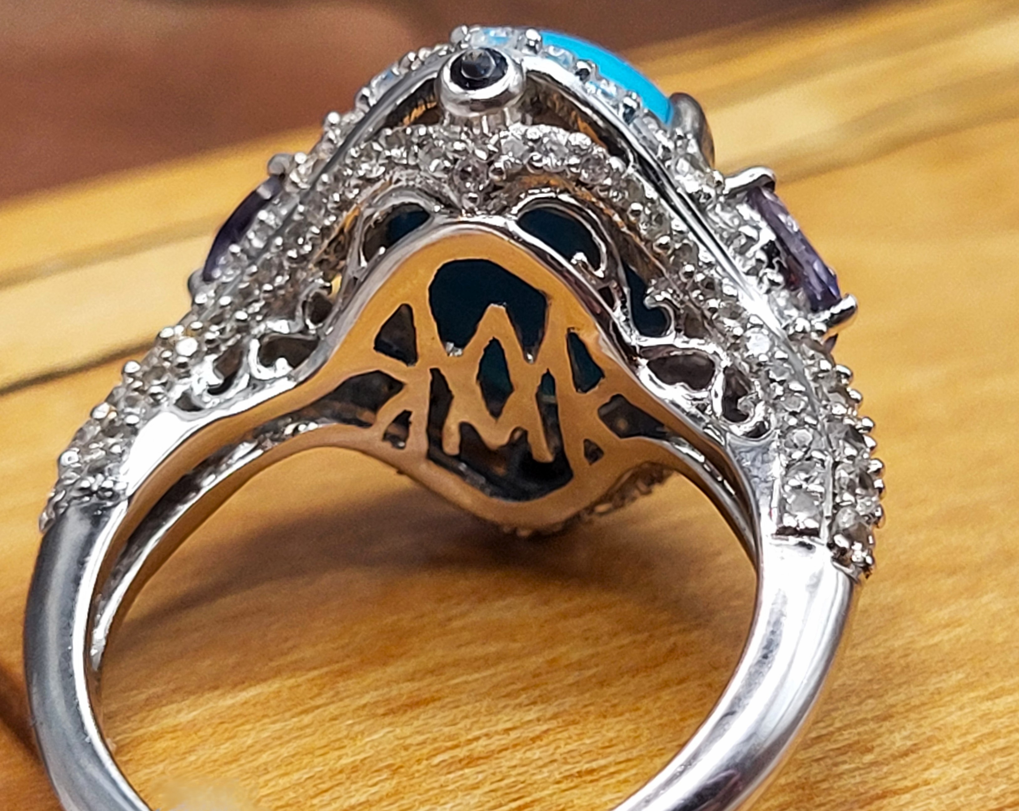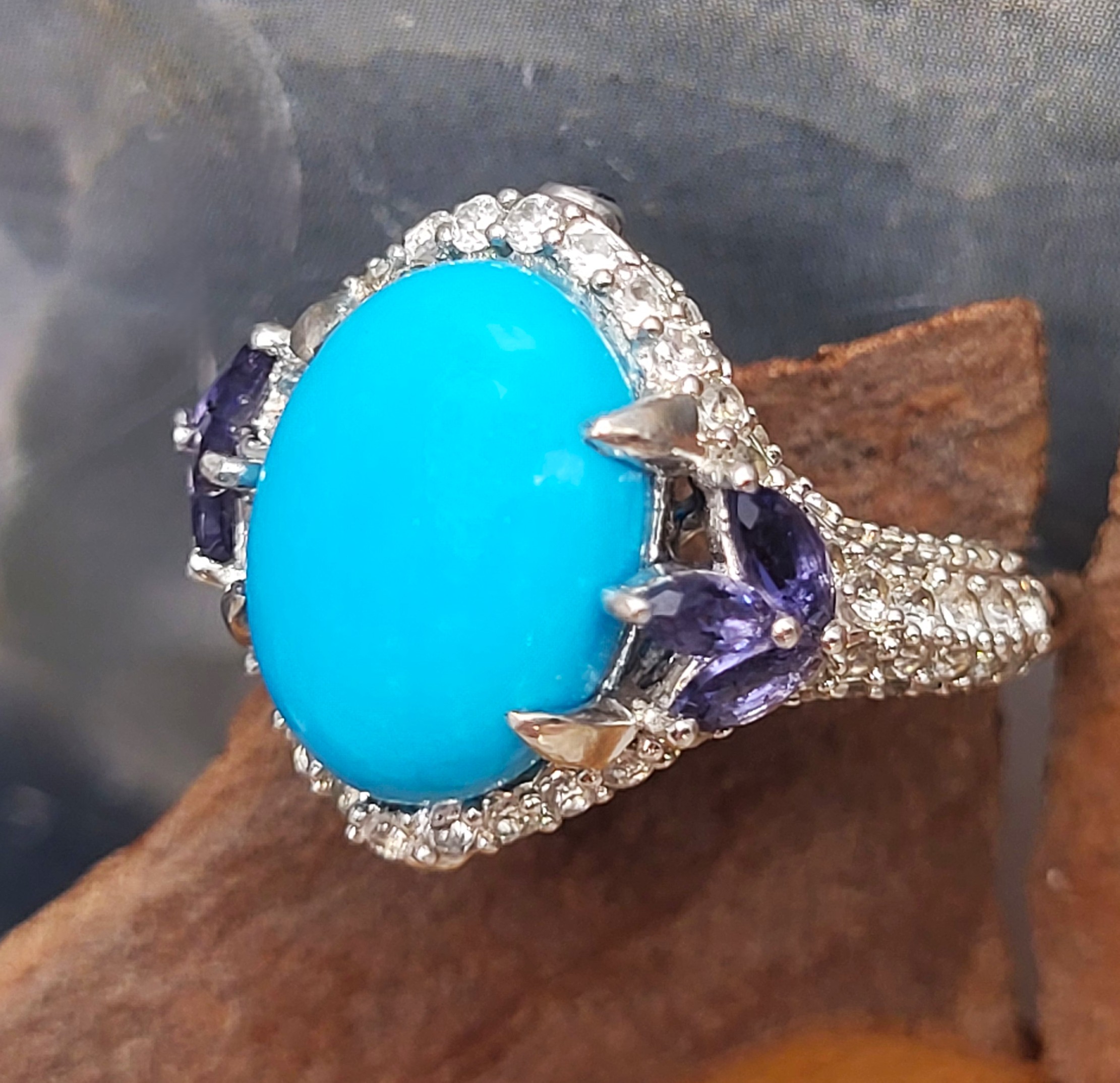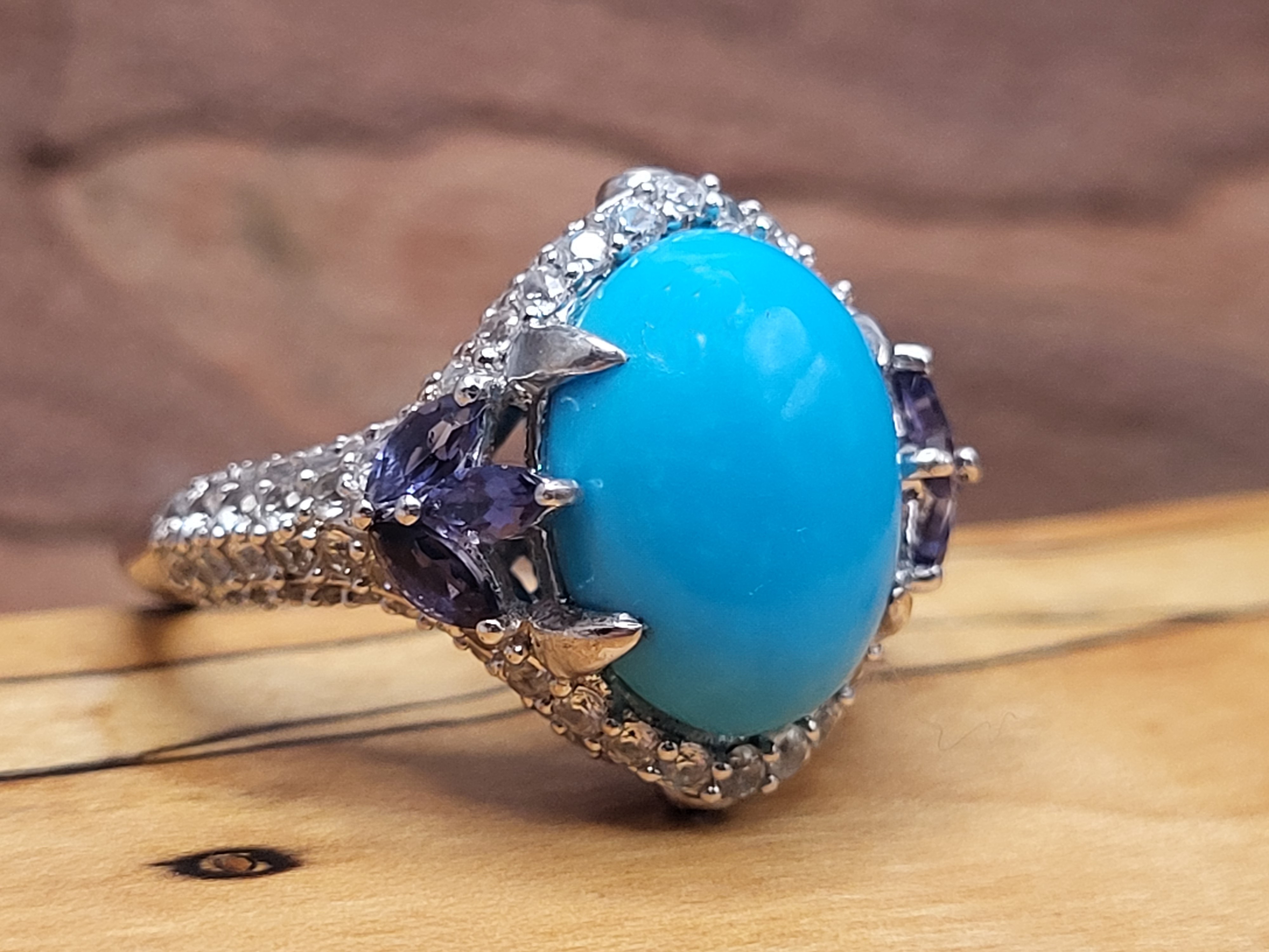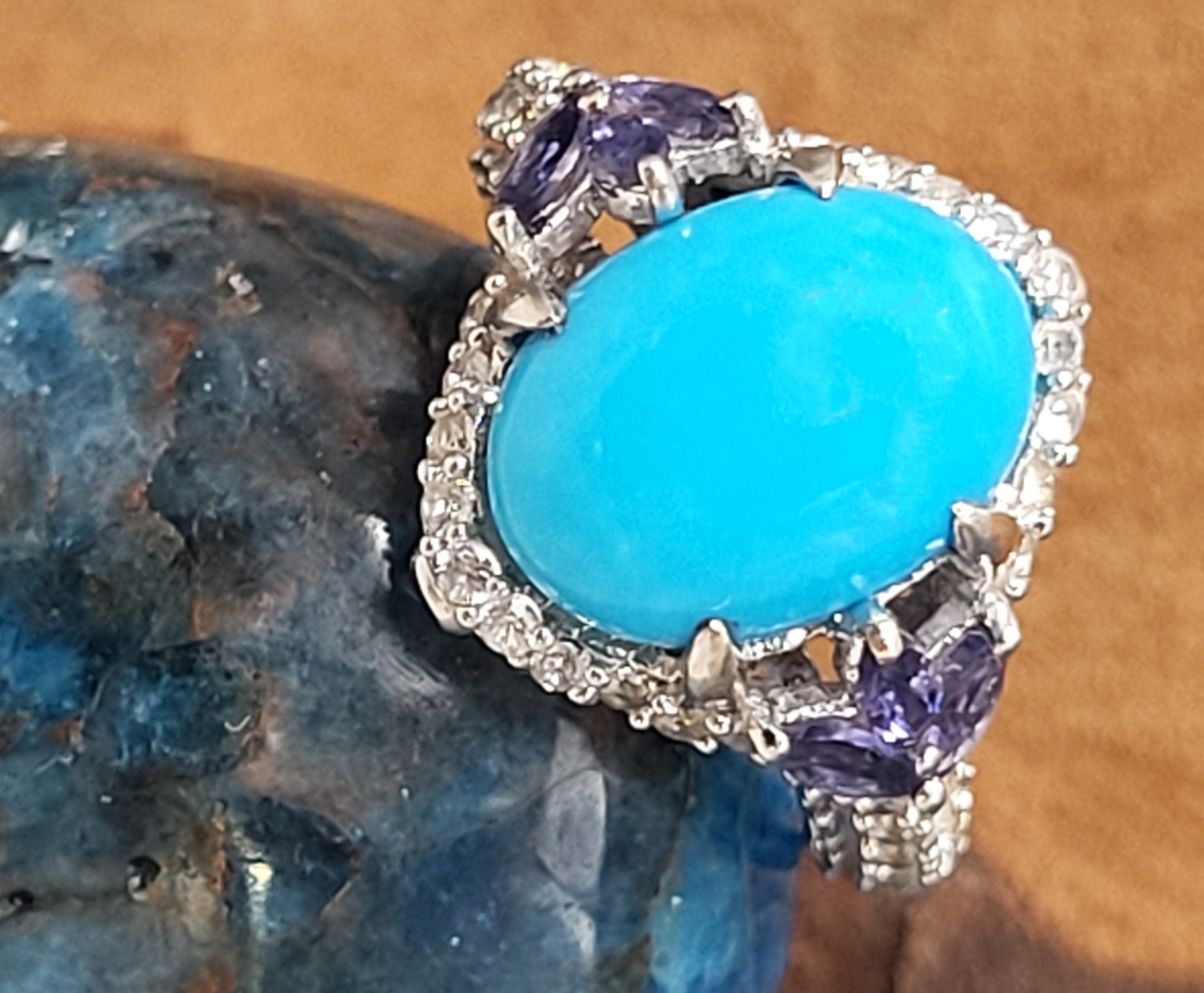 This sterling silver ring has so many positive attributes. Not only does it feature a 4.26 carat oval cabochon of genuine Sleeping Beauty turquoise set with claw prongs that are uniquely designed by placing three on each shoulder. Both shoulders of the ring are adorned with trefoil flowers. The flowers share the claw prongs to hold .40 carats total weight of marquise-cut, genuine iolite.There is 1.26 carats total weight of round, faceted, genuine white topaz rising from the knife-edge shank and encrusting both shoulders and forming a halo-like frame around the vivid baby blue turquoise. Adding charm to elegance, there is a .01 carat genuine iolite bezel-set on the chevron-shaped front and rear bridges. This ring has a supportive and comfortable under gallery and is US size 7. See additional details and other information about this ring below. 6.27g AdminCode: 6282/27-gr