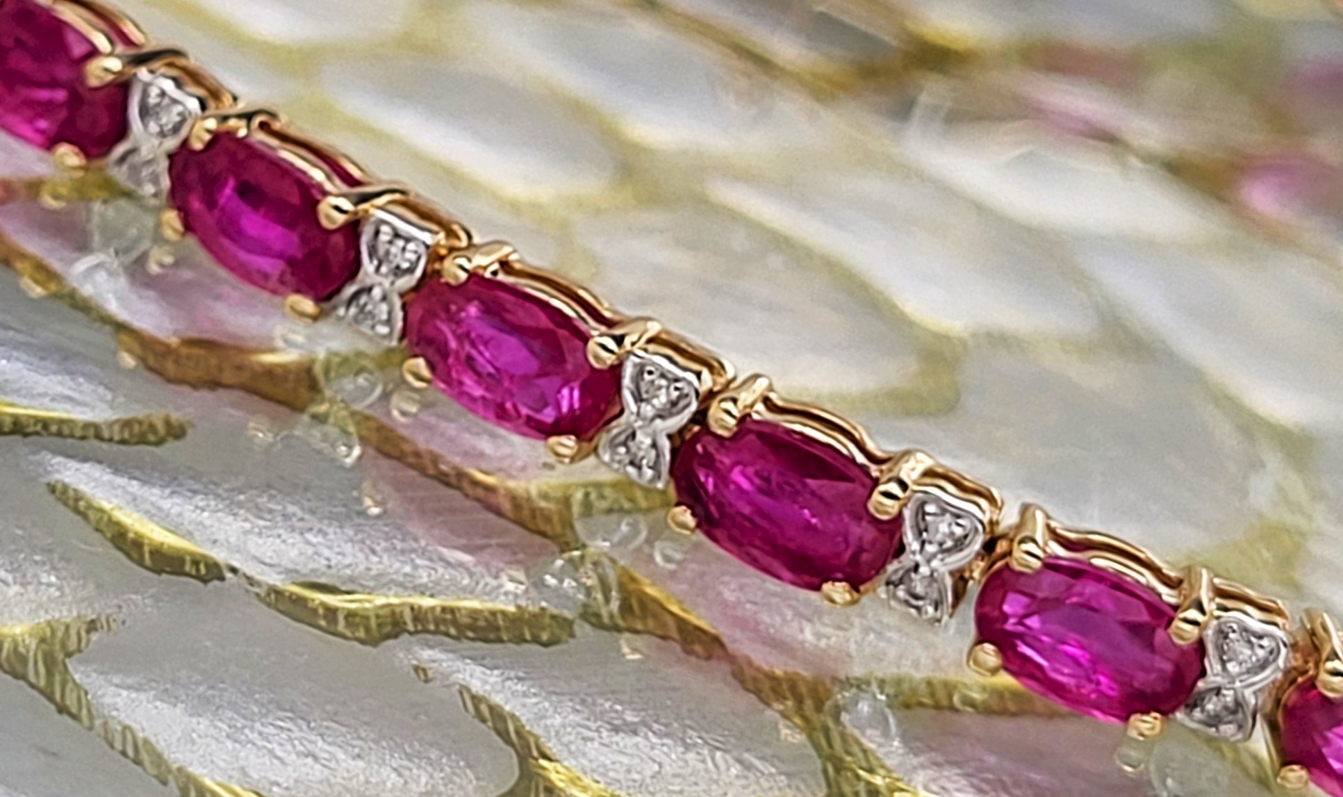 This 14 karat yellow gold bracelet contains over 5.00 carats of genuine, oval-cut rubies and each ruby represents an individual link. The links are separated by diamond-accentuated bow-tie shaped hinge covers. That means this bracelet has 5.87 carats of precious gemstones when you sum up the 5.72 carats total weight of rubies and the .15 carats total weight of round, faceted H-I color, I1 clarity diamonds! The bracelet is 7" long and has a hidden box clasp with 2 figure-eight safety clips. Admin: Q5743/31-bigr