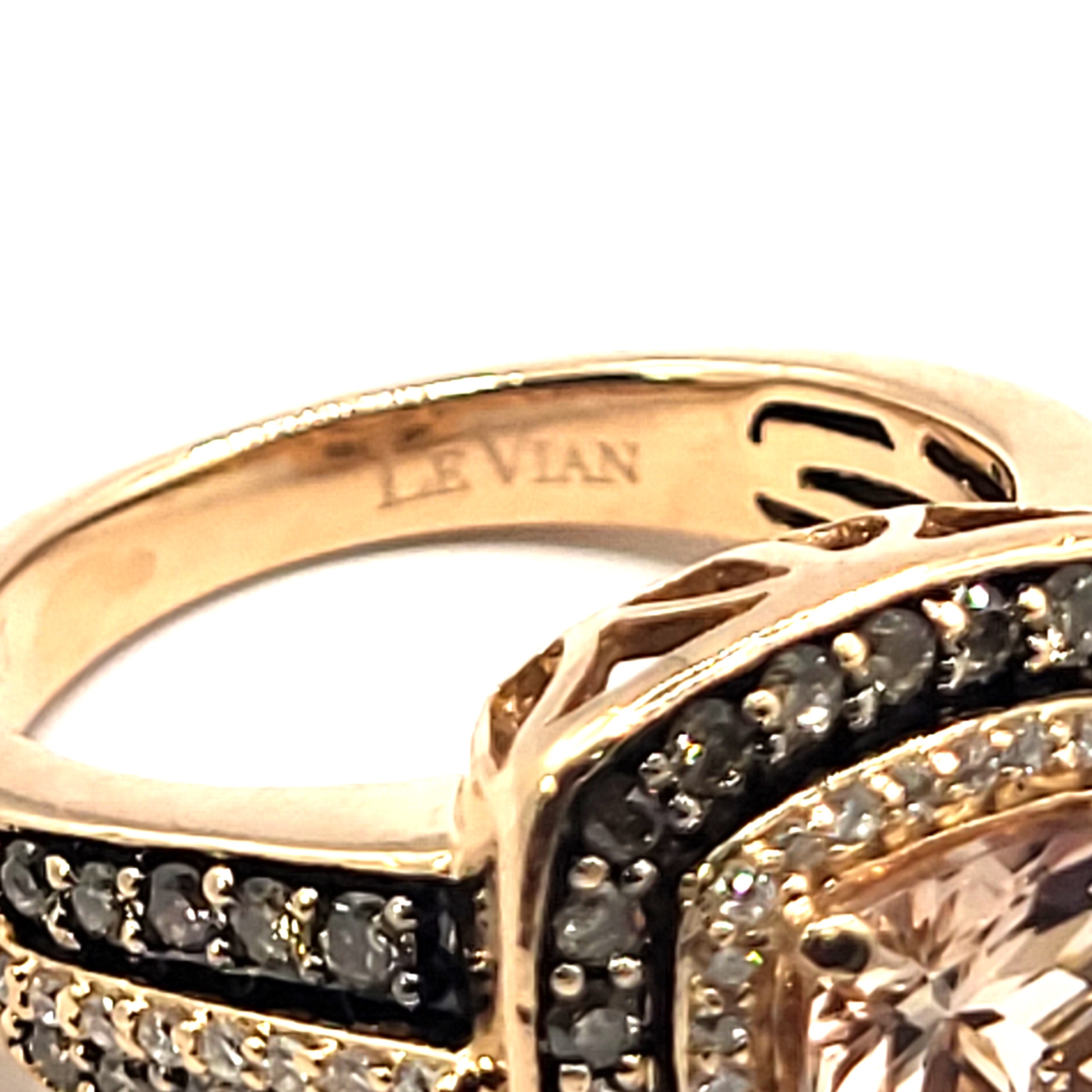 This 14 karat rose gold ring bears the LeVian hallmark and features an approximate 2.00 carat cushion-cut Morganite. The ring has a wide, cushion-shaped frame and wide, tiered shoulders, set with approximately 1.00 carats total weight of SI clarity chocolate and vanilla diamonds. There is a supportive under gallery and a raised, trussed, side gallery. This ring is a US size 7. See below for sizing details and other information.