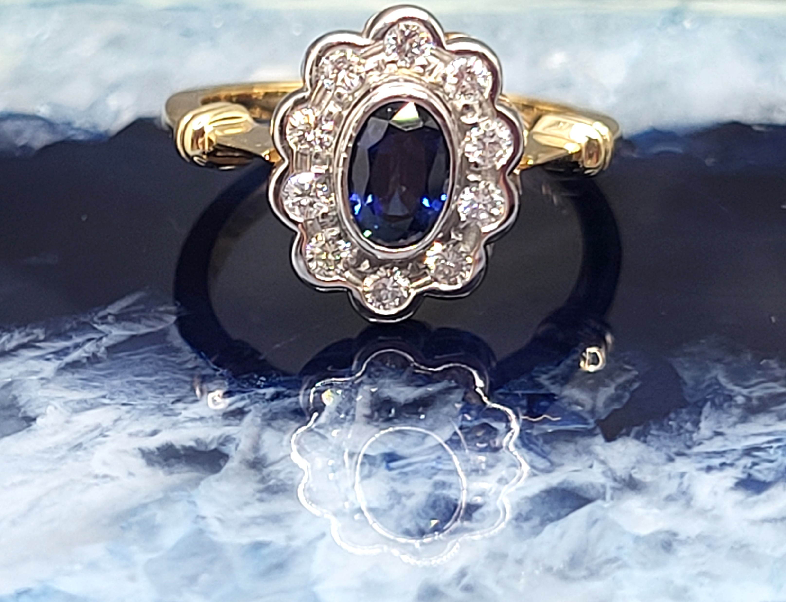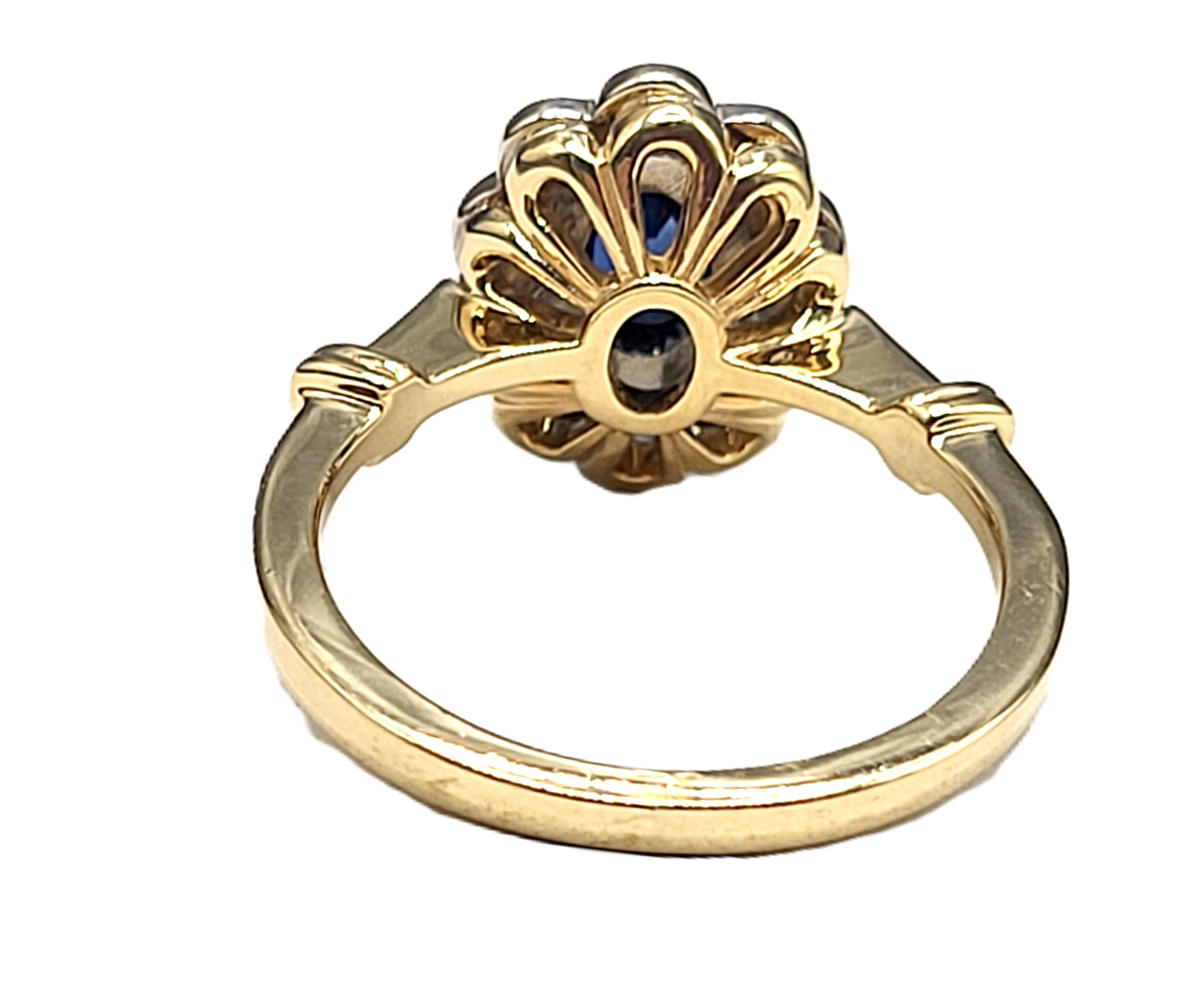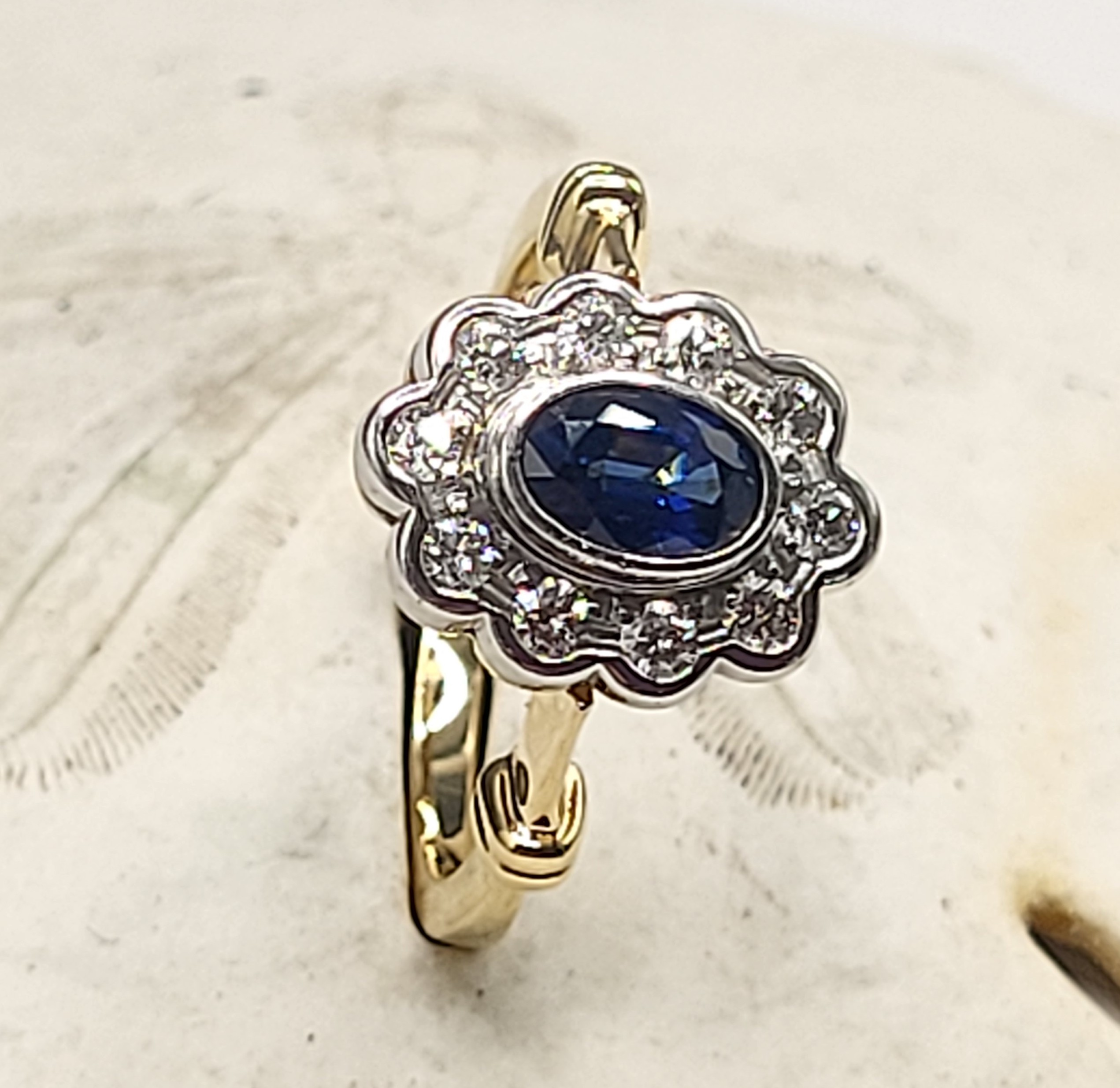 This is a 14 karat yellow and white gold ring that features an approximate .70 carat oval-cut, bezel-set, genuine midnight blue sapphire that is inside a scalloped halo of approximately .25 carats total weight round, brilliant-cut, approximate H color, SI2-I1 clarity diamonds. The setting and gallery are quite unique, in that the diamond halo is set in white gold above a separate unit of yellow gold and a petal-like gallery. The knife-edge shank and cathedral shoulders are adorned with a ribbed binding decor and taper to an approximate 2mm shank. The ring has a very solid feel and bears the "S" (Stuller) hallmark. It also bears the "GB" (Gordon Brothers) hallmark. This ring is US size 6 and can be sized for an additional charge. This item is eligible for appraisal by an independent appraiser (with qualifying credentials from GIA) without affiliation to Bidfair Fine Jewelry, at a discounted rate. Please contact Bidfair Fine Jewelry for more information on appraisals. Admin:33109/18lhe
