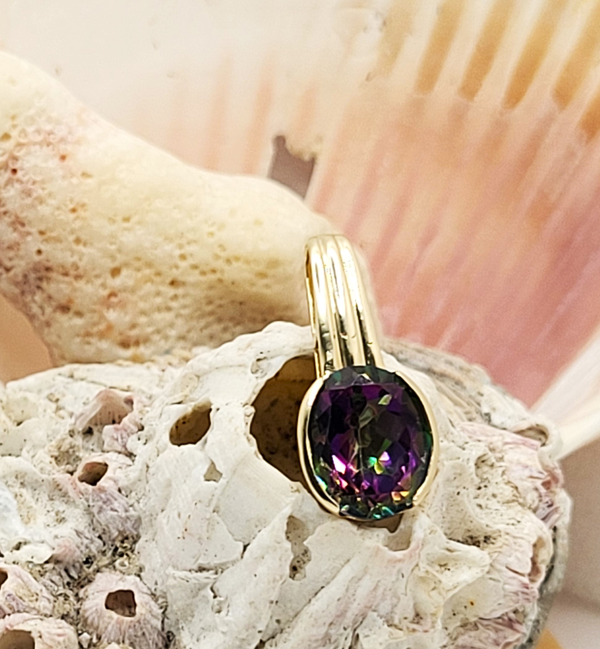 This 14 karat yellow gold half bezel-set, genuine mystic topaz pendant, while not so large as to be called a "statement piece", can certainly be called an