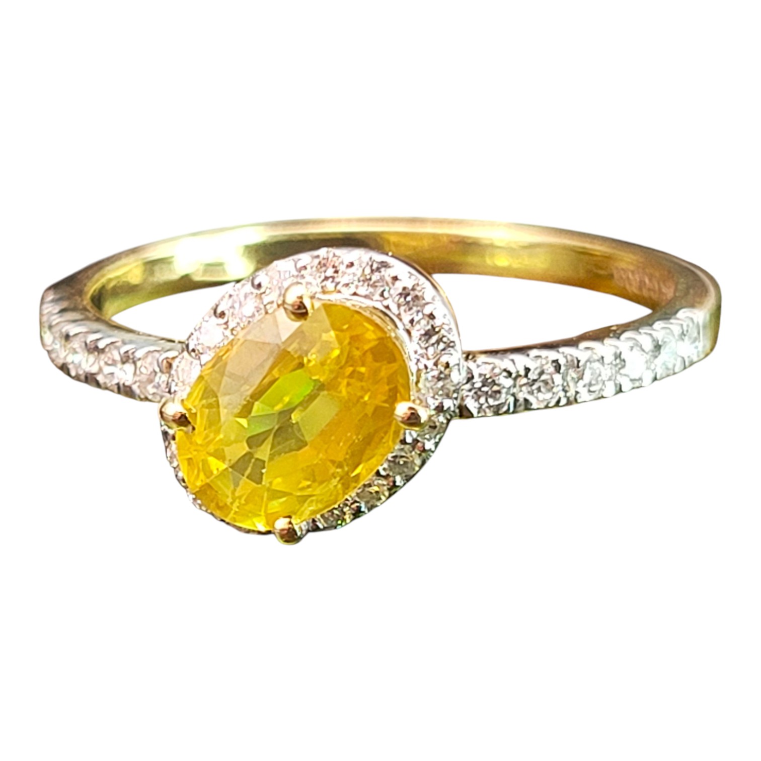 A glammy twist on minimalist elegance, this 14K yellow gold ring features a vibrant 0.59 ct oval-cut genuine yellow sapphire, tilted for dramatic effect. Framed by a halo of 0.21 ctw round brilliant-cut diamonds (H-I color, SI2-I1 clarity) that continue along the shoulders, the design balances sparkle with sophistication. See sizing details and other information below. Ring size: 6. Total weight: 1.61 grams. AdminCode :NAVlw