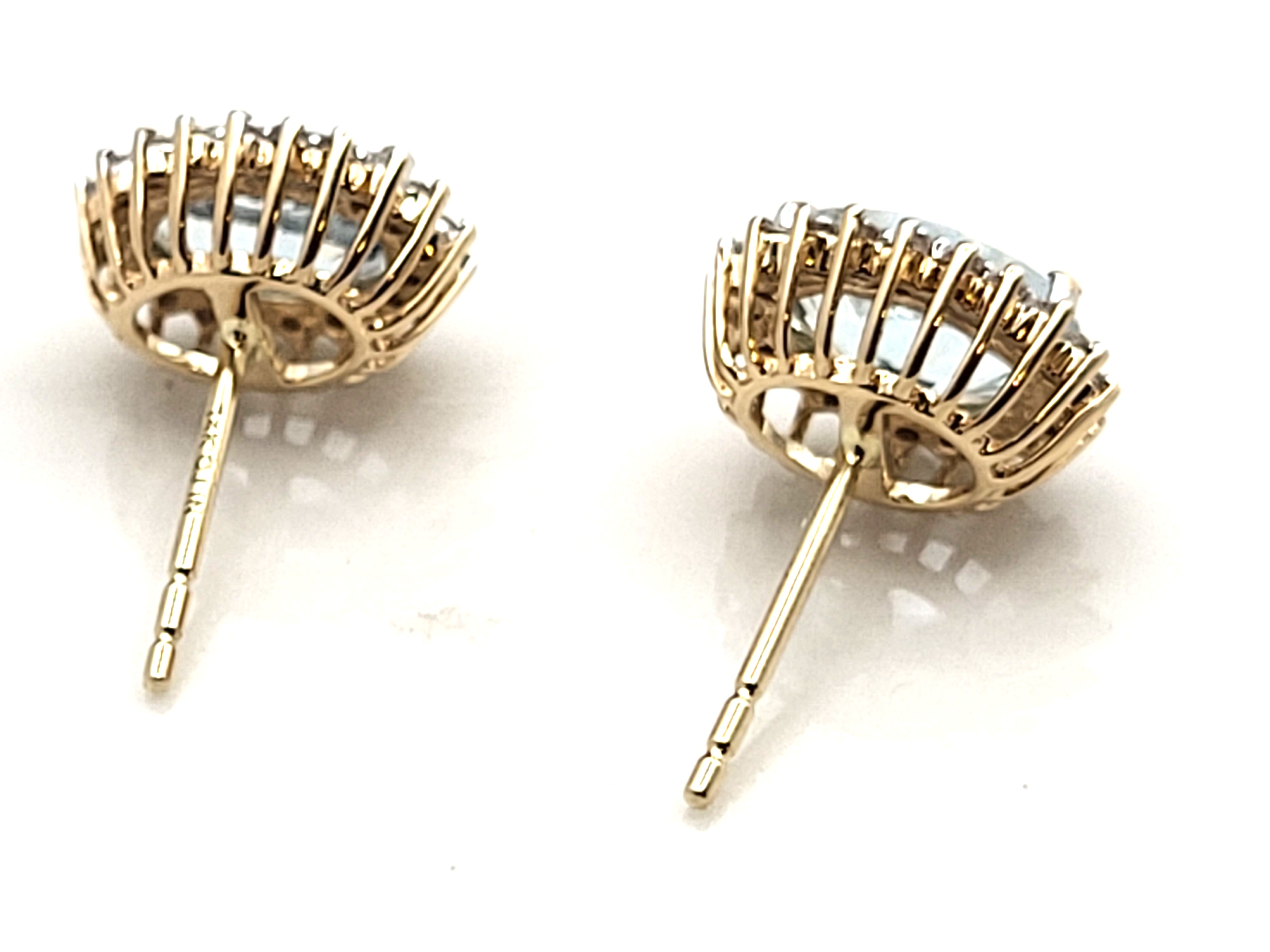 These 14 karat yellow gold earrings feature 2.10 carats total weight of oval-cut, genuine aquamarines that are prong-set in shimmering diamond halos, with a total weight and clarity rating of .26 carats round, brilliant-cut, H-I, SI2-I1. The earrings measure approximately 3/8" x 1/4" and attach to the earlobe with posts and friction backs. Admin: Q5743/7-piw
